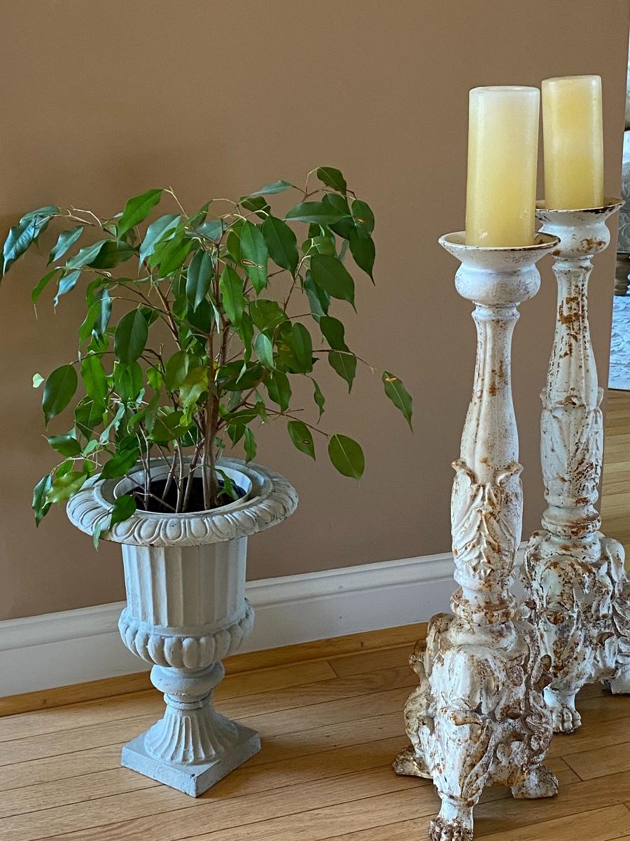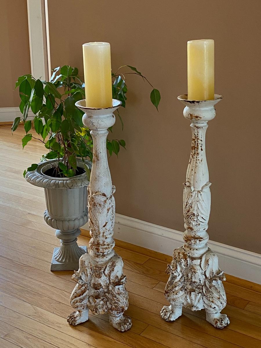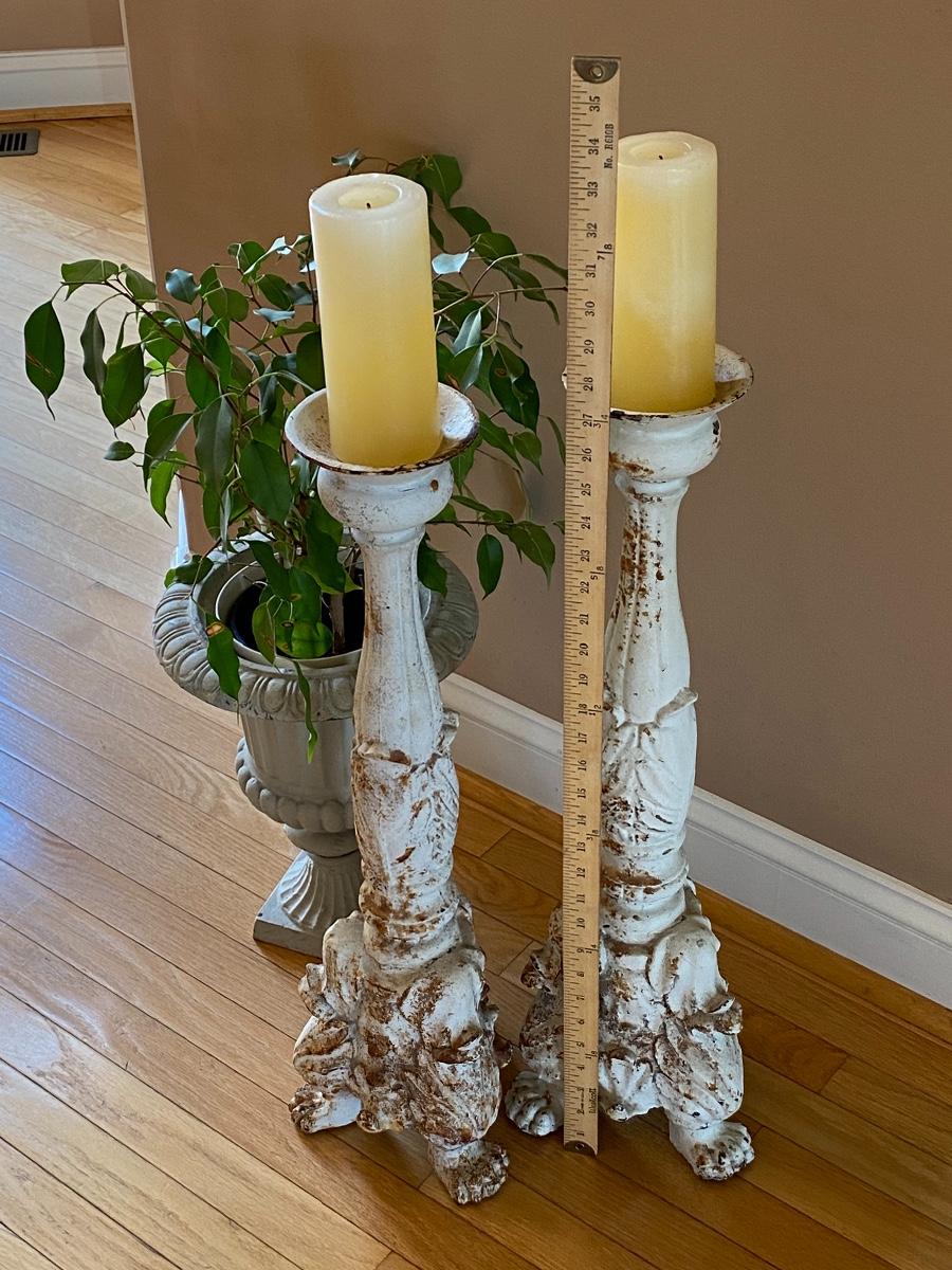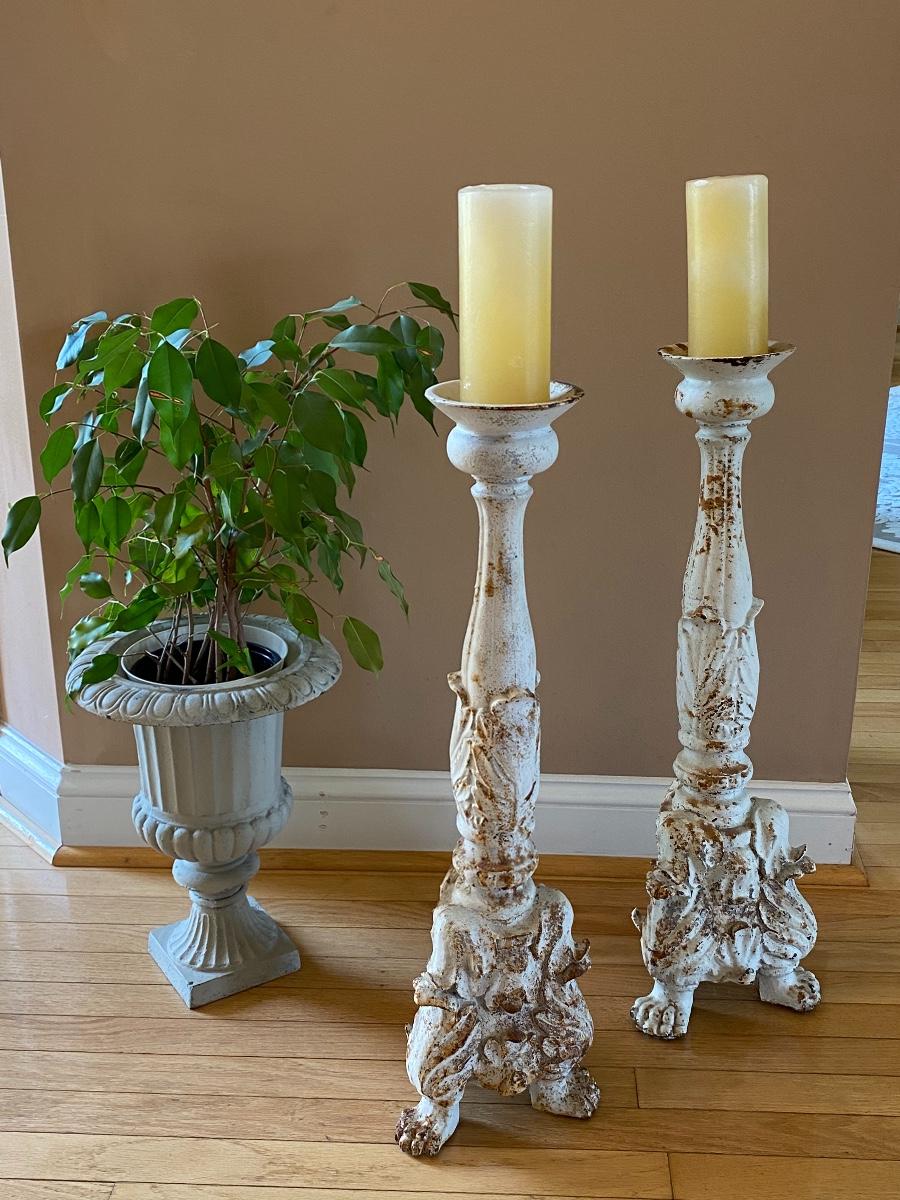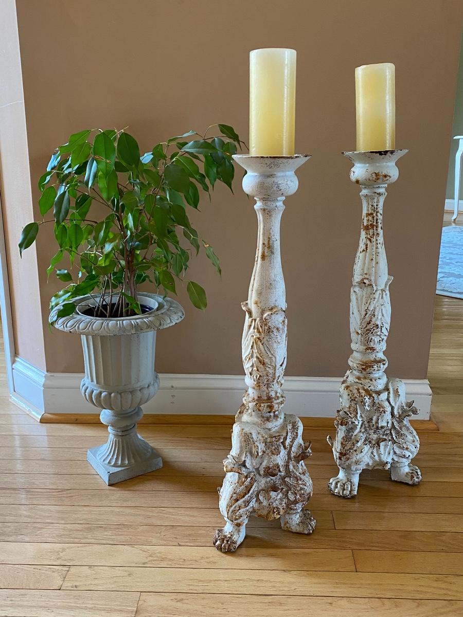 Two heavy, solid, metal candle holders and planter. Please see all pictures for content of the lot, condition of the lot, and measurements if taken. Pictures are the best representation of the items listed and items are untested unless indicated in description. Thank you for looking and have fun bidding!