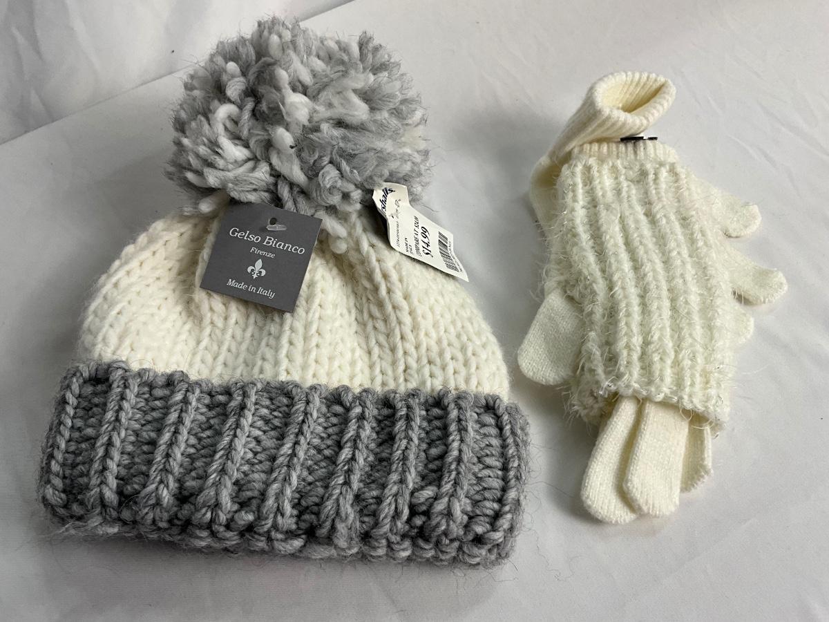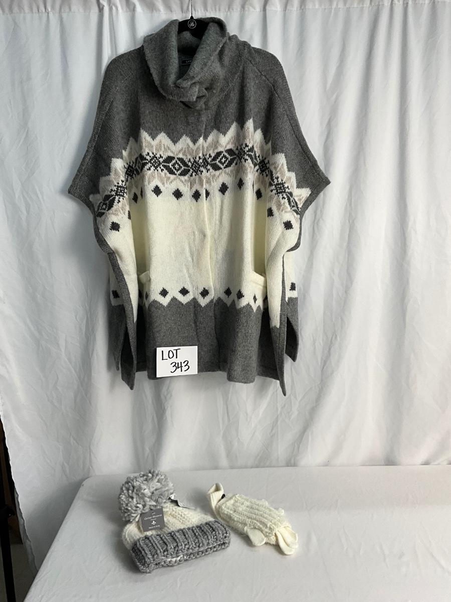 The sweater poncho is by Land’s End and sized as one size, also includes new knit hat with mittens and gloves.