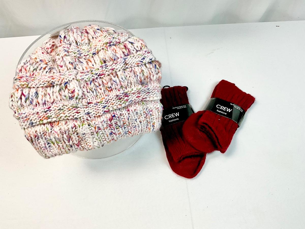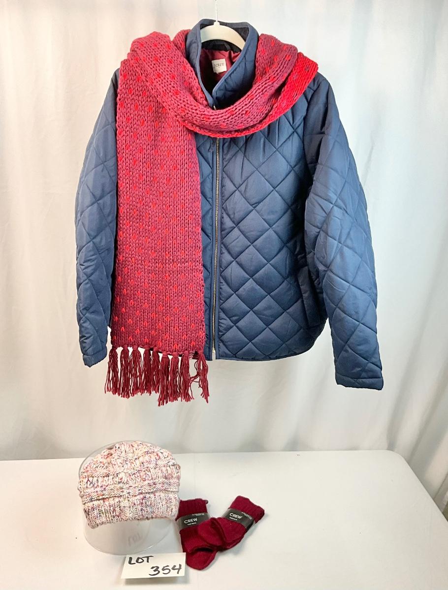 Lot M 354 J. Crew Quilted Jacket (size XL)/ Knit Scarf / J.Crew Socks / Hat
