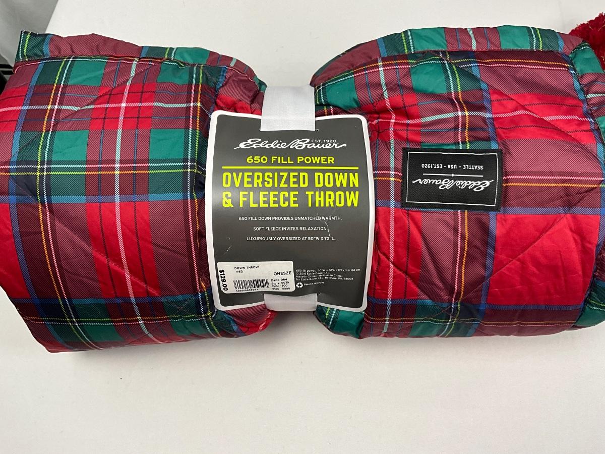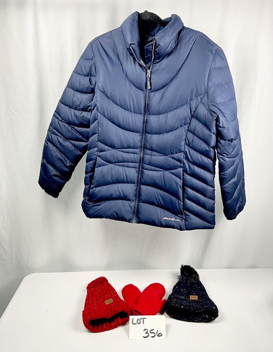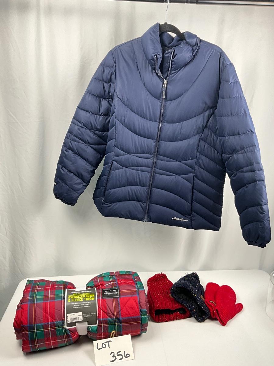 Lot M 356 Eddie Bauer Navy Puffer Jacket ( size XXL ) / Two Redness Beanies / Mittens / NWT Oversized Down& Fleece Throw