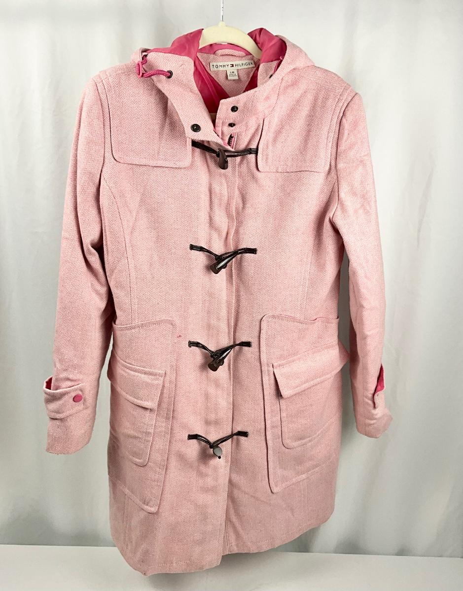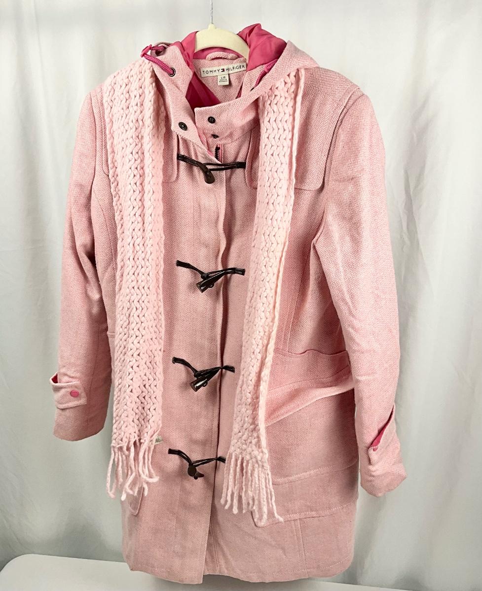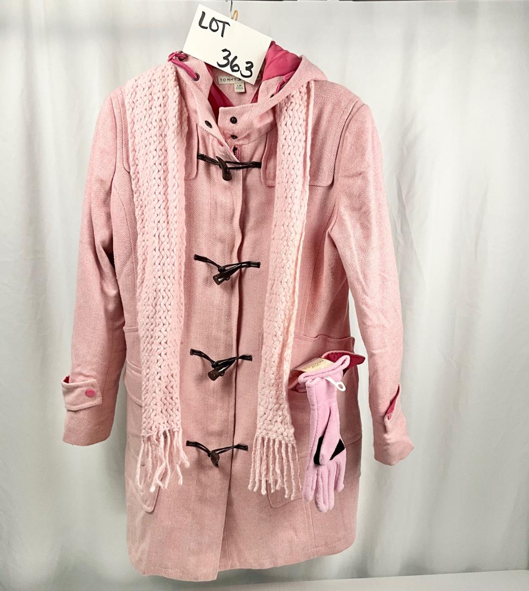 Lot M 363 Tommy Hilfiger Women’s Wool Blend Coat with Hood, Zip & Toggle Closures (size Lg ) / Knit Scarf & Gloves