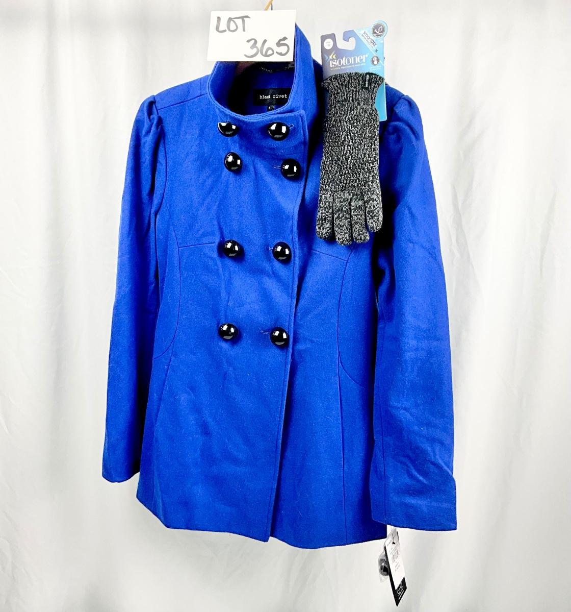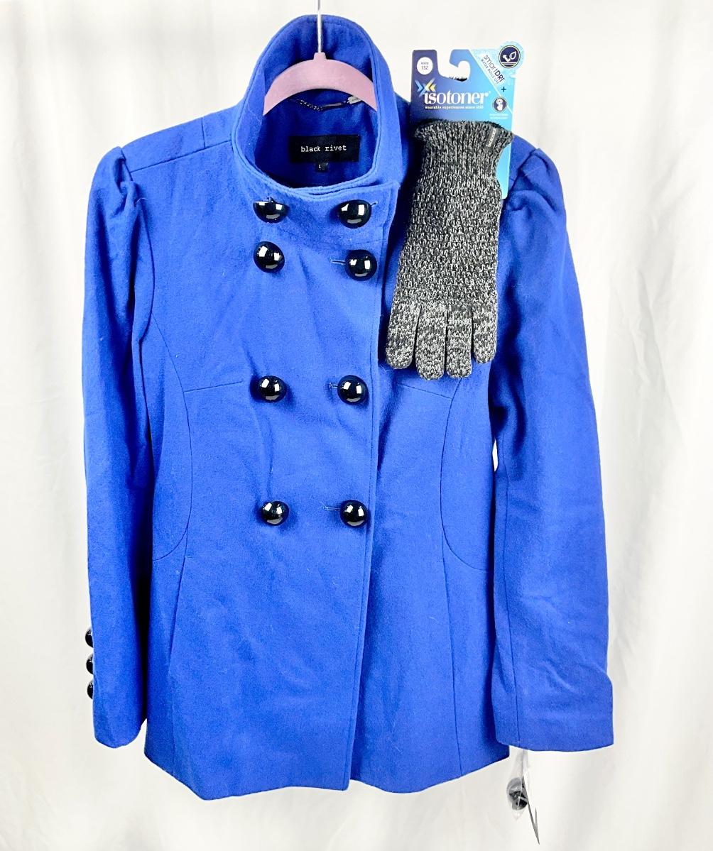 Lot M 365 NWT Black Rivet, Cobalt Blue Wool Blend Women’s Coat ( size LG)/ NWT Isotoner Gloves