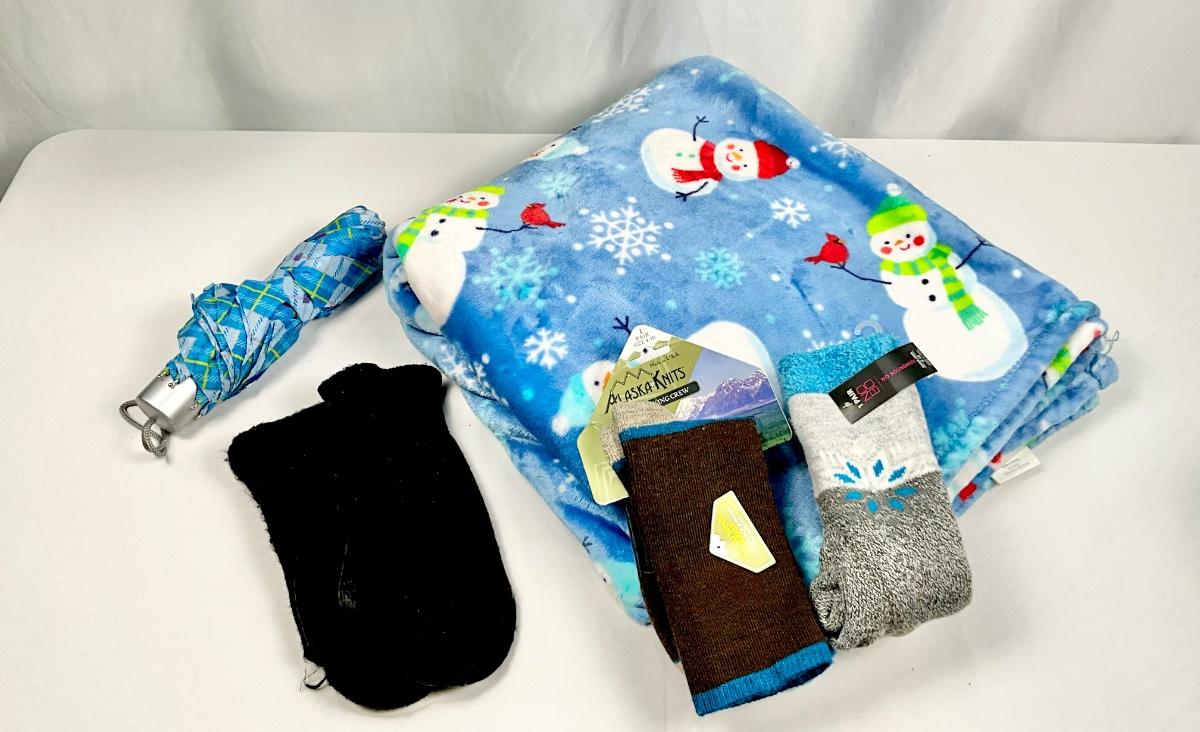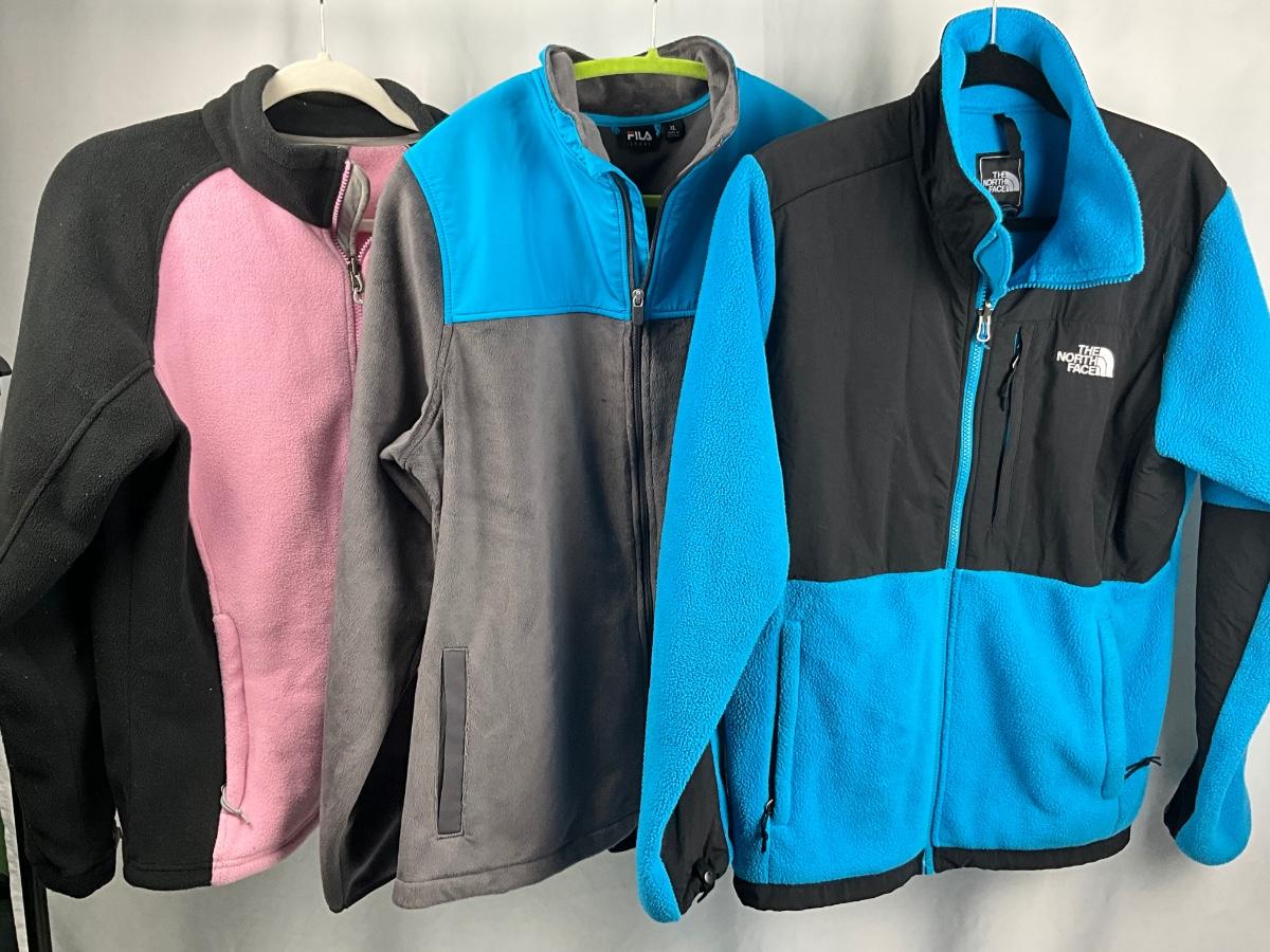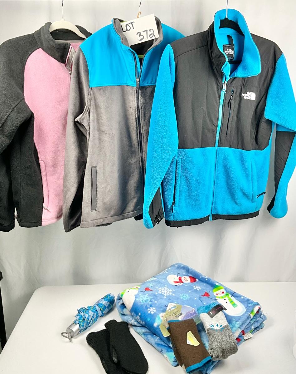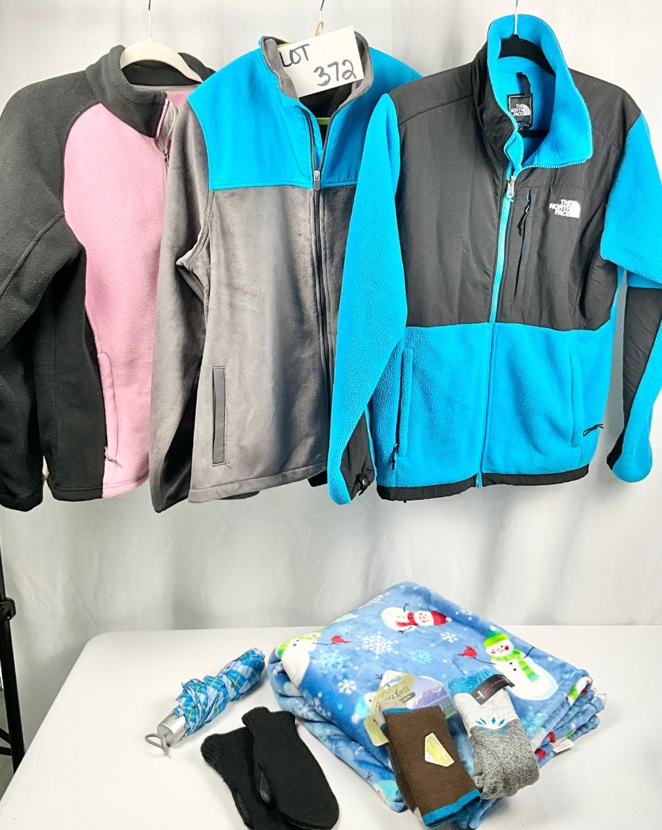 Lot M 372 Two North Face Fleece Jackets ( size XL ) / One Fila Fleece Jacket (size Lg) / Plush Throw / Mittens / Umbrella