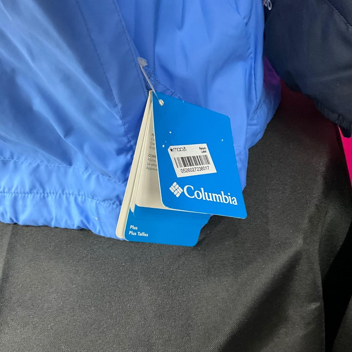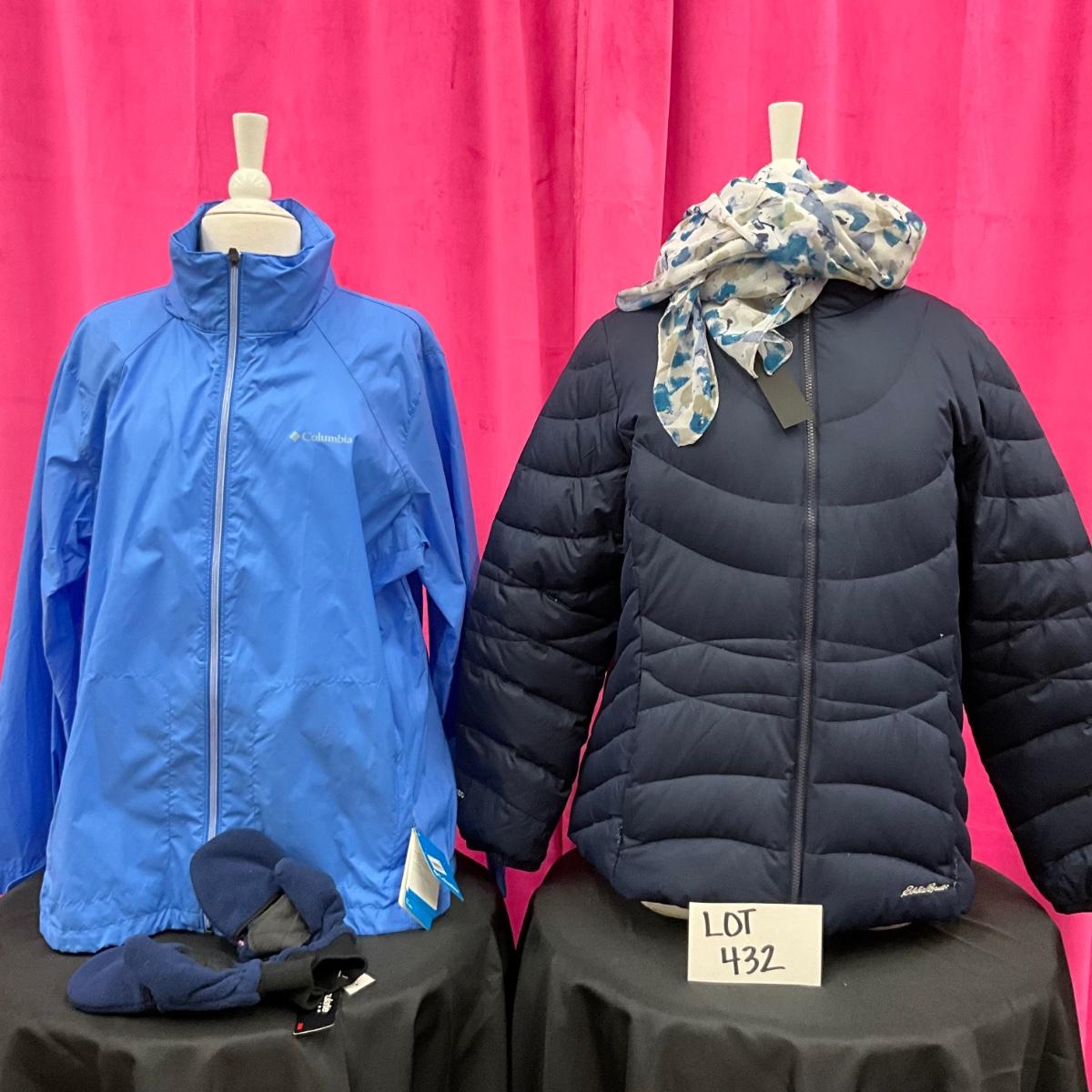 The Columbia rain coat is brand new with tags. There is an Eddie Bauer winter coat. Both coats are XXL and the lot contains fleece mittens and a scarf. Most of the items are brand new with tags.