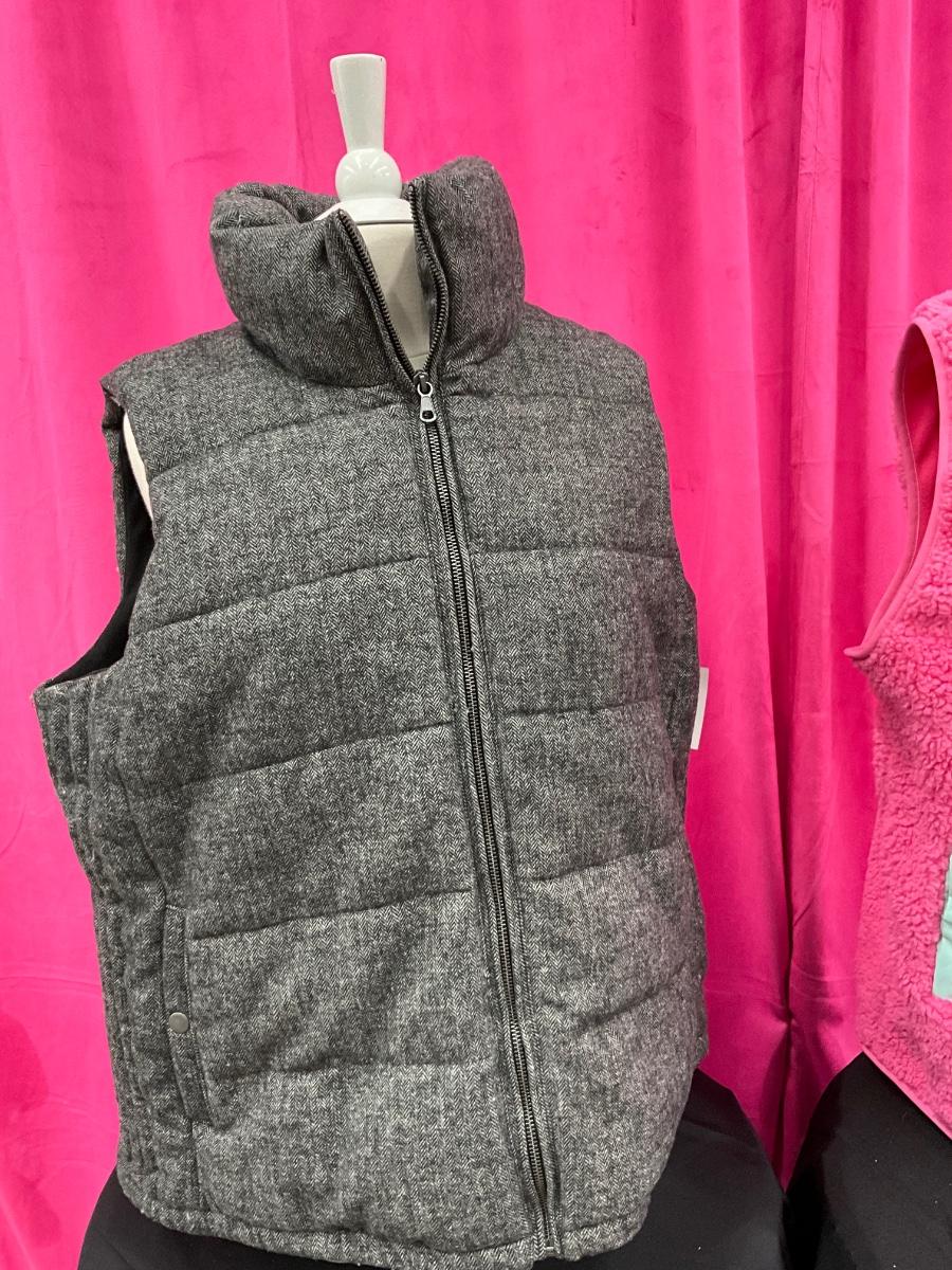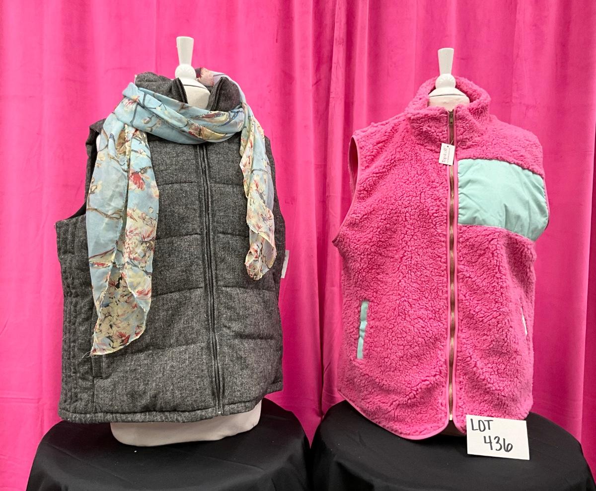 The lot contains a pink fleece by Top It Off brand new with tags (XXL) a grey puffer vest by Old Navy (XXL) and a floral scarf.