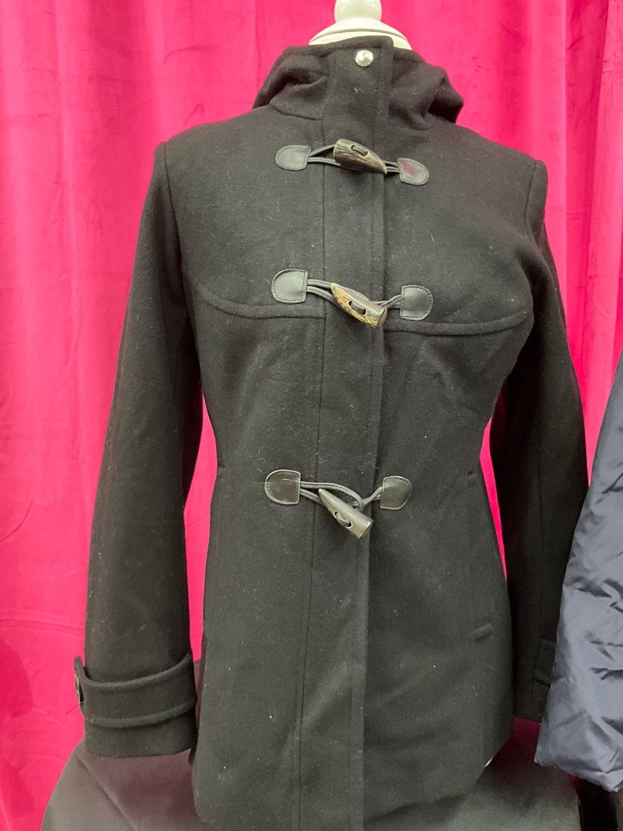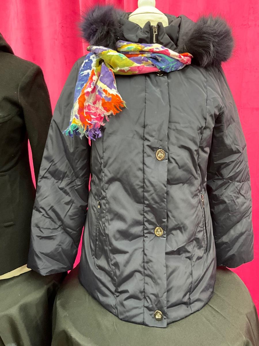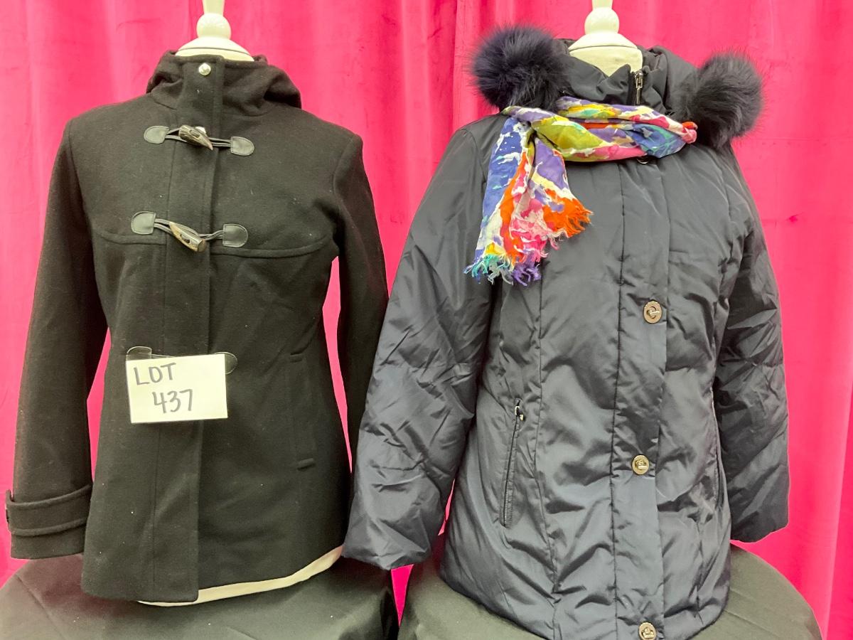 The lot contains a black Michael KORS peacoat (Sz 8) a navy puffer winter coat with fur trim hood (medium) and a colorful scarf.