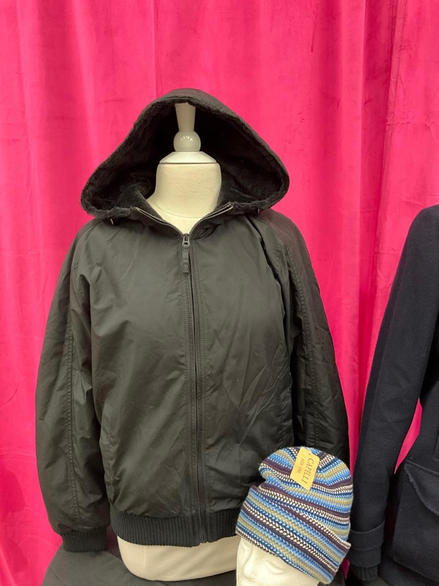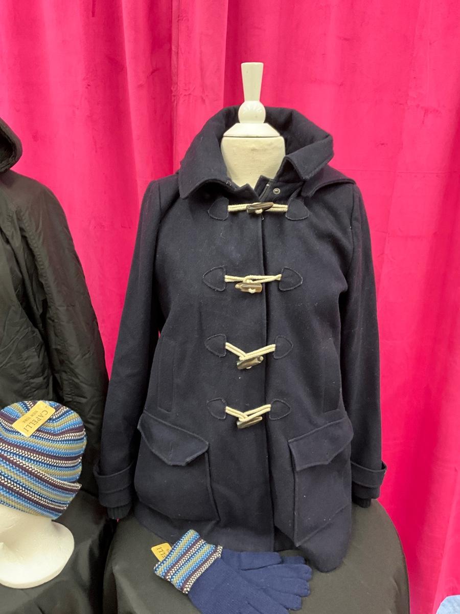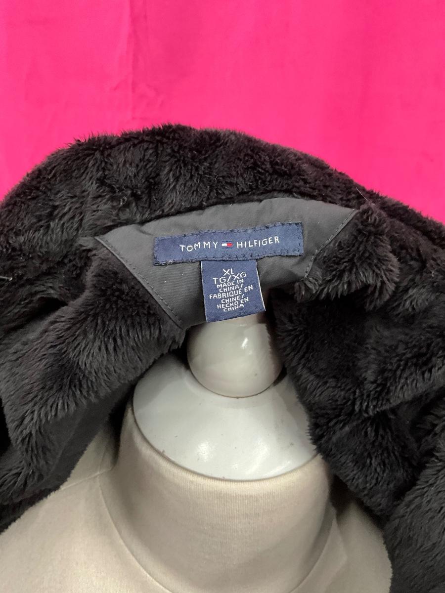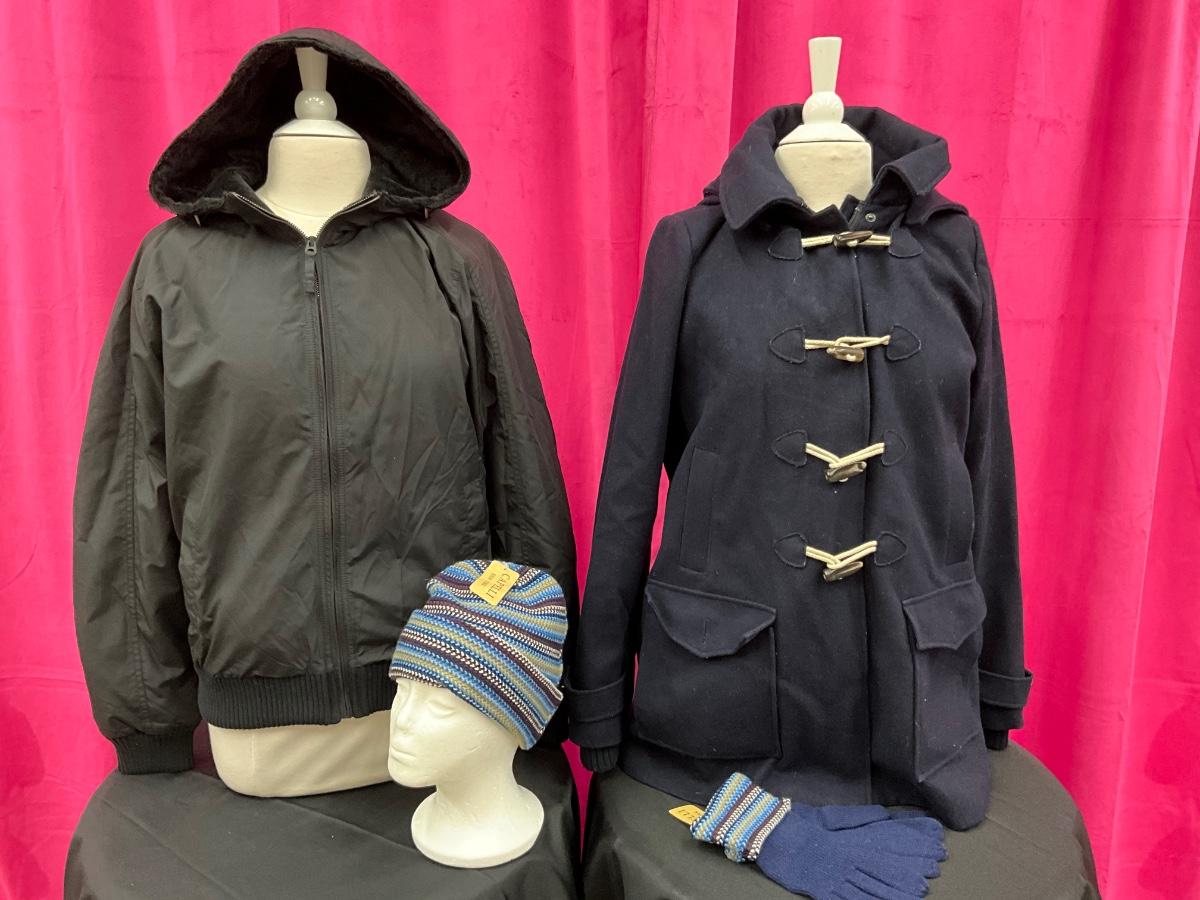 The jackets are both a size XL and by Tommy Hilfiger. There is a navy peacoat with toggle buttons, a black bomber stolen jacket, and a matching hat and glove set by Capelli. Some of the items are new with tags.