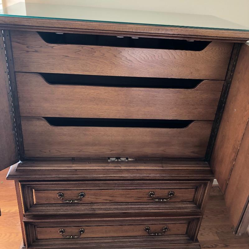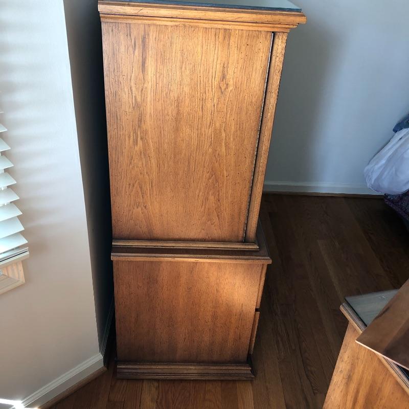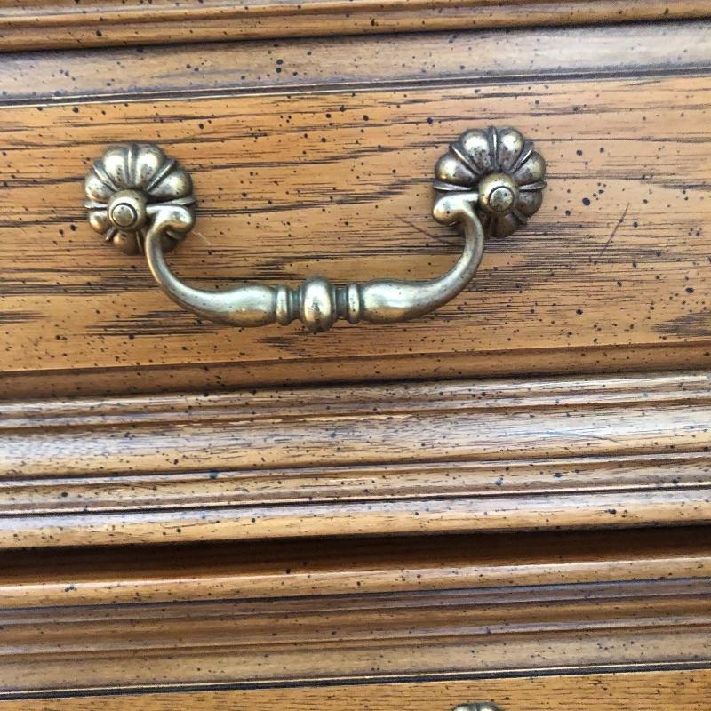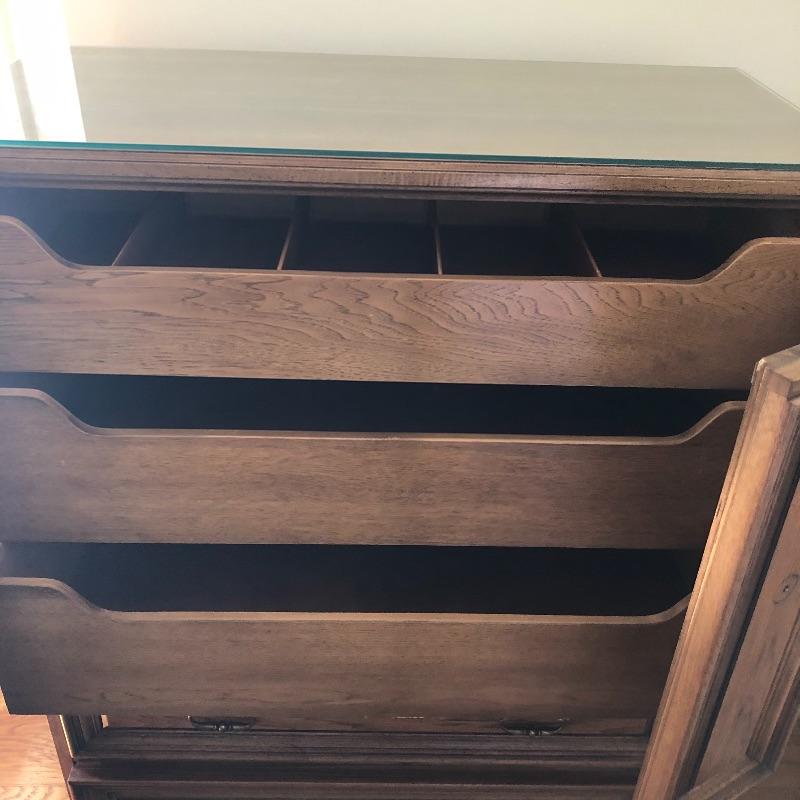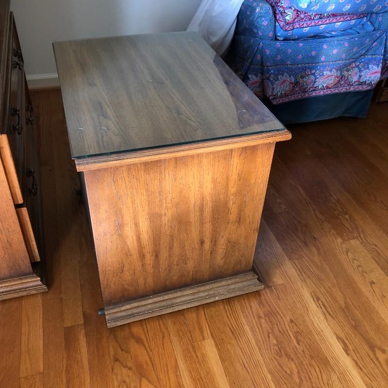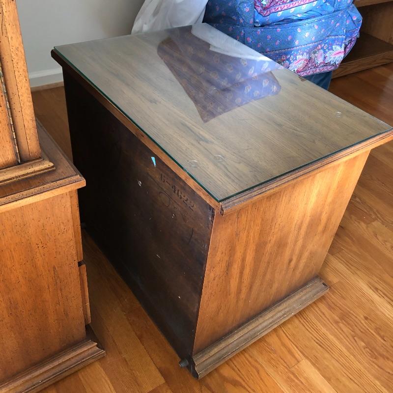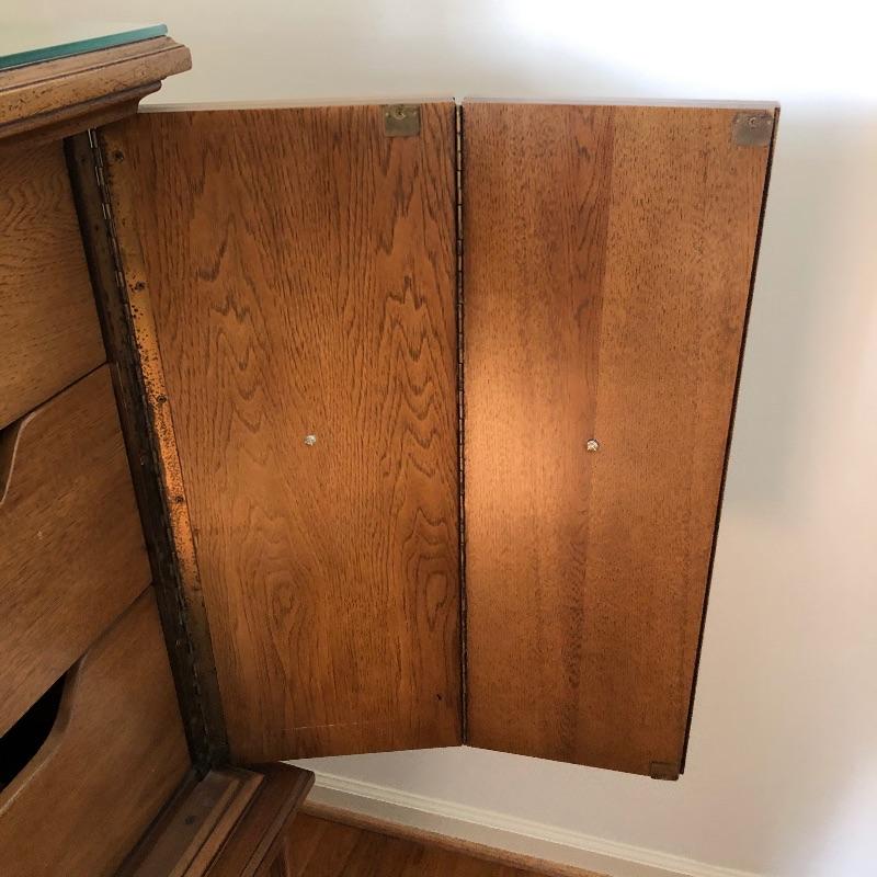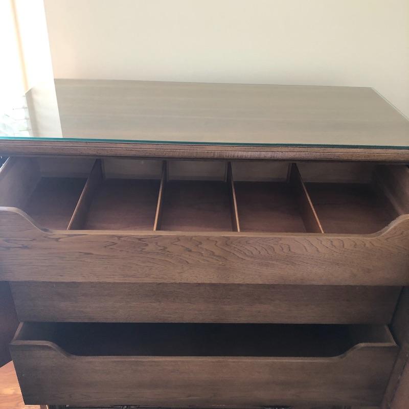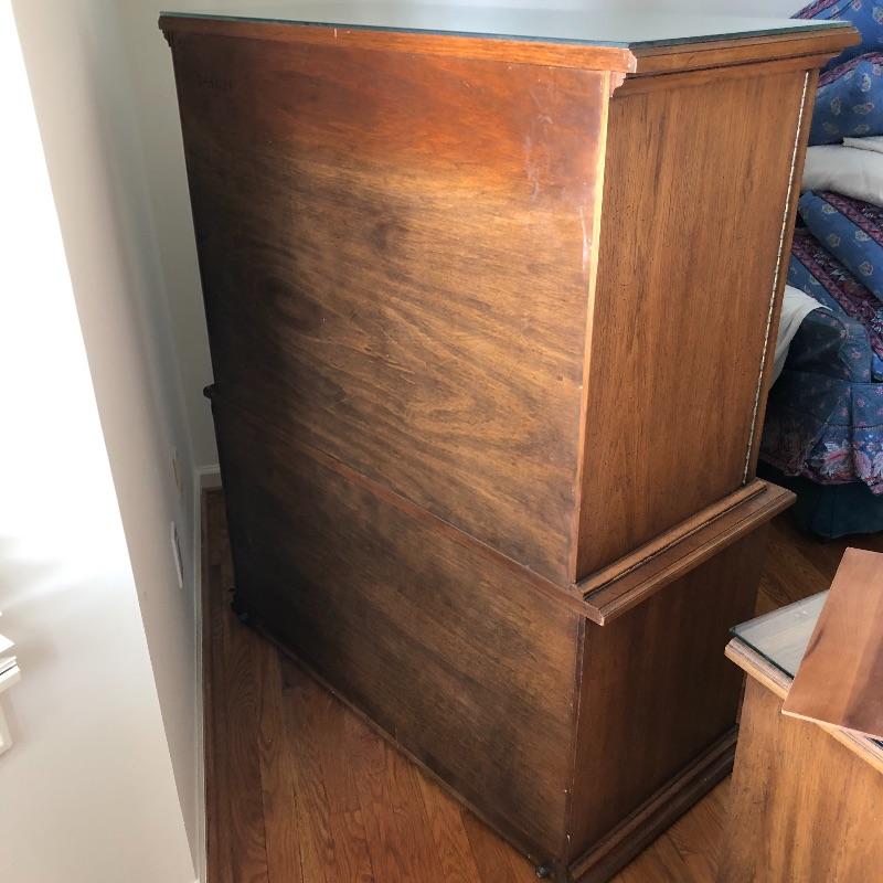 This tall dresser is a perfect unit for storing all your smalls and more! It even comes on rollers (we were unable to photograph the wheels). The top section has three cleverly concealed drawers behind the hinged concertina doors. The top drawer has compartments. The lower half of the unit has two large dovetailed drawers. The matching side table has two dovetailed drawers. Both units are in excellent condition with aged brass hardware and they both come with glass tops that have preserved the surfaces. Matching headboard in Lot 24. They don't make them like this anymore! a refinished look could be a fun project and something to last a lifetime.