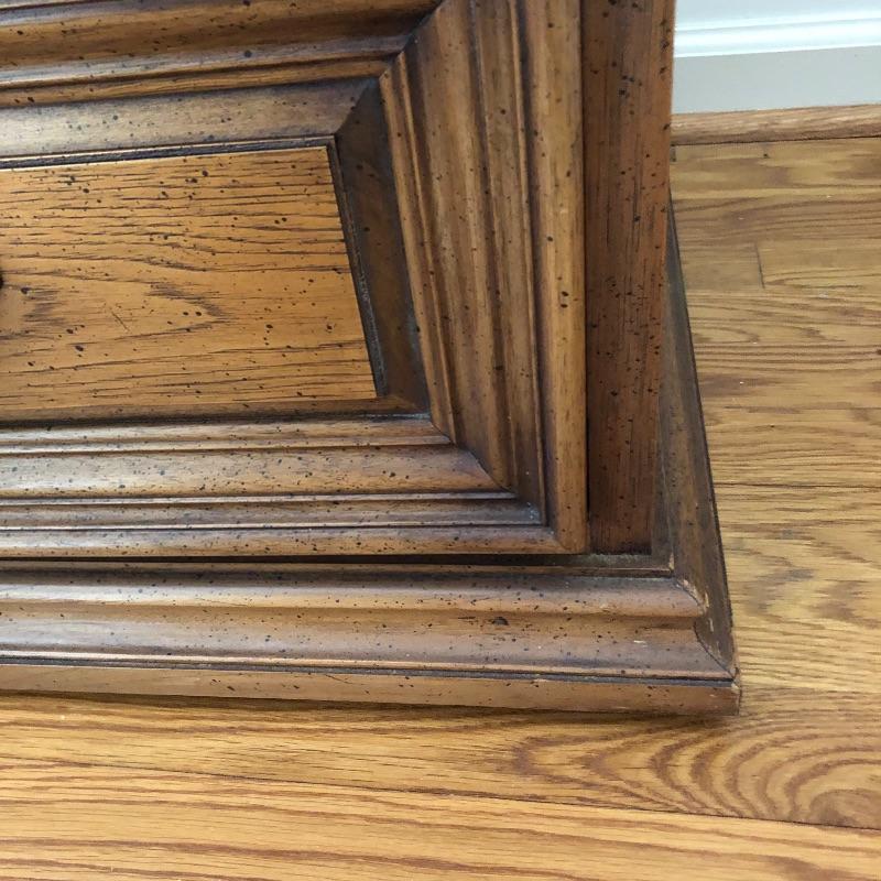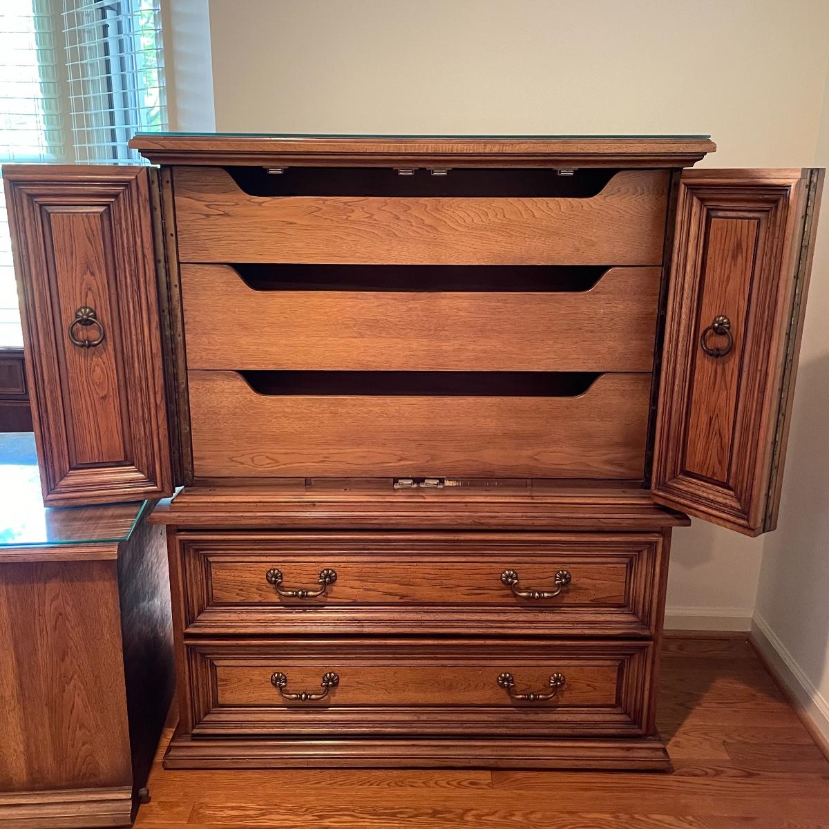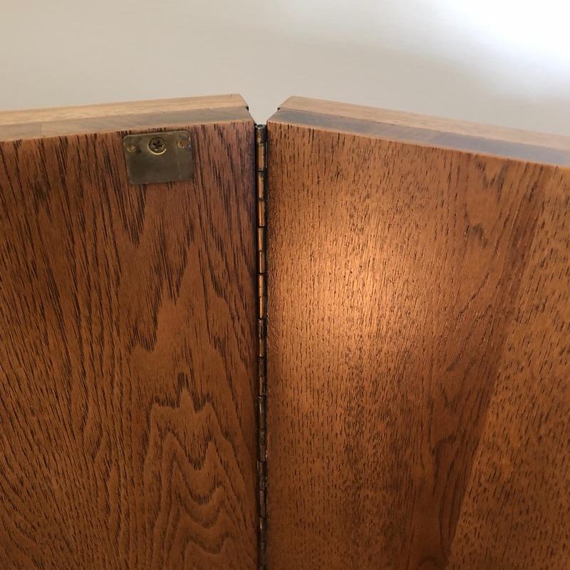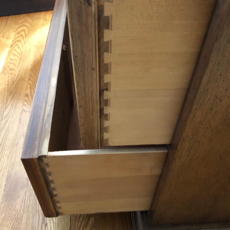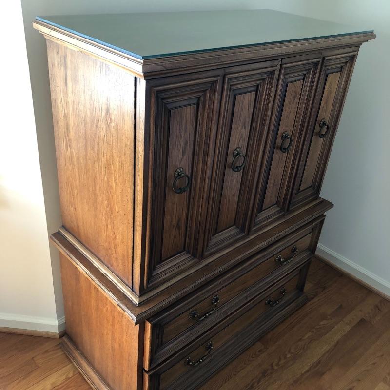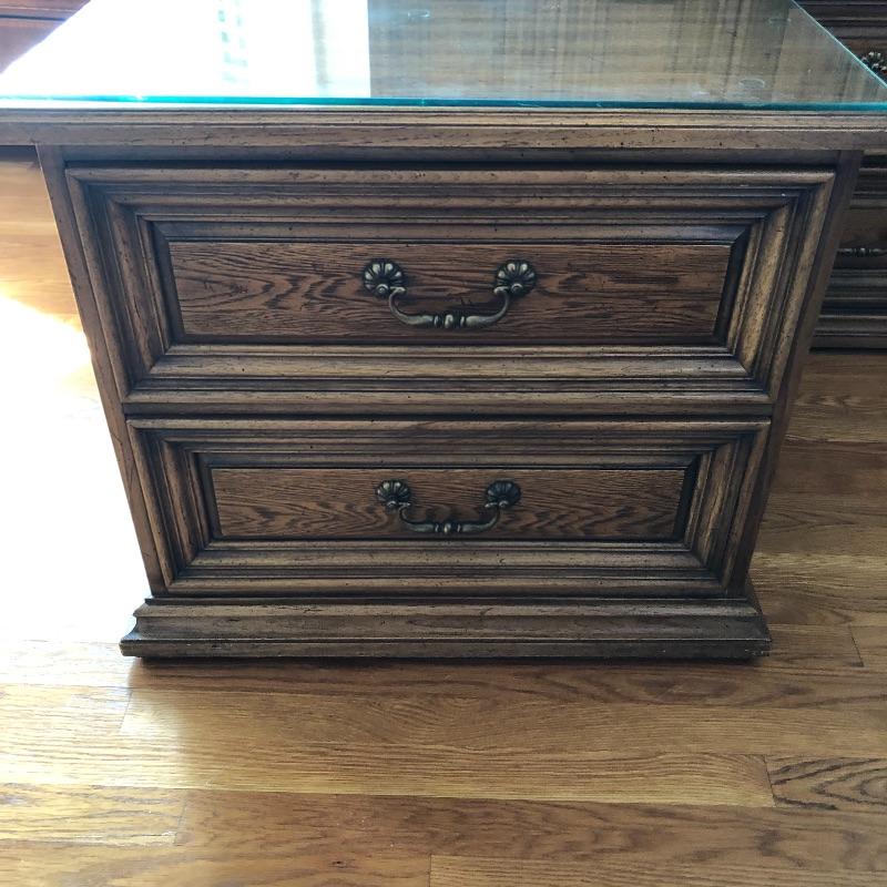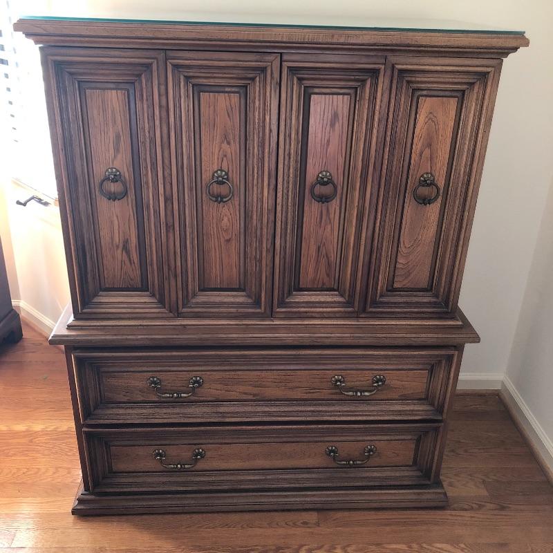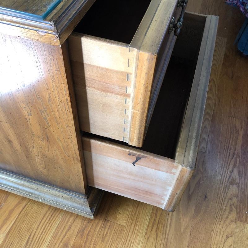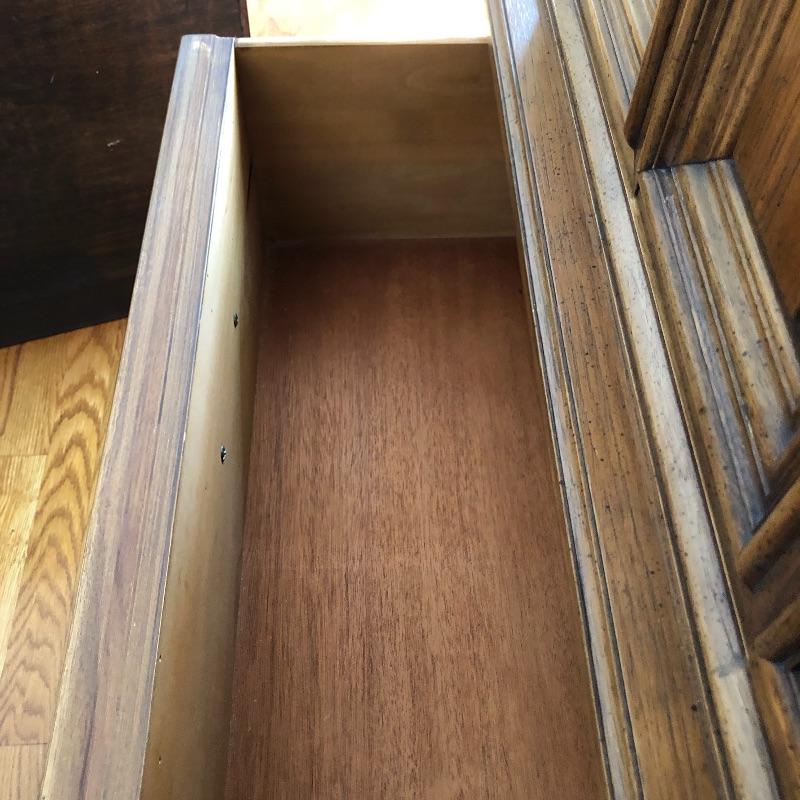 This tall dresser is a perfect unit for storing all your smalls and more! It even comes on rollers (we were unable to photograph the wheels). The top section has three cleverly concealed drawers behind the hinged concertina doors. The top drawer has compartments. The lower half of the unit has two large dovetailed drawers. The matching side table has two dovetailed drawers. Both units are in excellent condition with aged brass hardware and they both come with glass tops that have preserved the surfaces. Matching headboard in Lot 24. They don't make them like this anymore! a refinished look could be a fun project and something to last a lifetime.