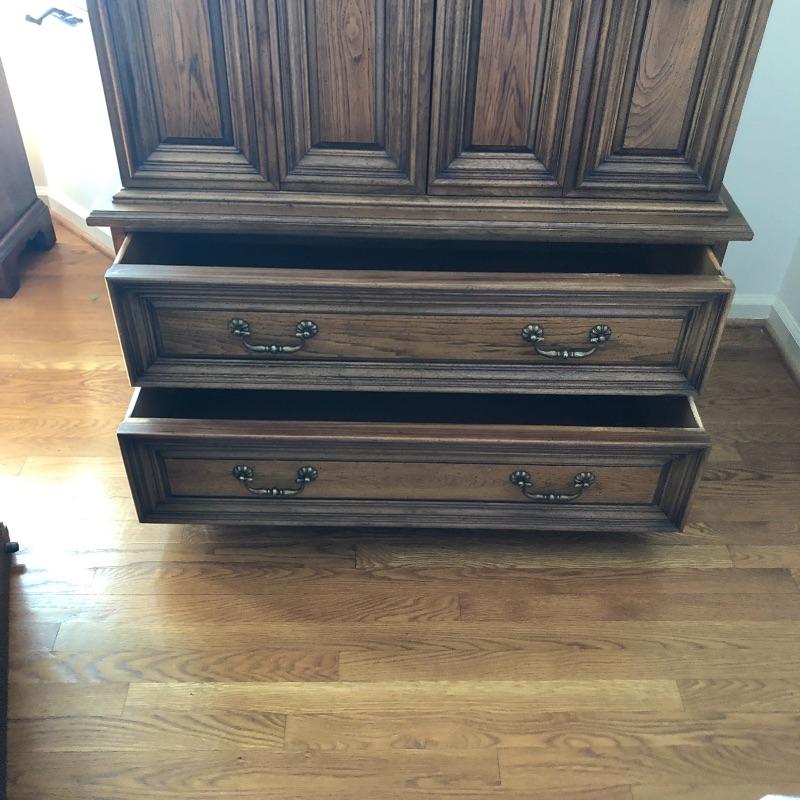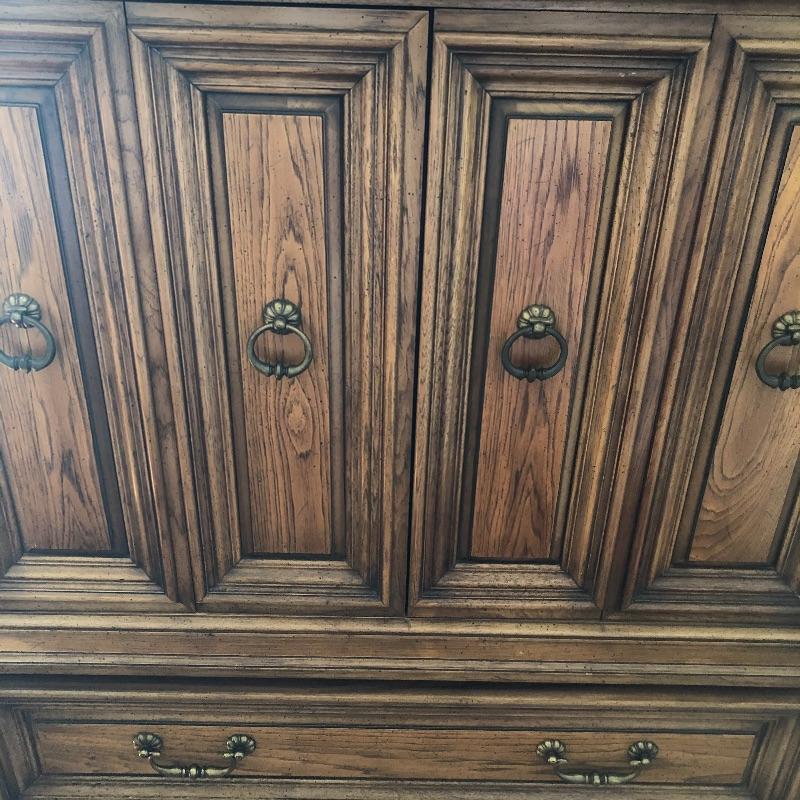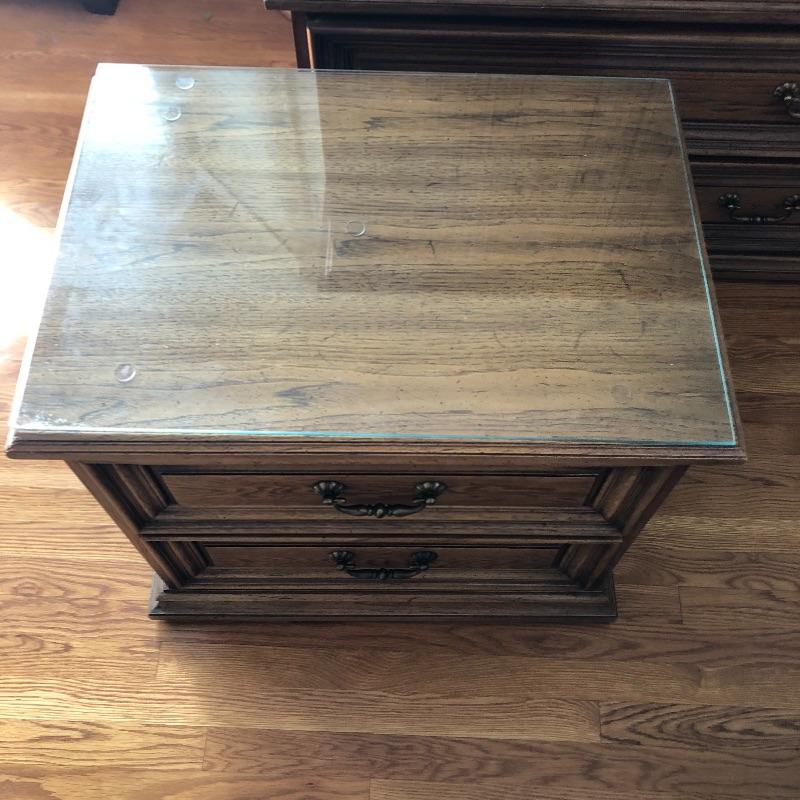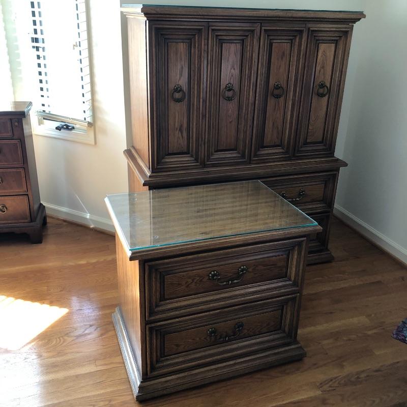 Dresser measures 19” deep x 40” wide x 51” tall. The table measures 19” deep x 27” wide x 24” tall.