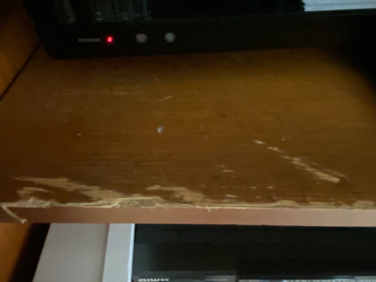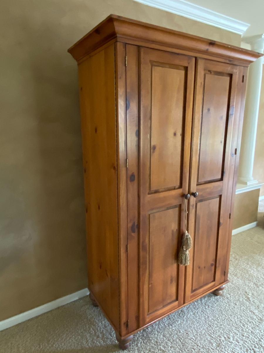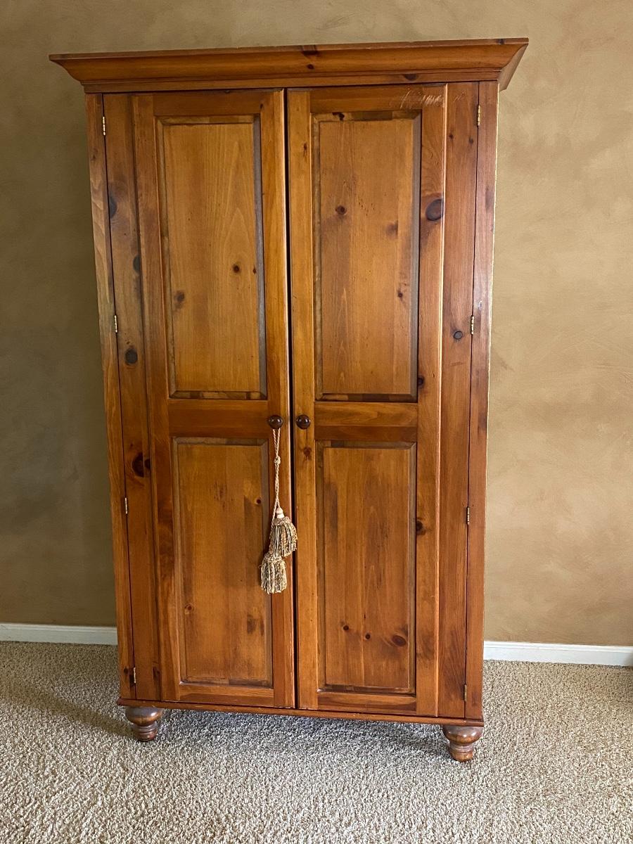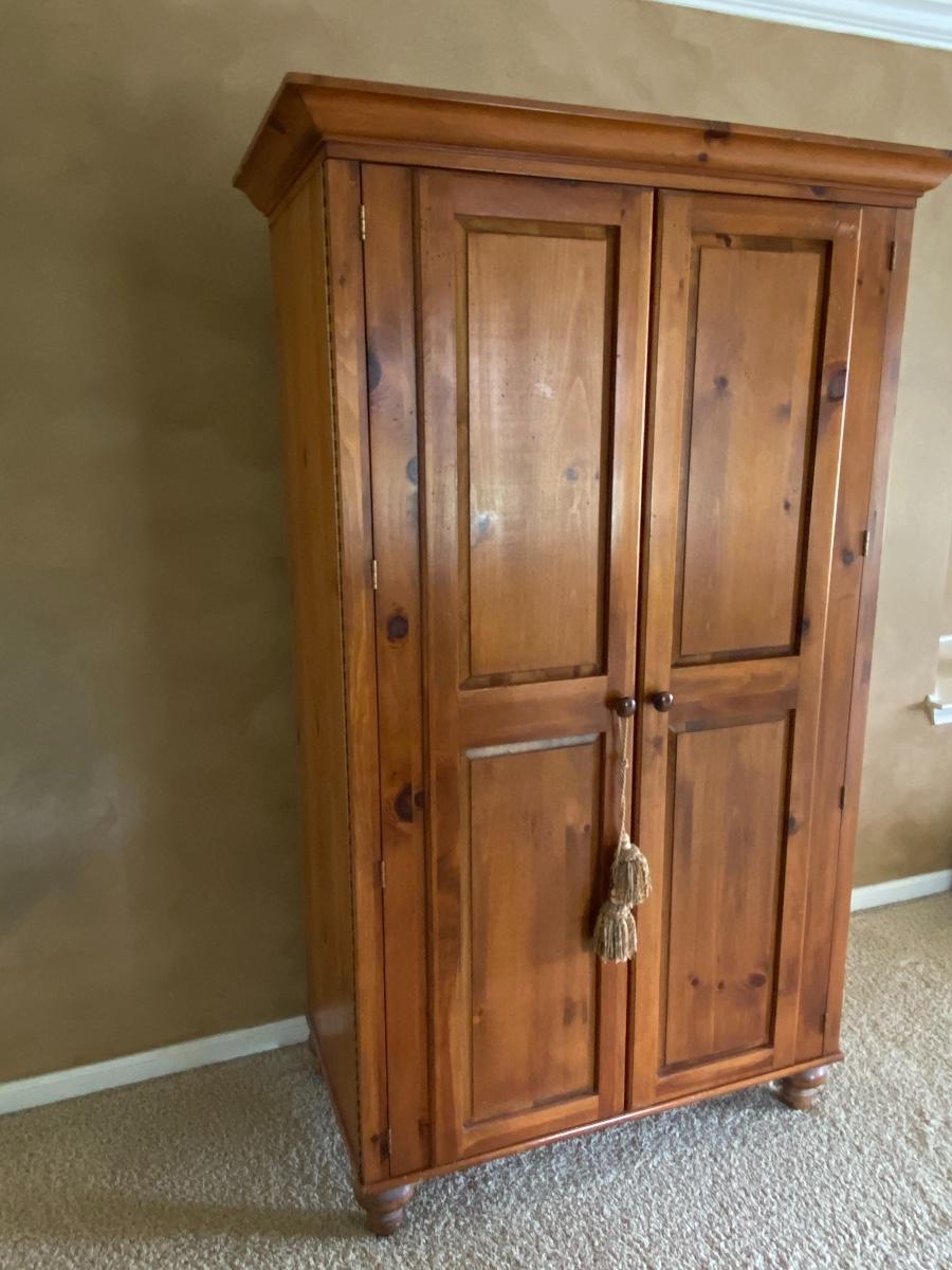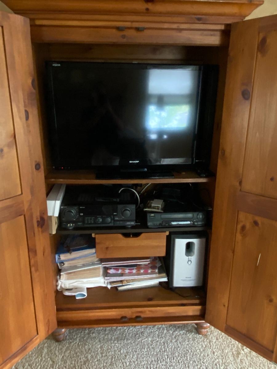 Wood media cabinet. Contents inside cabinet are not included in sale and will be removed prior to pick up.