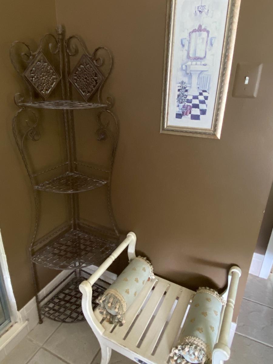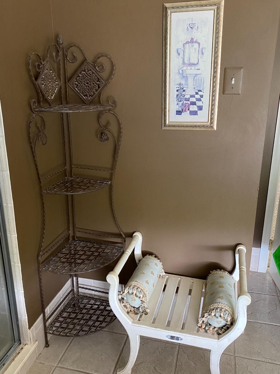 Lot MB151: Metal Tiered Corner Shelf and Wood Accent Bench