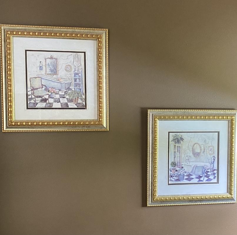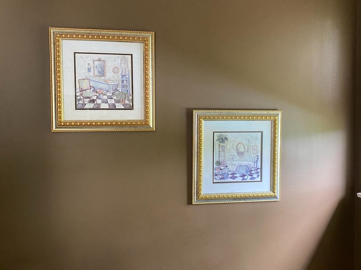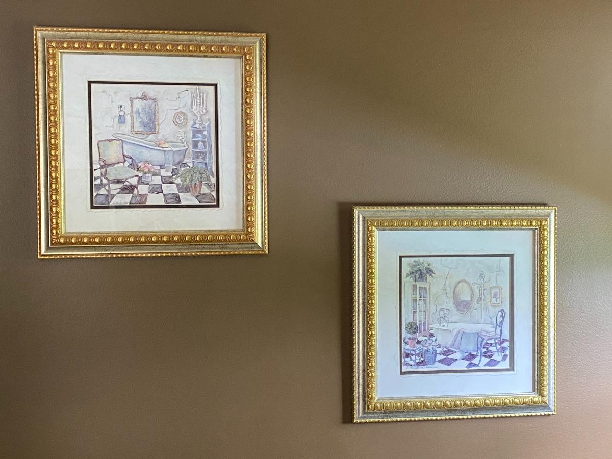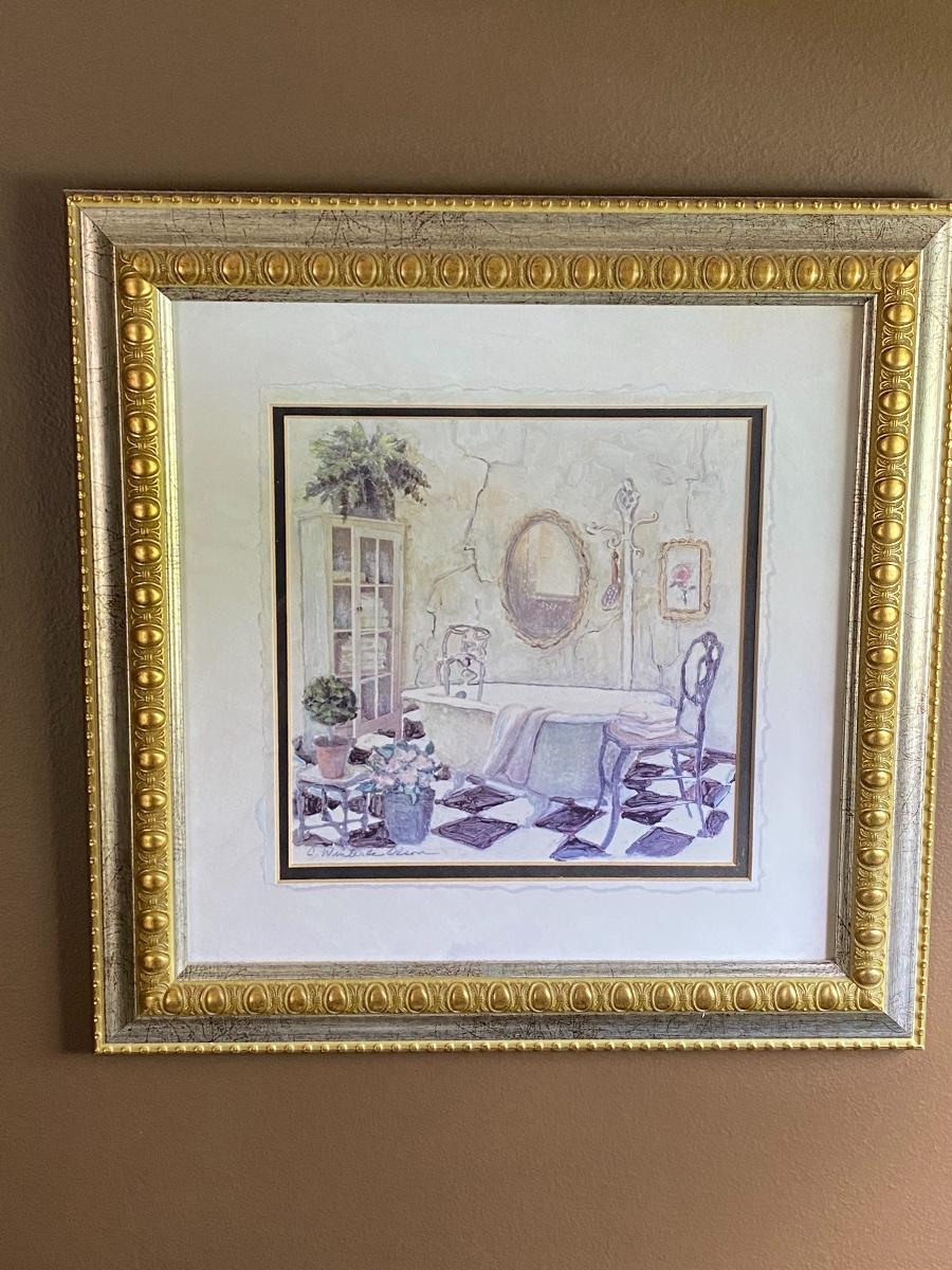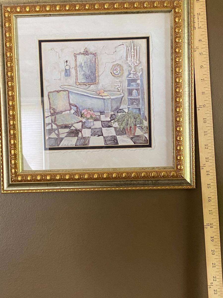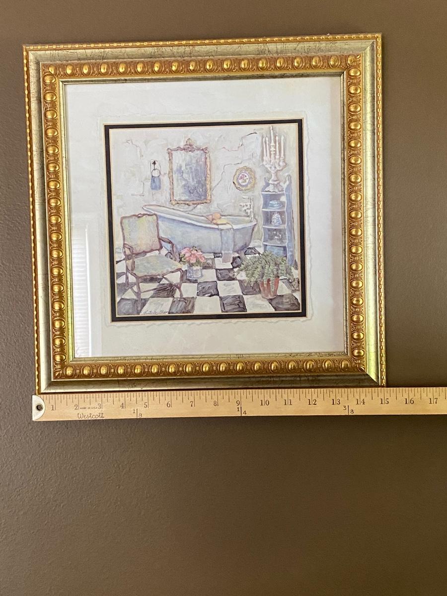 Two framed bathroom prints 15x15. Please see all pictures for content of the lot, condition of the lot, and measurements if taken. Pictures are the best representation of the items listed and items are untested unless indicated in description. Thank you for looking and have fun bidding!