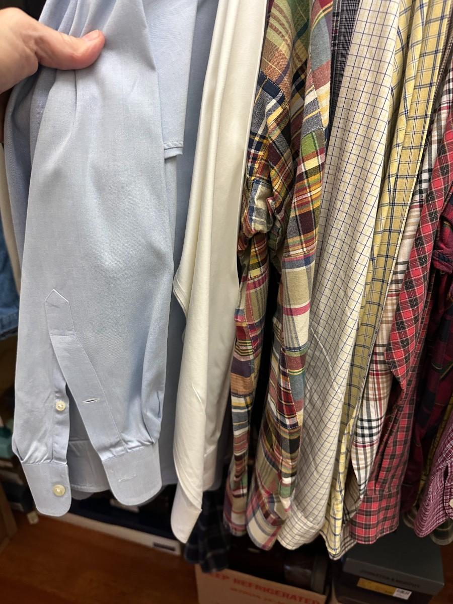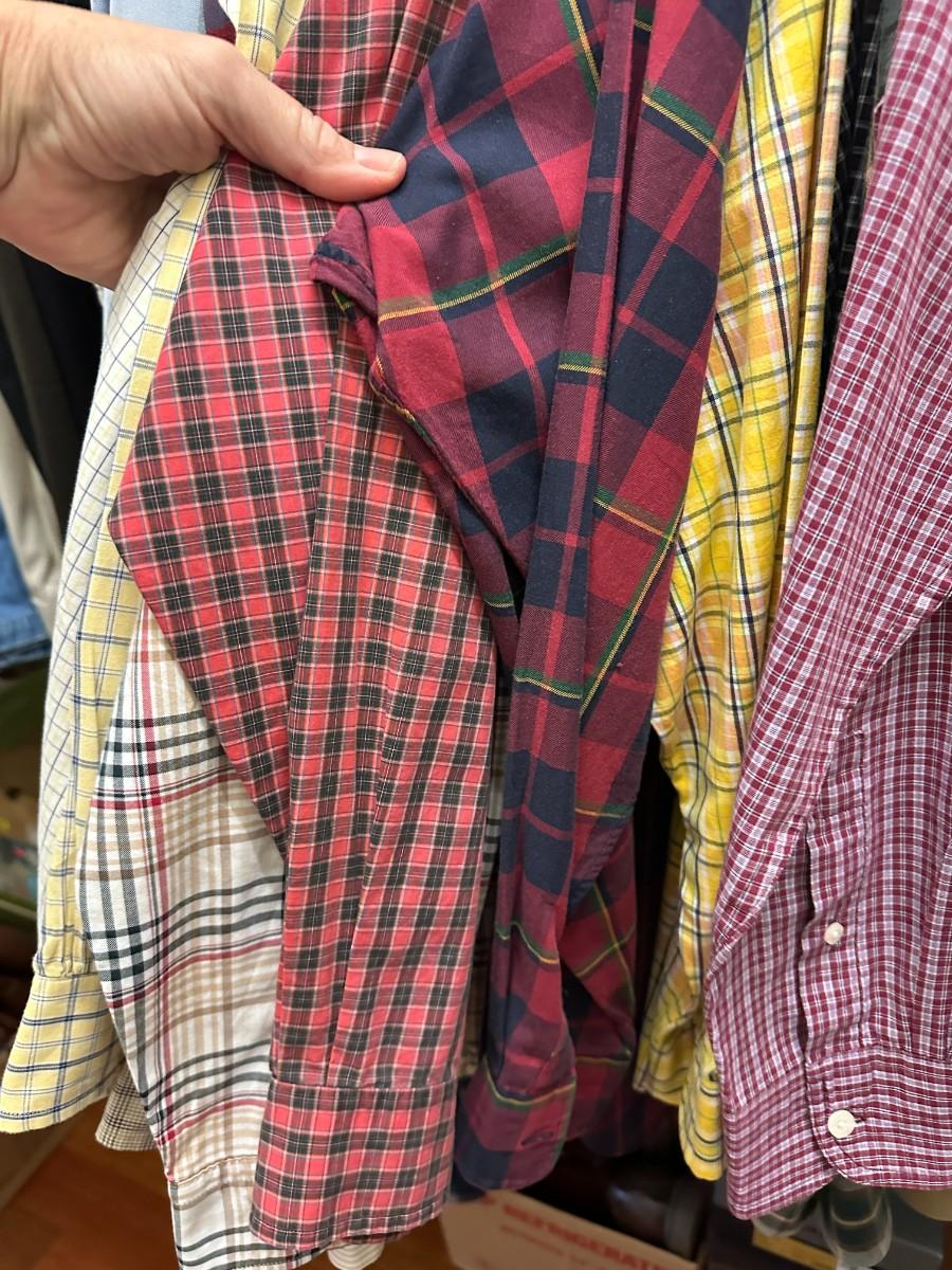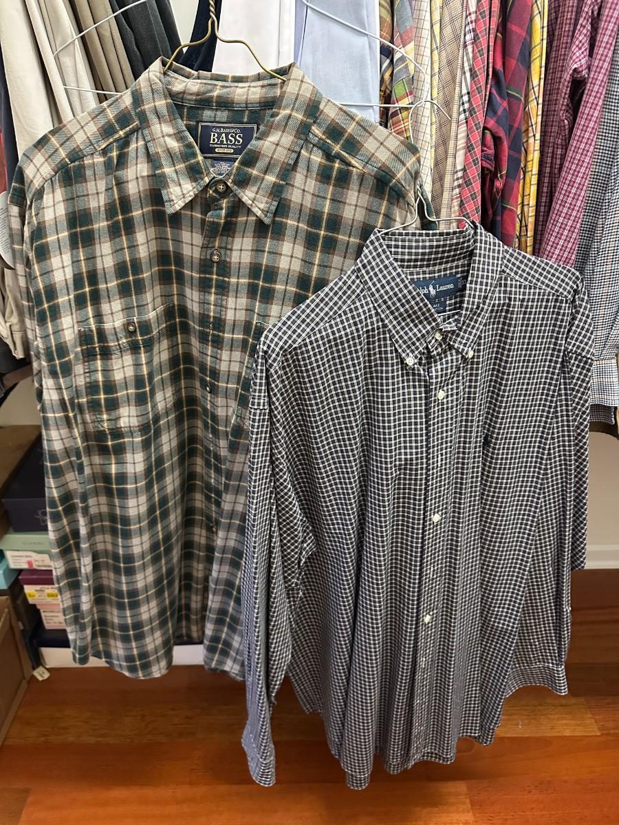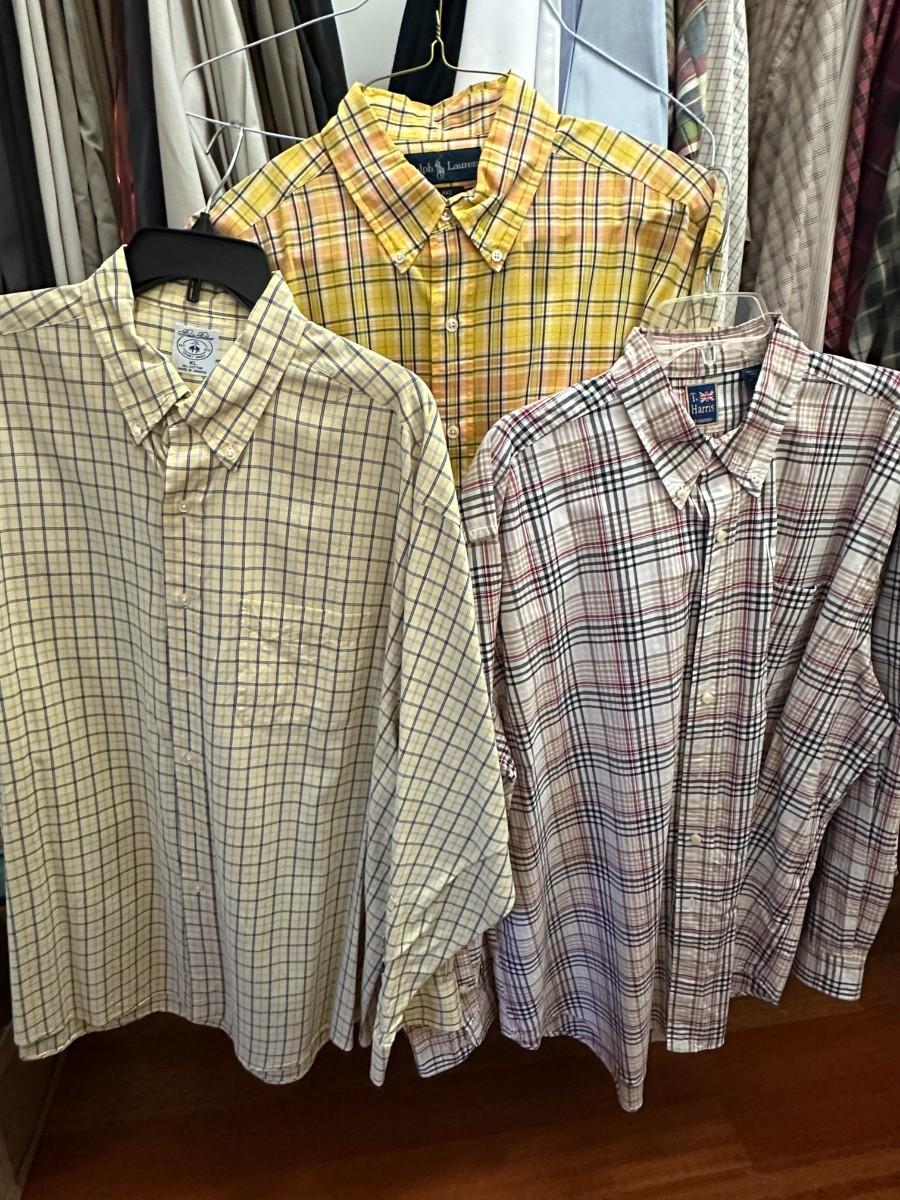 33 Piece Lot Men's Long Sleeve Button Down Plaid and Dress Shirts L & XL Some brands include Chaps, Ralph Lauren (many), Bass, T. Harris, Brooks Brothers, Lands End, Jos.a.Bank. Also includes 2 vests, 1 robe and a random short sleeve shirt!