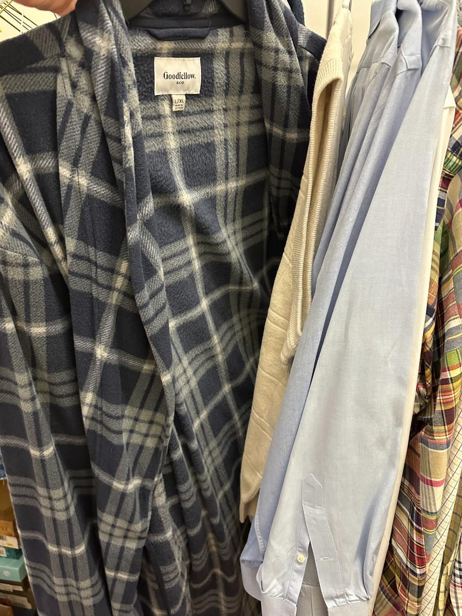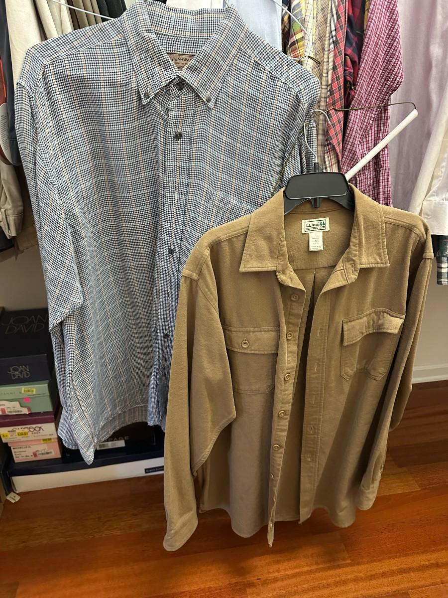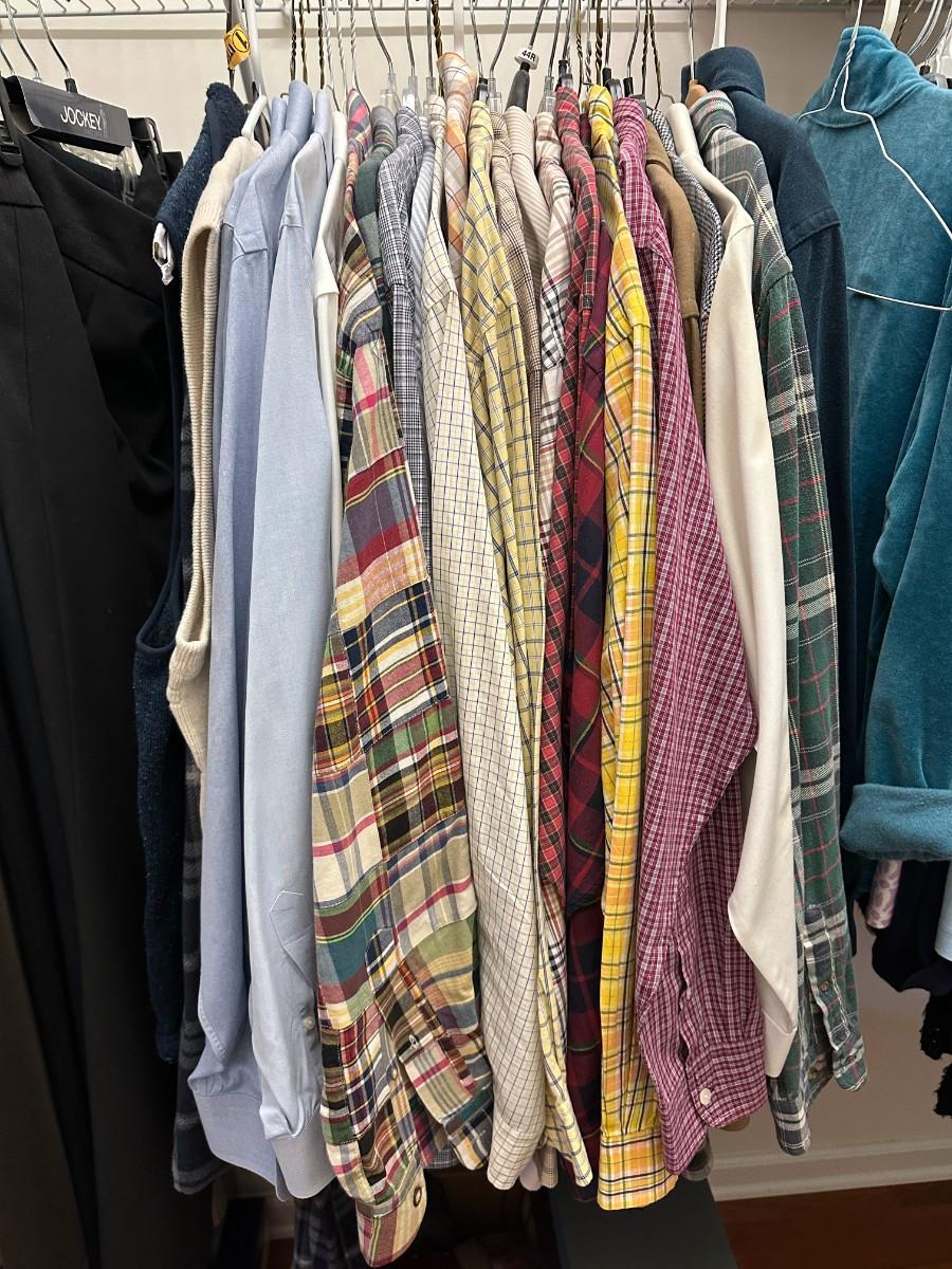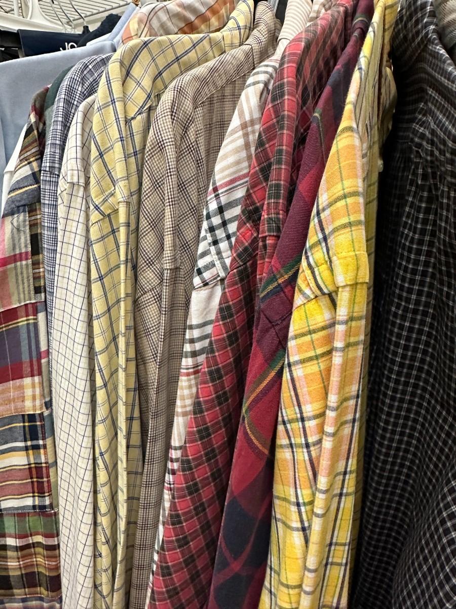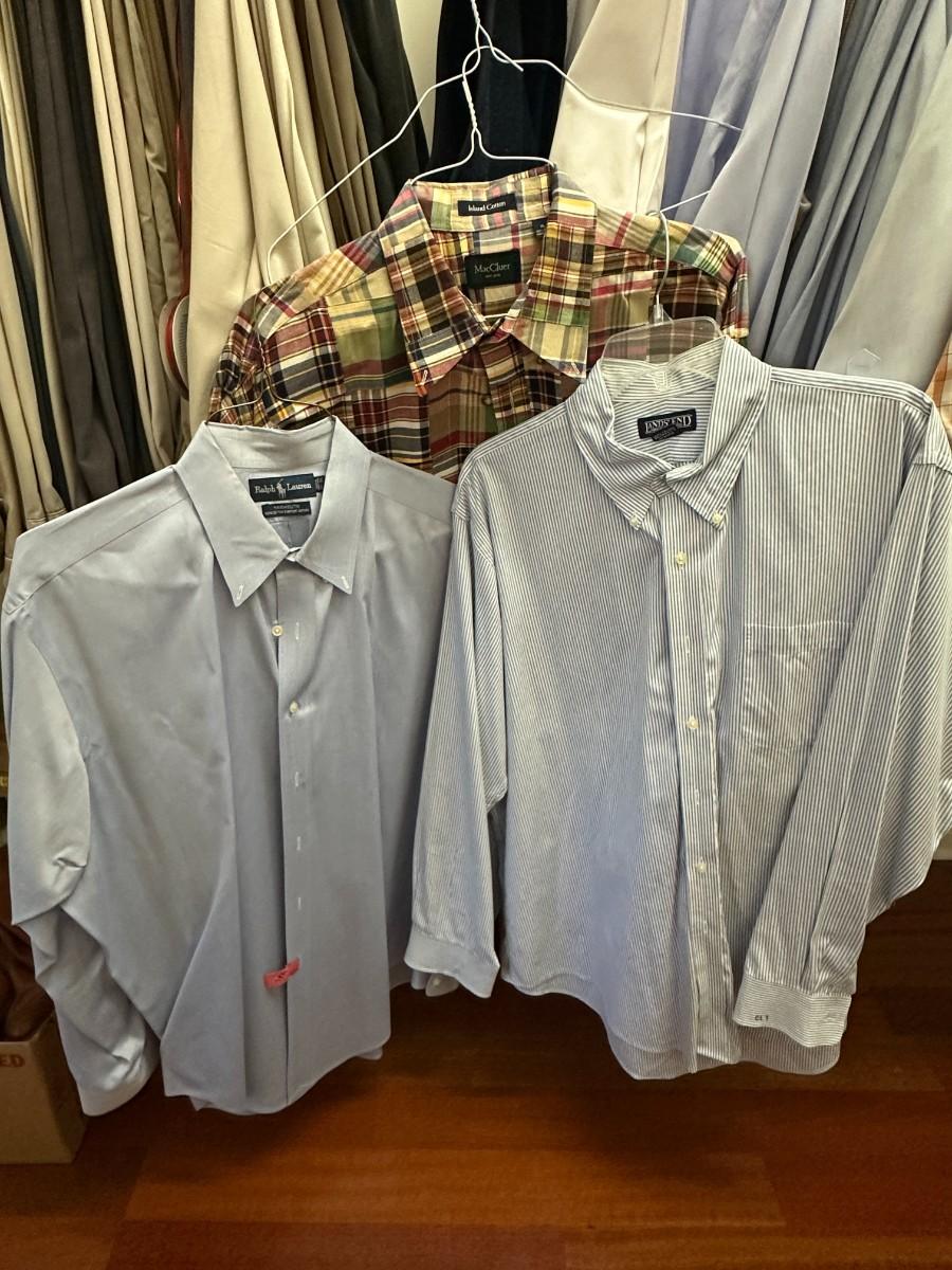 33 Piece Lot Men's Long Sleeve Button Down Plaid and Dress Shirts L & XL Some brands include Chaps, Ralph Lauren (many), Bass, T. Harris, Brooks Brothers, Lands End, Jos.a.Bank. Also includes 2 vests, 1 robe and a random short sleeve shirt!
