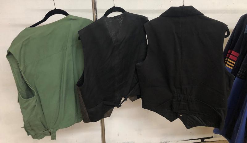 Here are three(3) men's vests...Western wear and a fishing vest..Two .Medium and one small...Expeditions Fishing Vest(M)...Branding Iron brand(M)...Powder River Outfitters(S)..Light use..