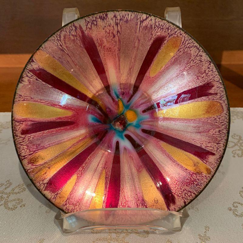 Arty burst of colors radiate from the center outward to form a striking design. Solid blue back. Signed Sherry Schrut