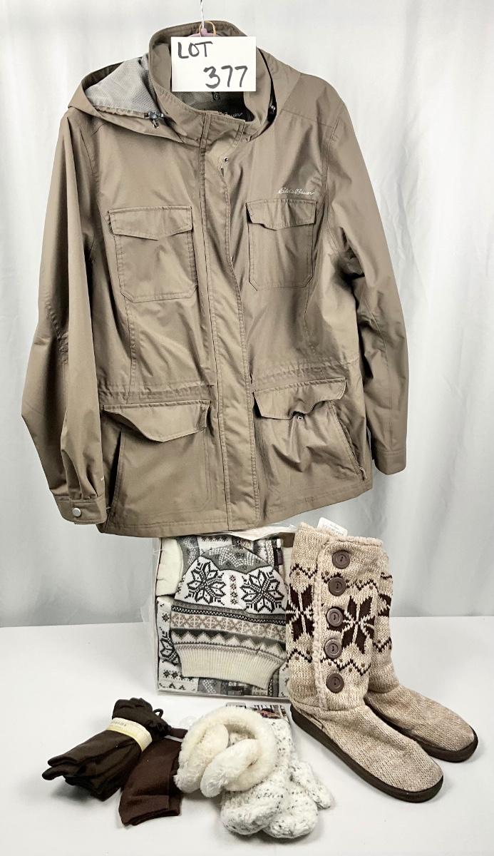 Lot N 377 Eddie Bauer Women’s Weatheredge Four Pocket Shell Jacket ( size XXL ) / NWT Hat, Scarf, Gloves, Socks, Cuddl Duds Mittens, NWT Sweater Boots