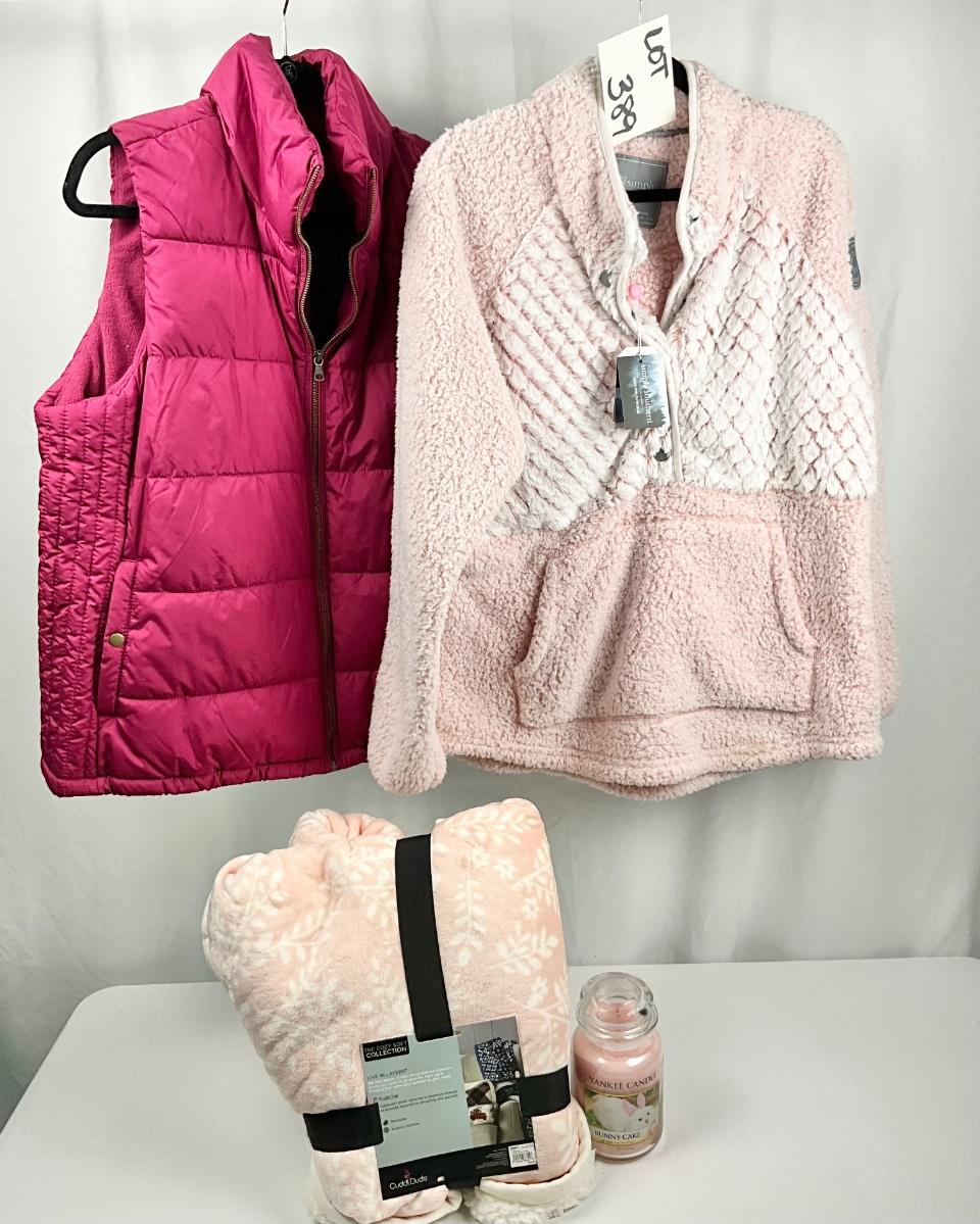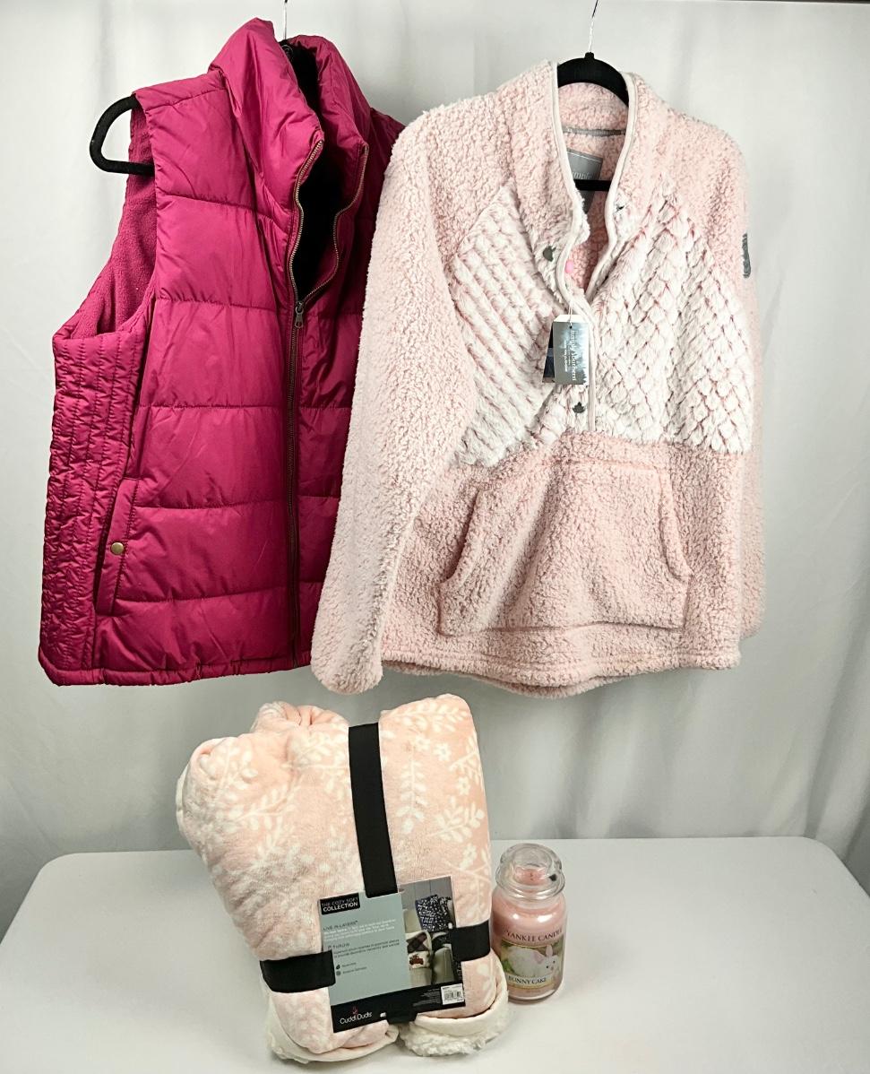Lot N 389 NWT Simply Southern Plush/Fleece Jacket ( size XXL ) / Old Navy Puffer Vest ( size LG ) / NWT Cuddl Duds Throw / Candle