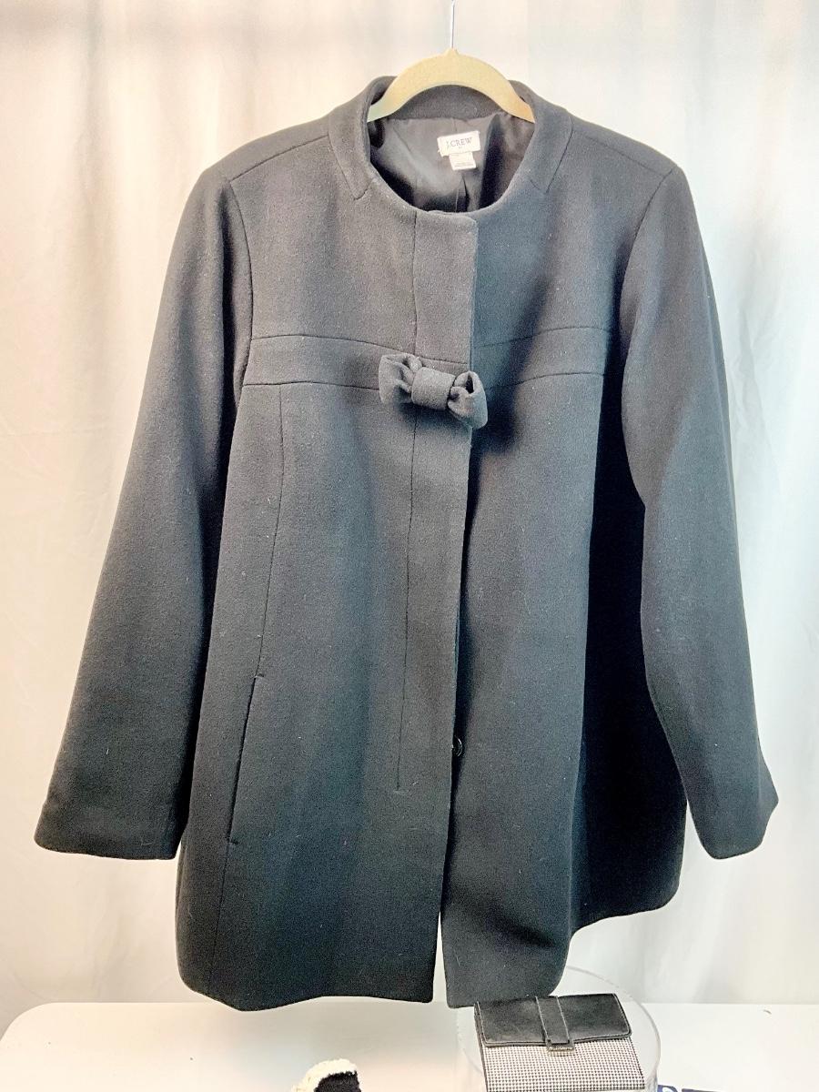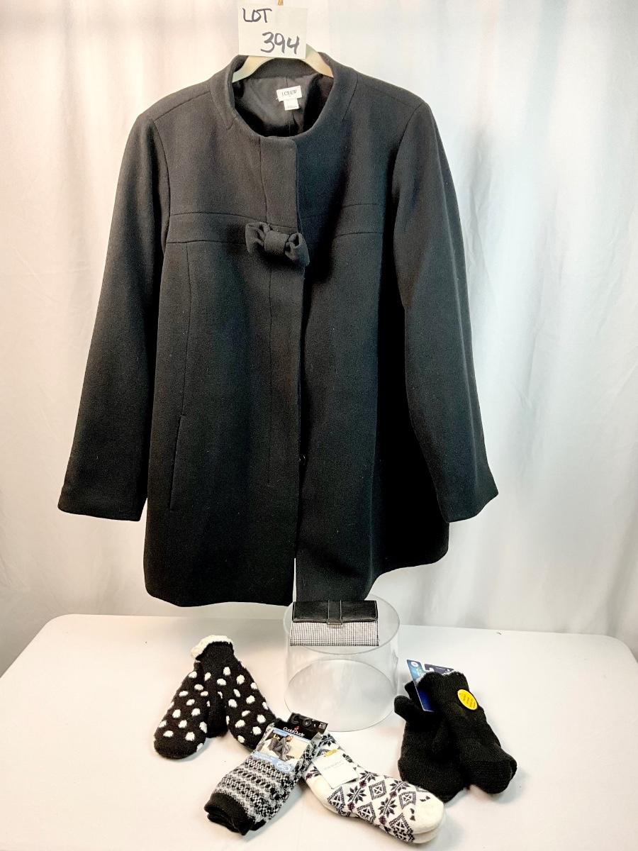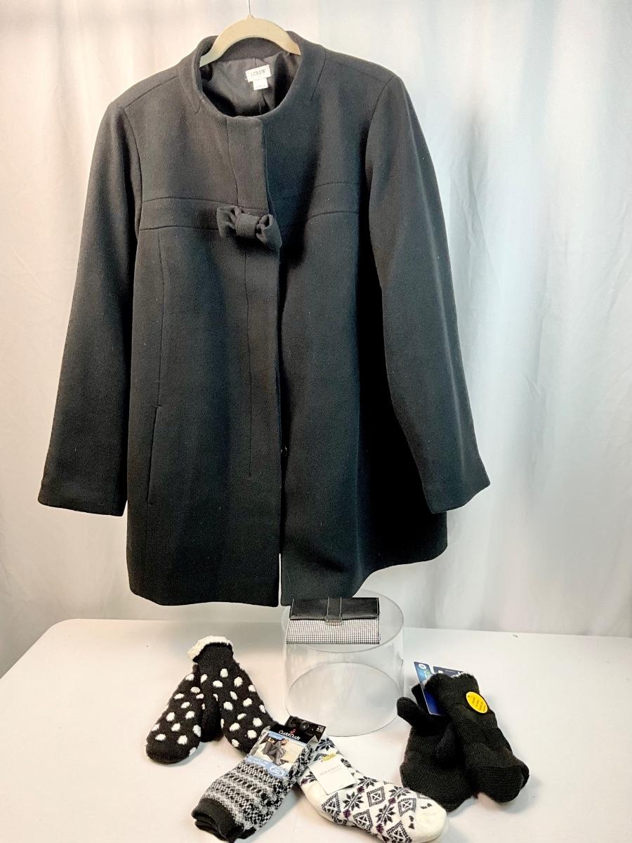 Lot N 394 Beautiful J. Crew Black Wool Blend Bow Coat with hidden button closure ( size XL) / Mittens / Gloves / Liz Claiborne Black&White Wallet /Socks