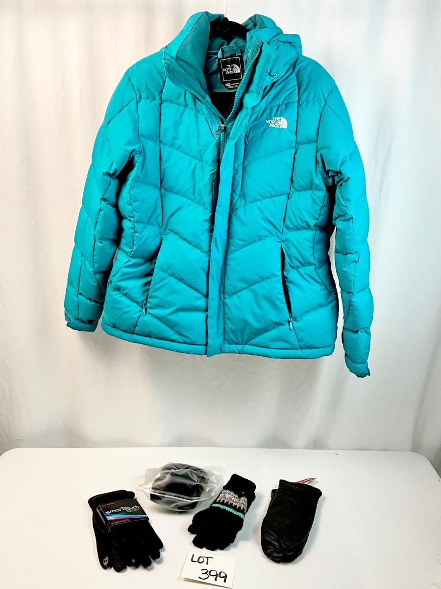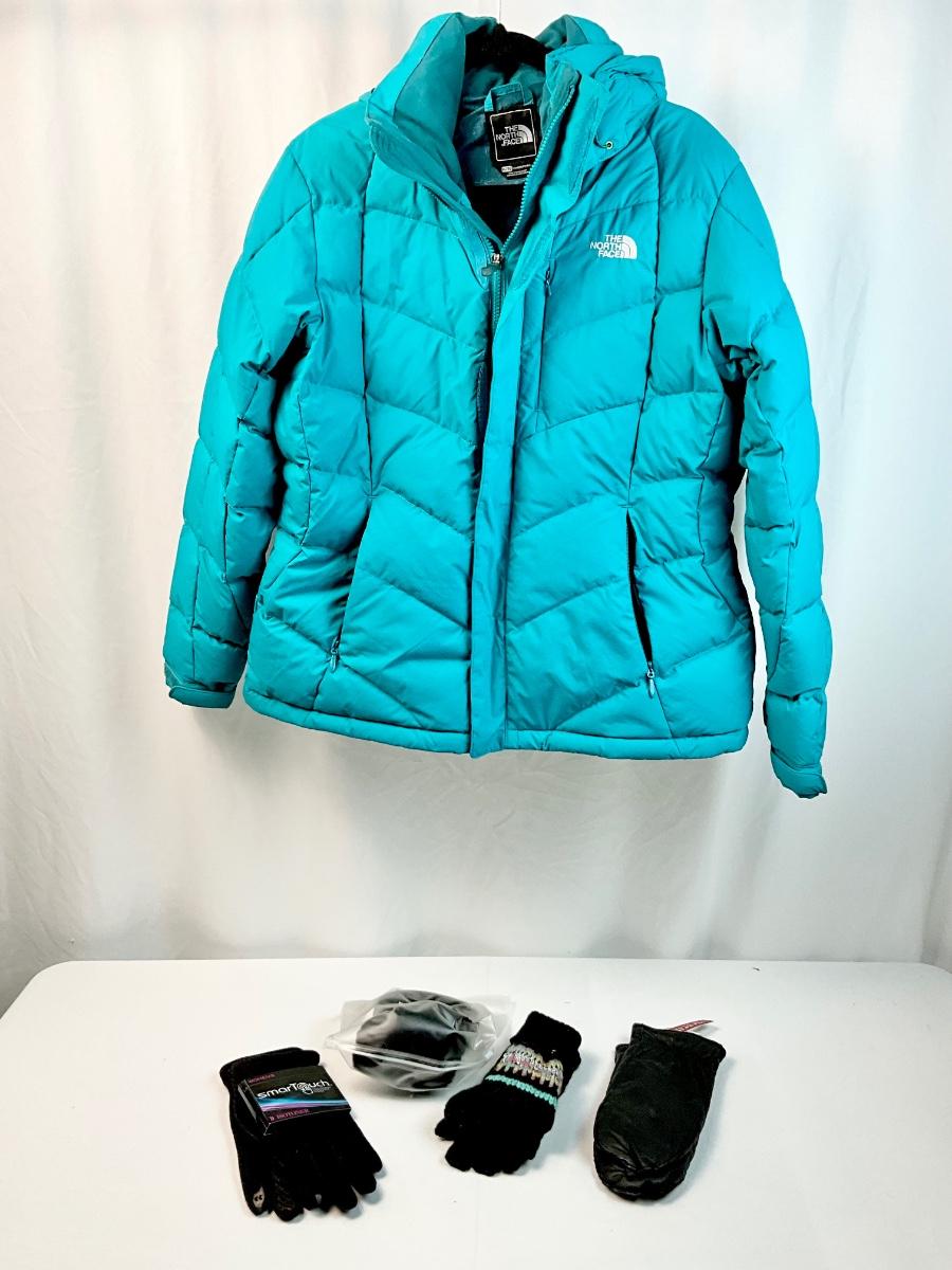 Lot N 399 North Face Ladies Hooded Winter Jacket ( size XL) / NWT Smart Touch Gloves / NWT Leather Mittens / NWT Ear Muffs