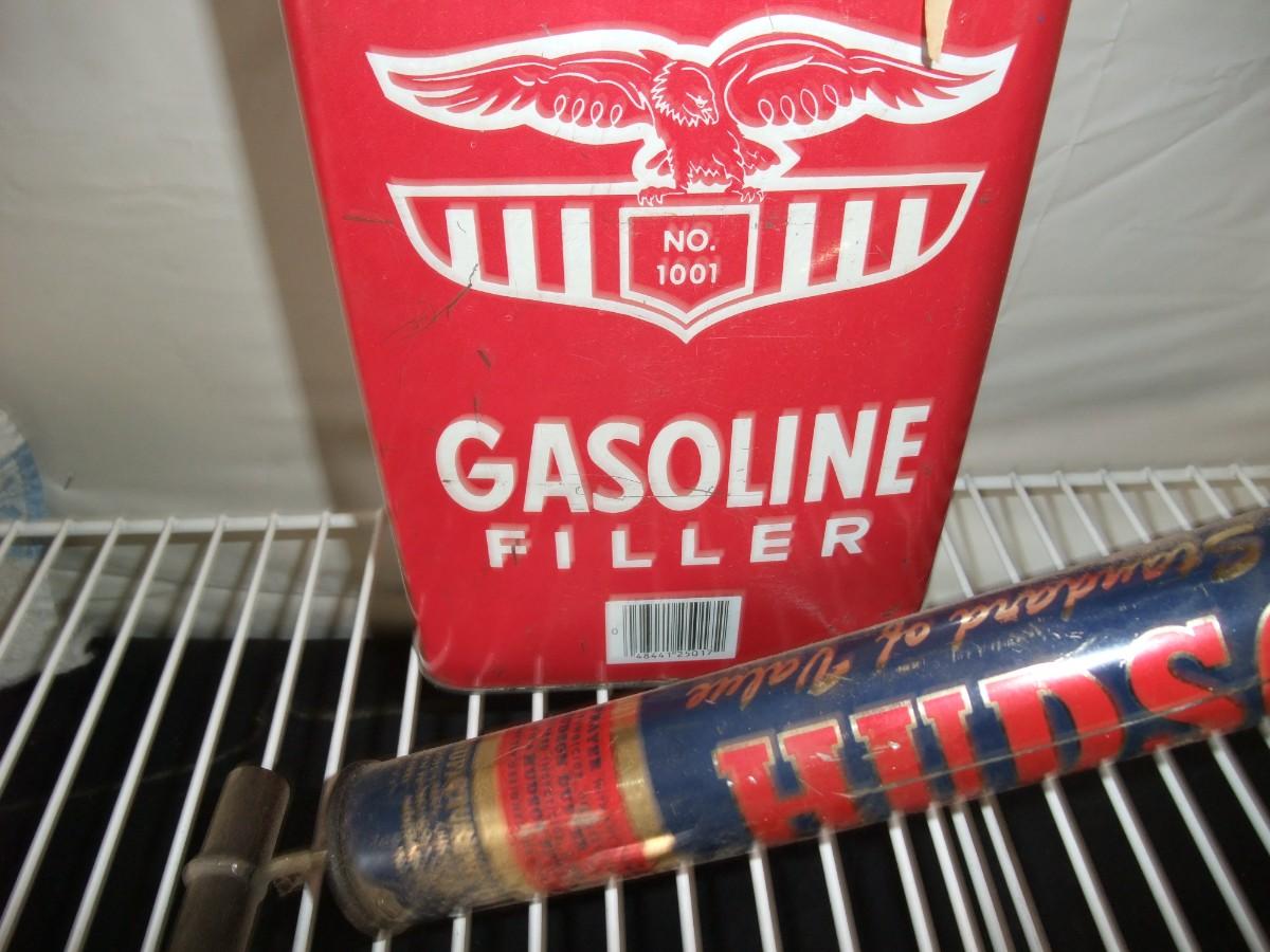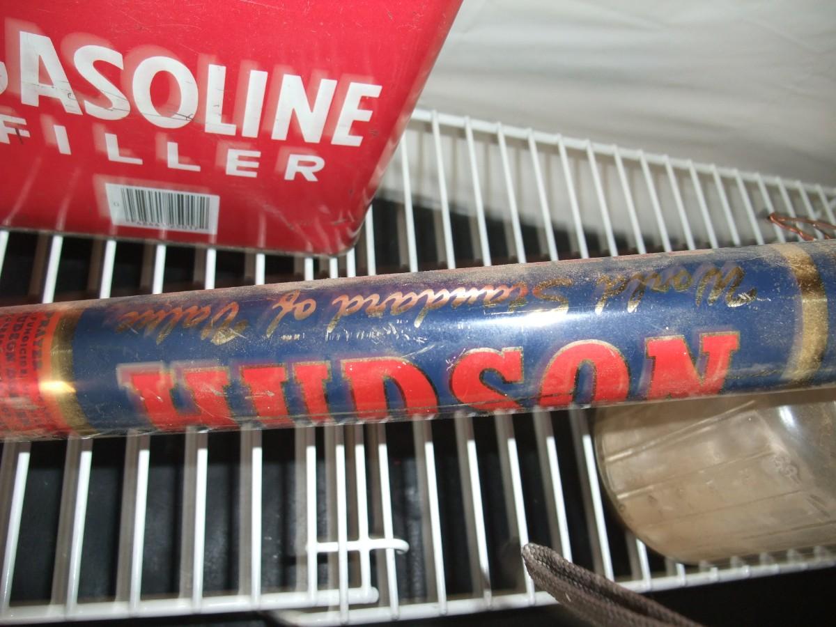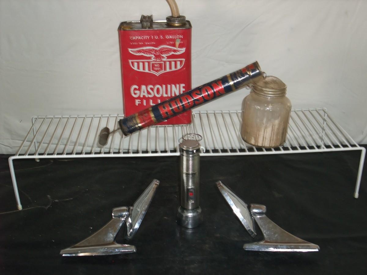 LOT 226 VINTAGE GARAGE ITEMS, GAS CAN, HUDSON SPRAYER, METAL FLASHLIGH AND SIDE VIEW MIRRORS
