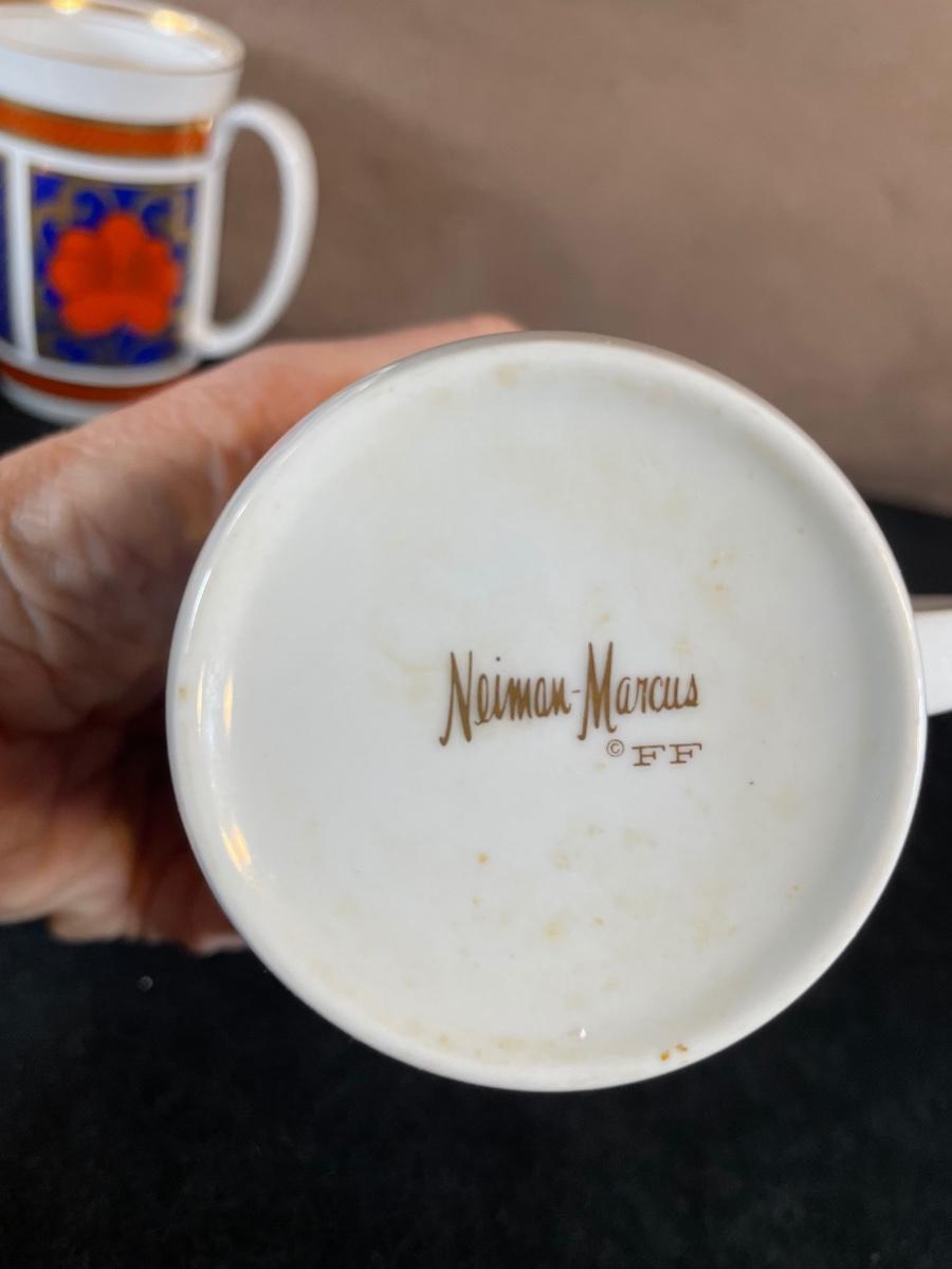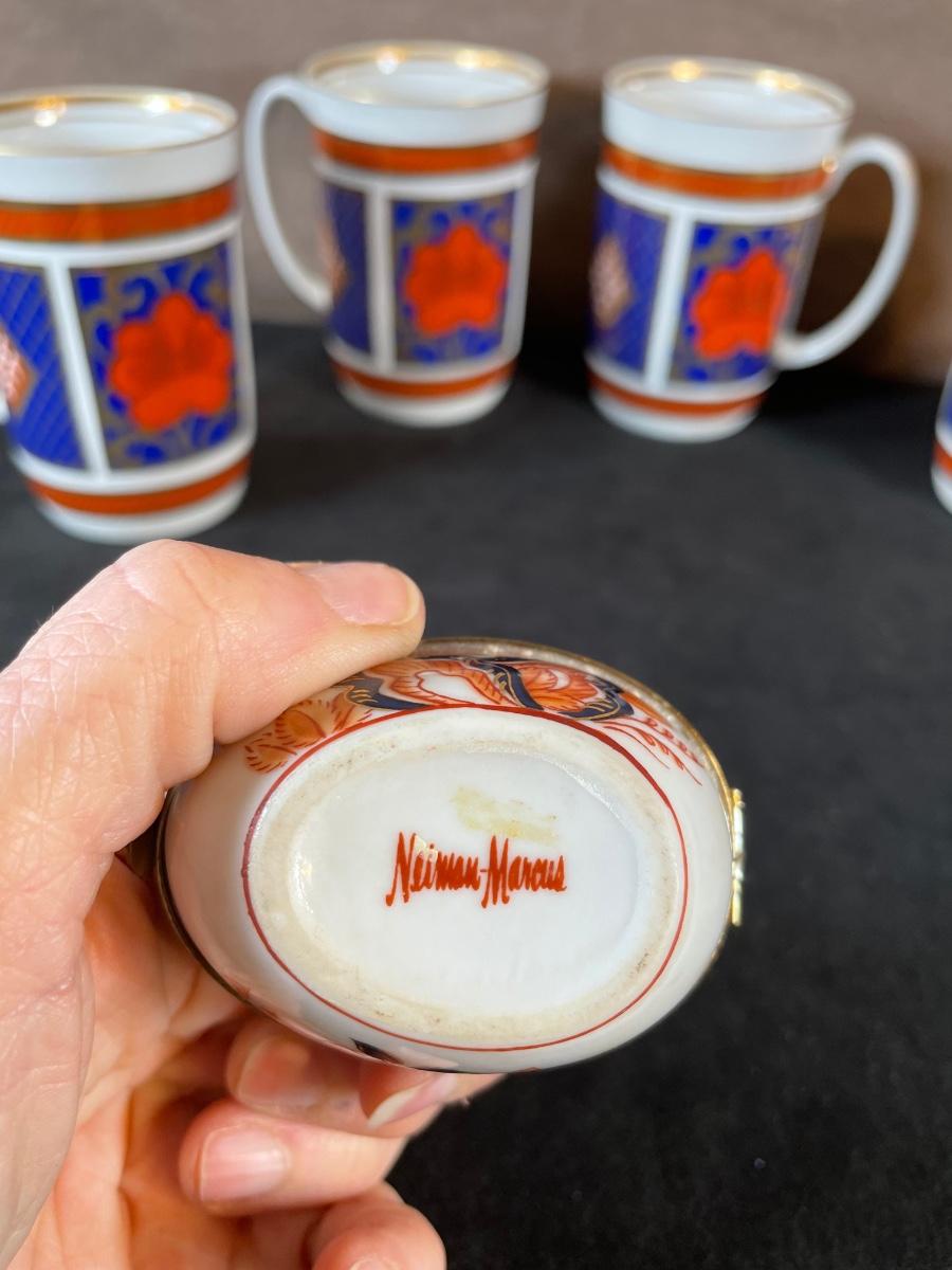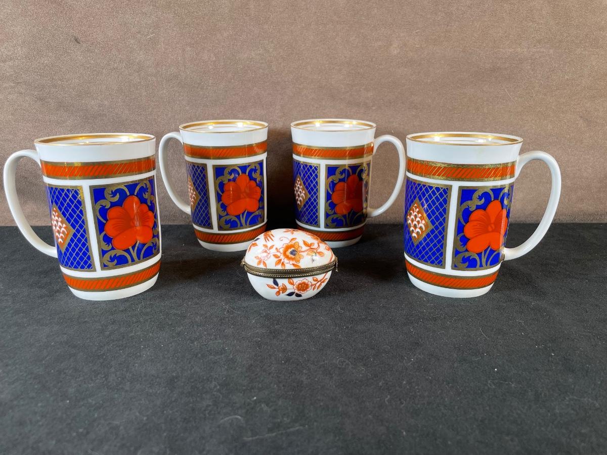 set of 4 porcelain mugs with an Asian motif and a porcelain hinged trinket box
