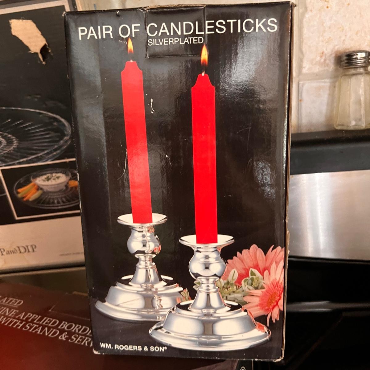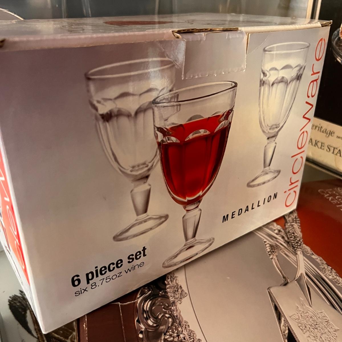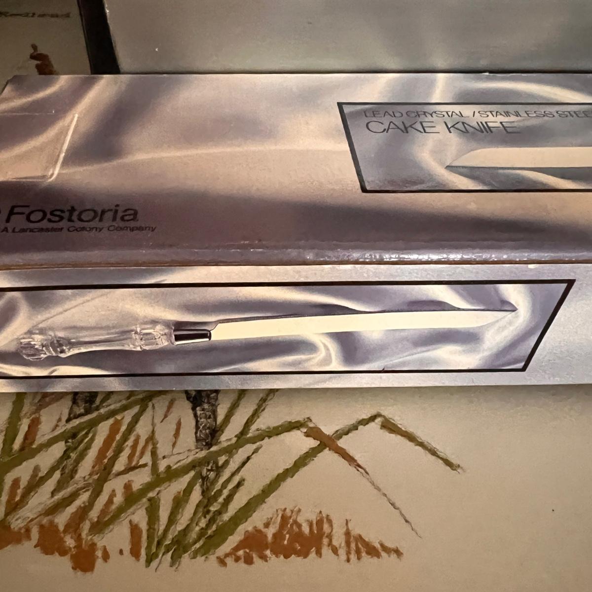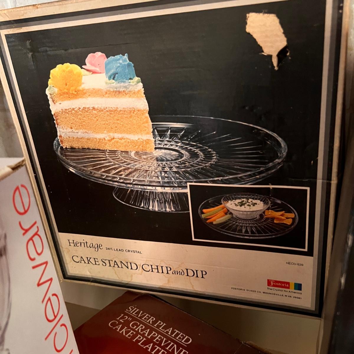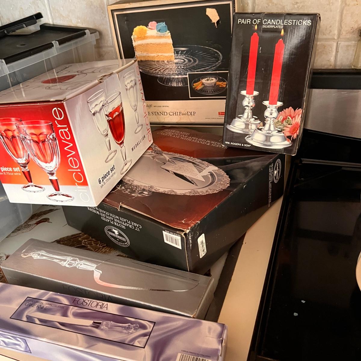 6 new in box kitchen/serving ware new old stock. Glasses, cake stand, serving stand, candlestick holders, lead crystal serving knife.