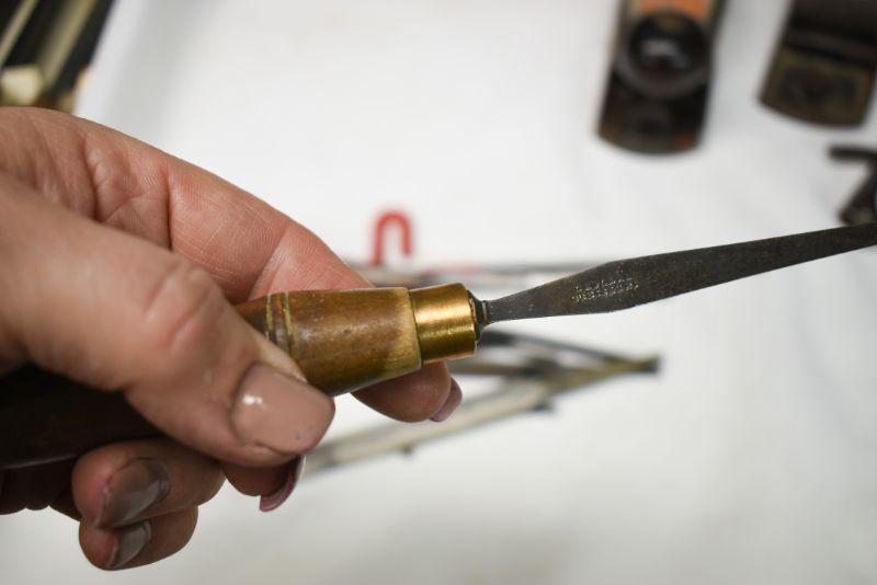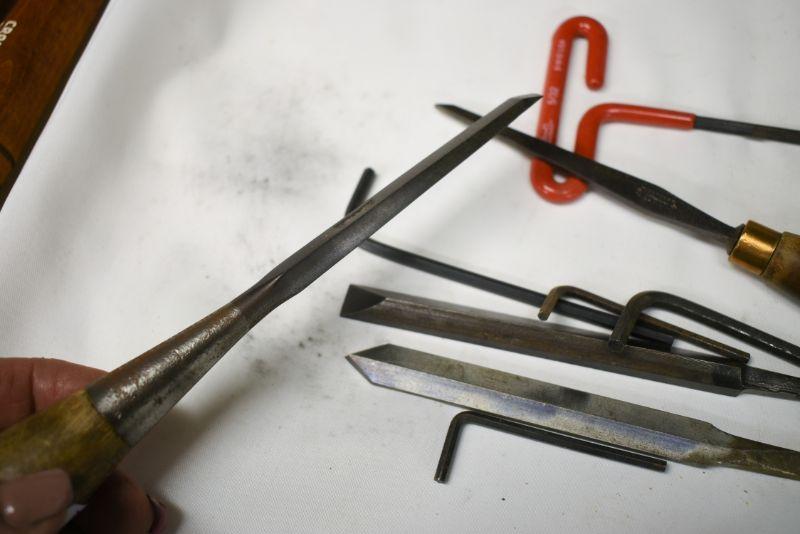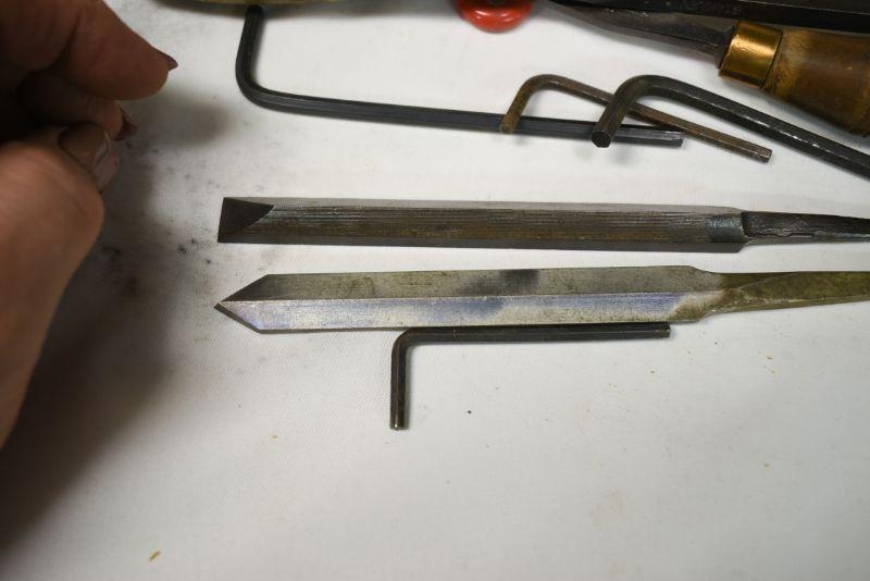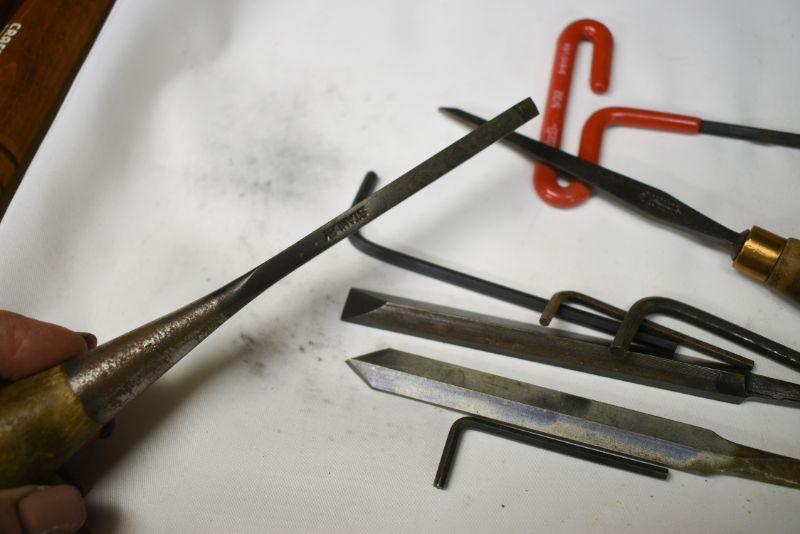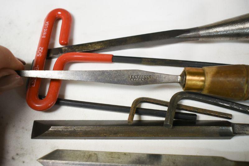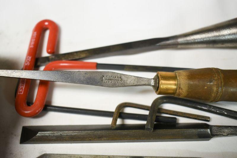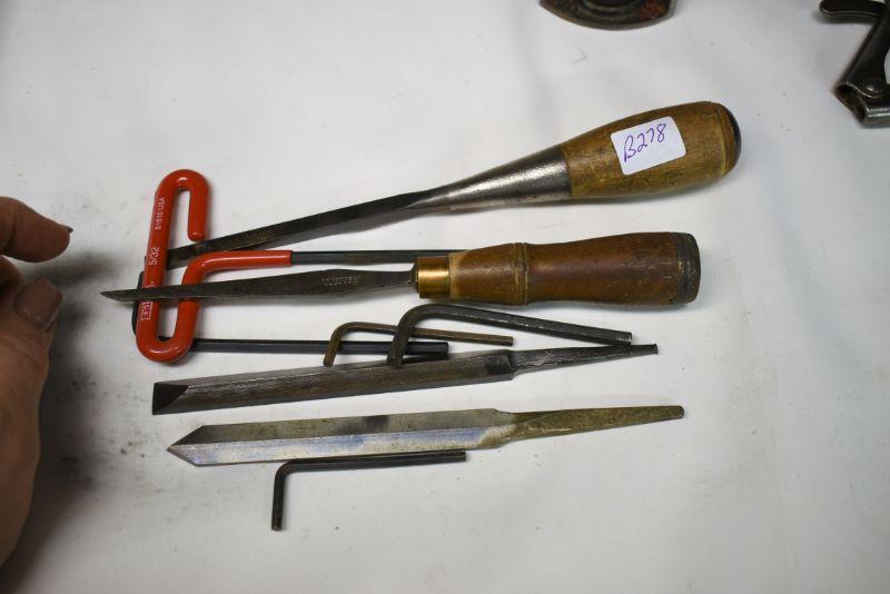 Vintage wooden handle files, allen wrenches and more. Located in basement that has narrow, steep, cement steps, and a sharp turn to right at bottom.