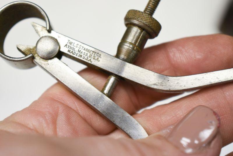 Two vintage calipers by L.S. Starrett. Located in basement that has narrow, steep, cement steps, and a sharp turn to right at bottom.