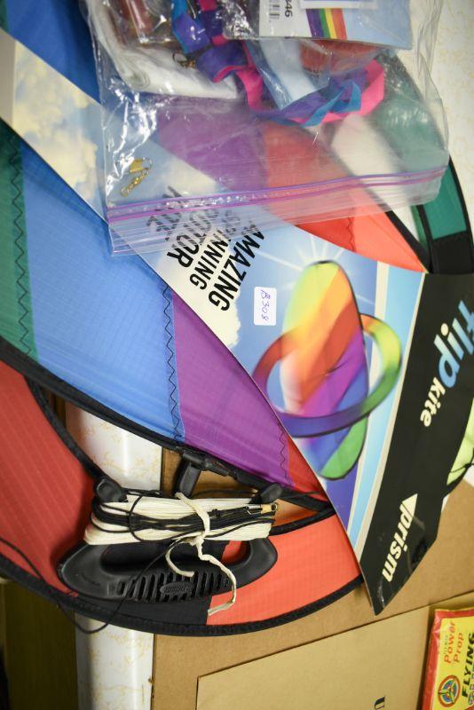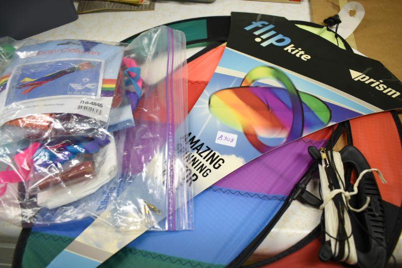 Flip kite by Prism and In the Breeze wind sock. Located in basement that has narrow, steep, cement steps, and a sharp turn to right at bottom.