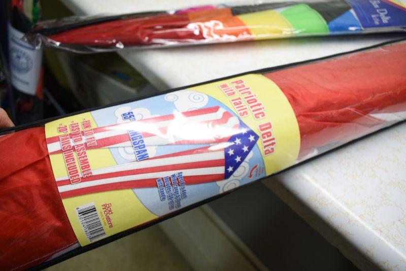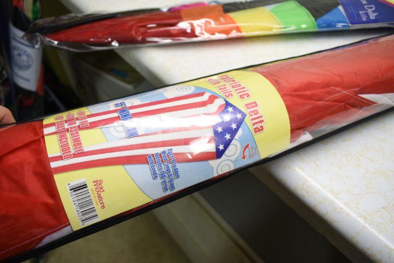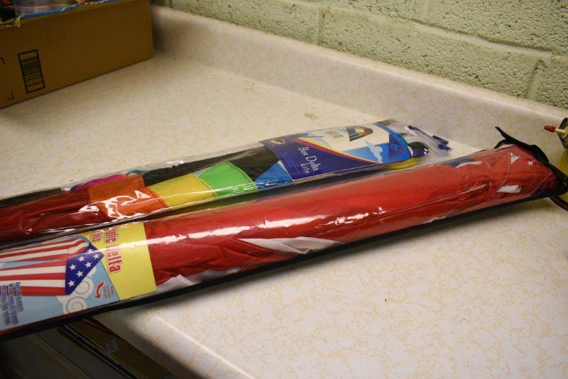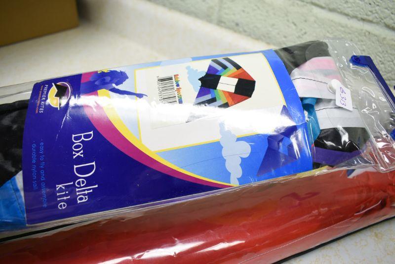 Premier Box Delta kite, and a Patriotic Delta with tails. Located in basement that has narrow, steep, cement steps, and a sharp turn to right at bottom.