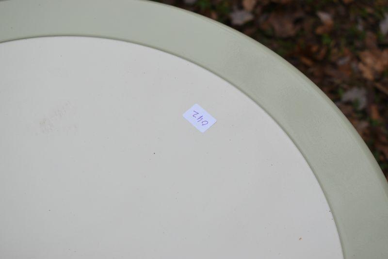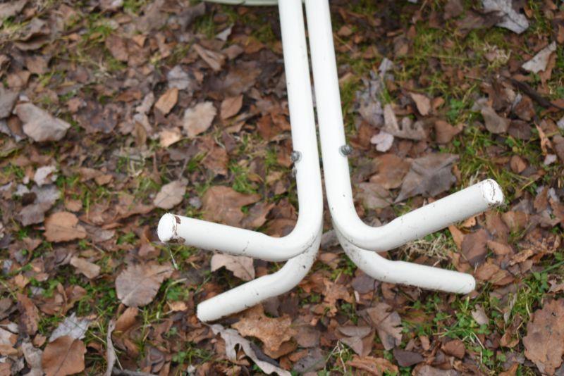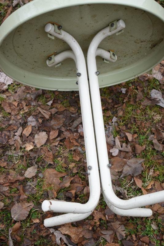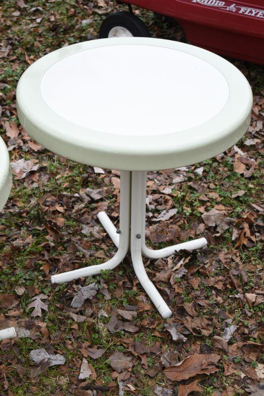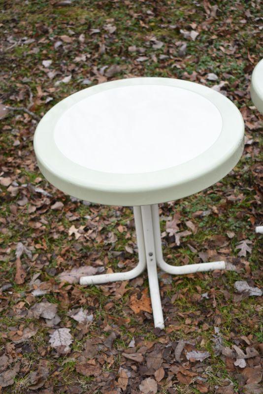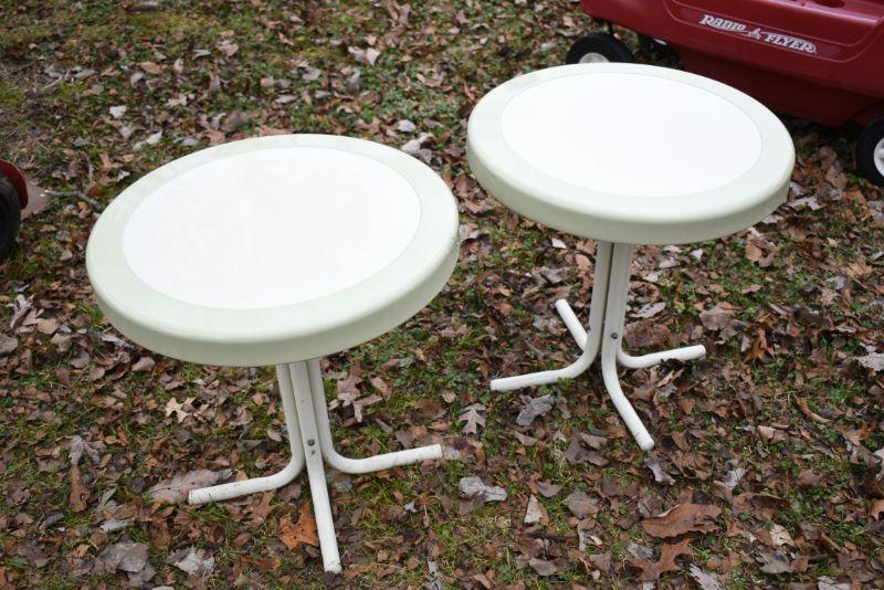 Two enameled metal side tables, 20.5x20.5. White with green trim, very good condition.