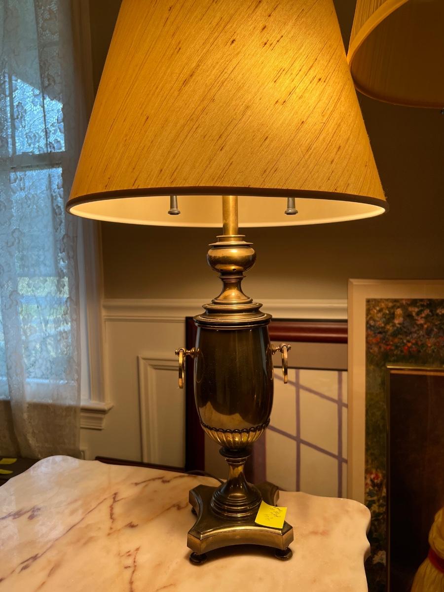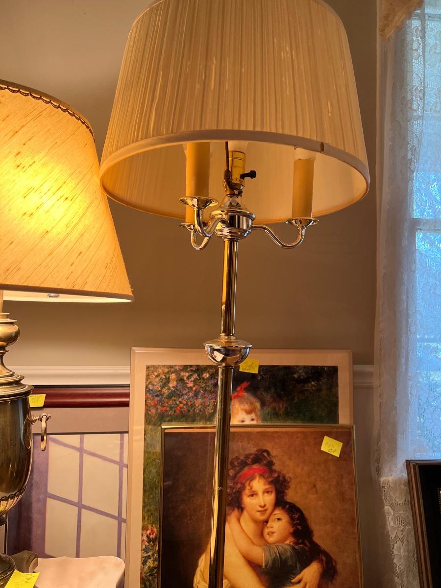 Lot of 1 Brass 1 Bronze lamp. 1 Table 2 Floor Off white shades