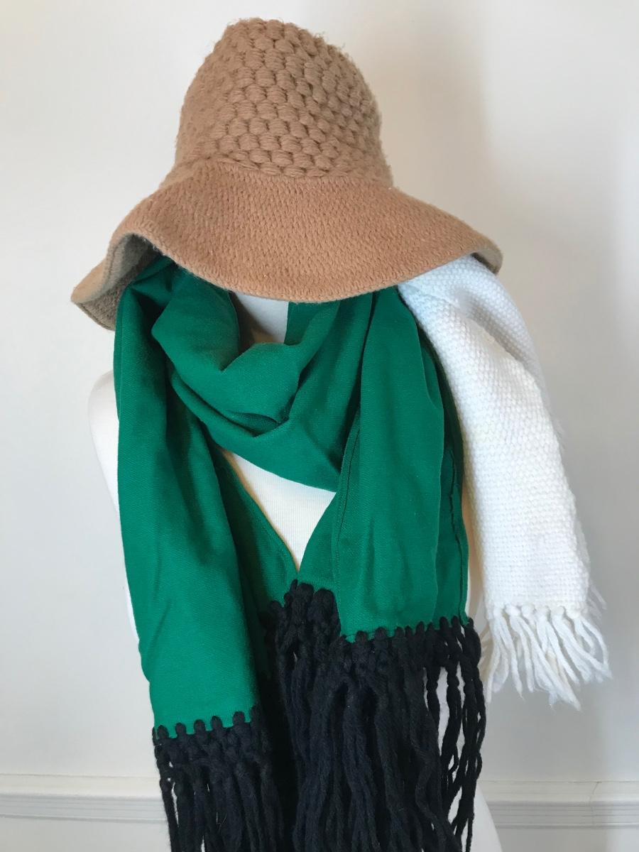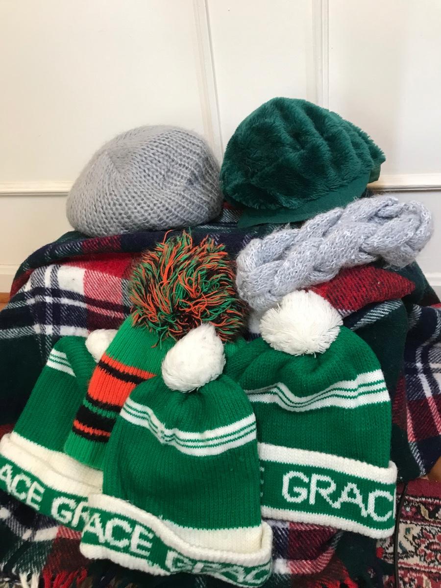 Lot of 10 vintage knit scarves, hats and blanket