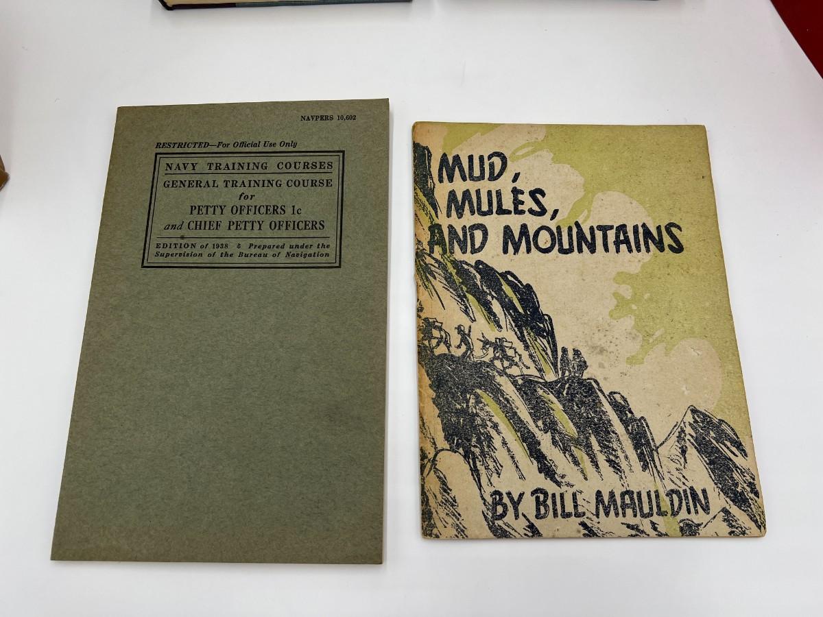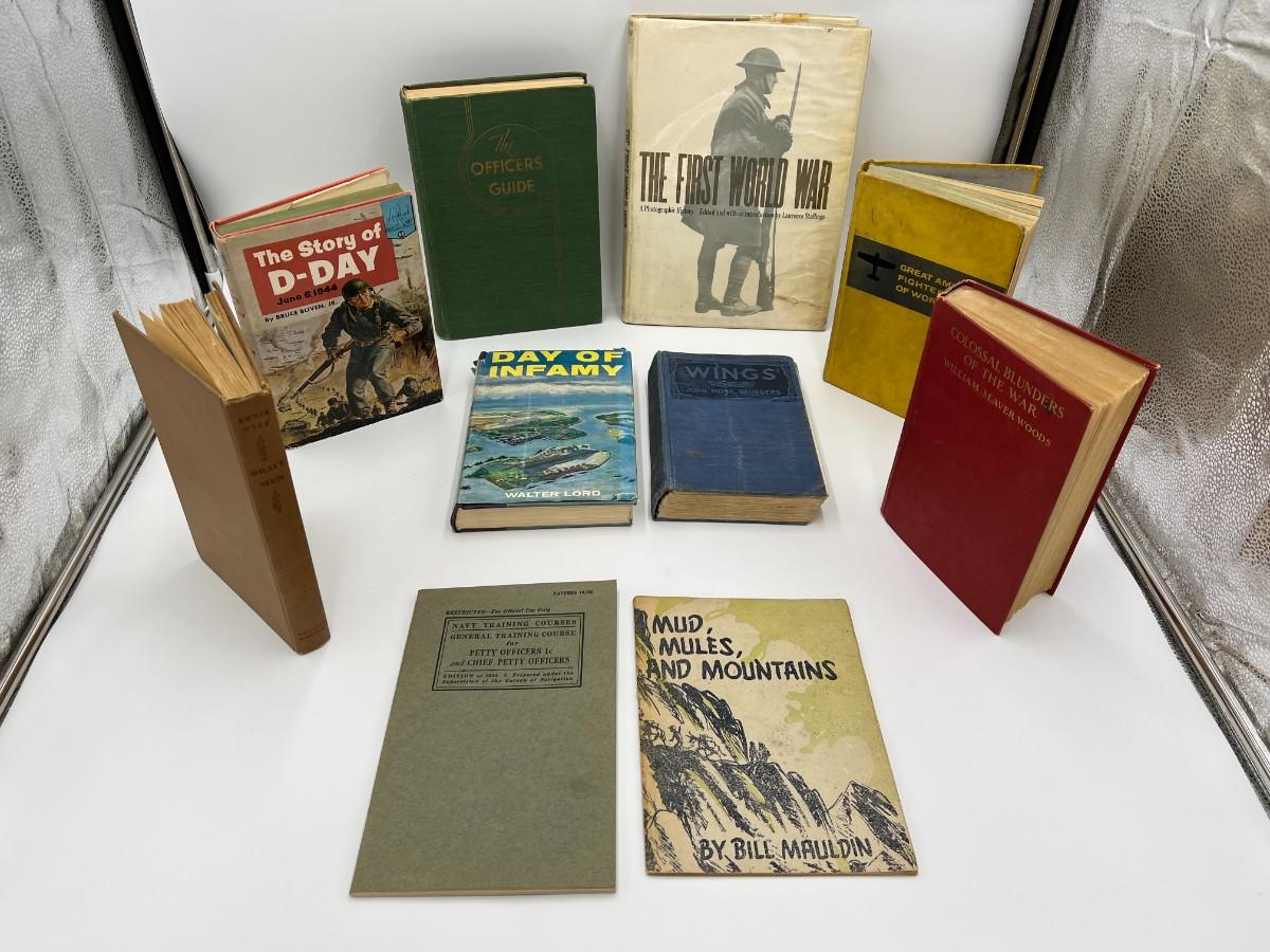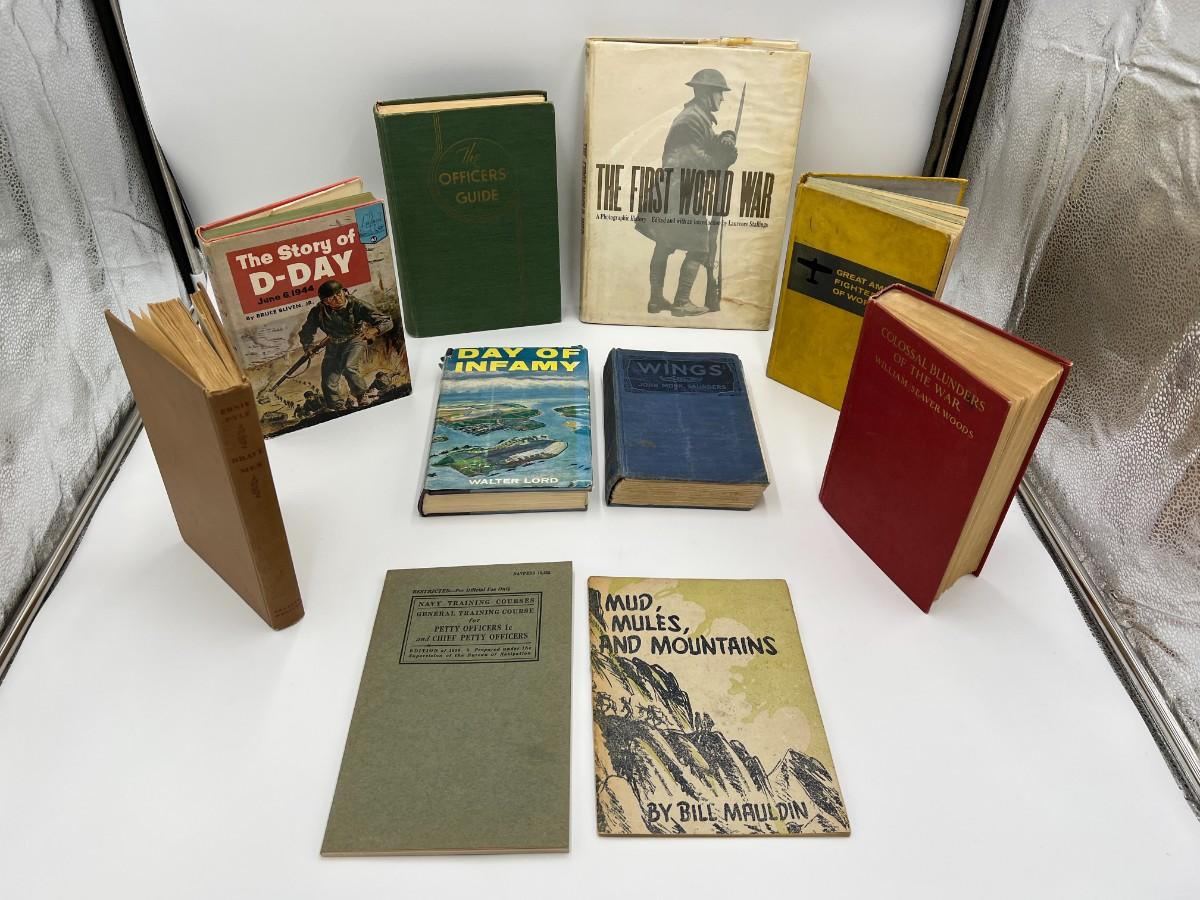 Lot of 10 War Related Vintage Books including books circa 1920, 1930, 1940, 1950 and 1960. Includes The Story of D-Day, The First World War, Mud Mules and Mountains, Day of Infamy, and a 1938 pre-war USN PO & CPO Manual. Conditions as shown.