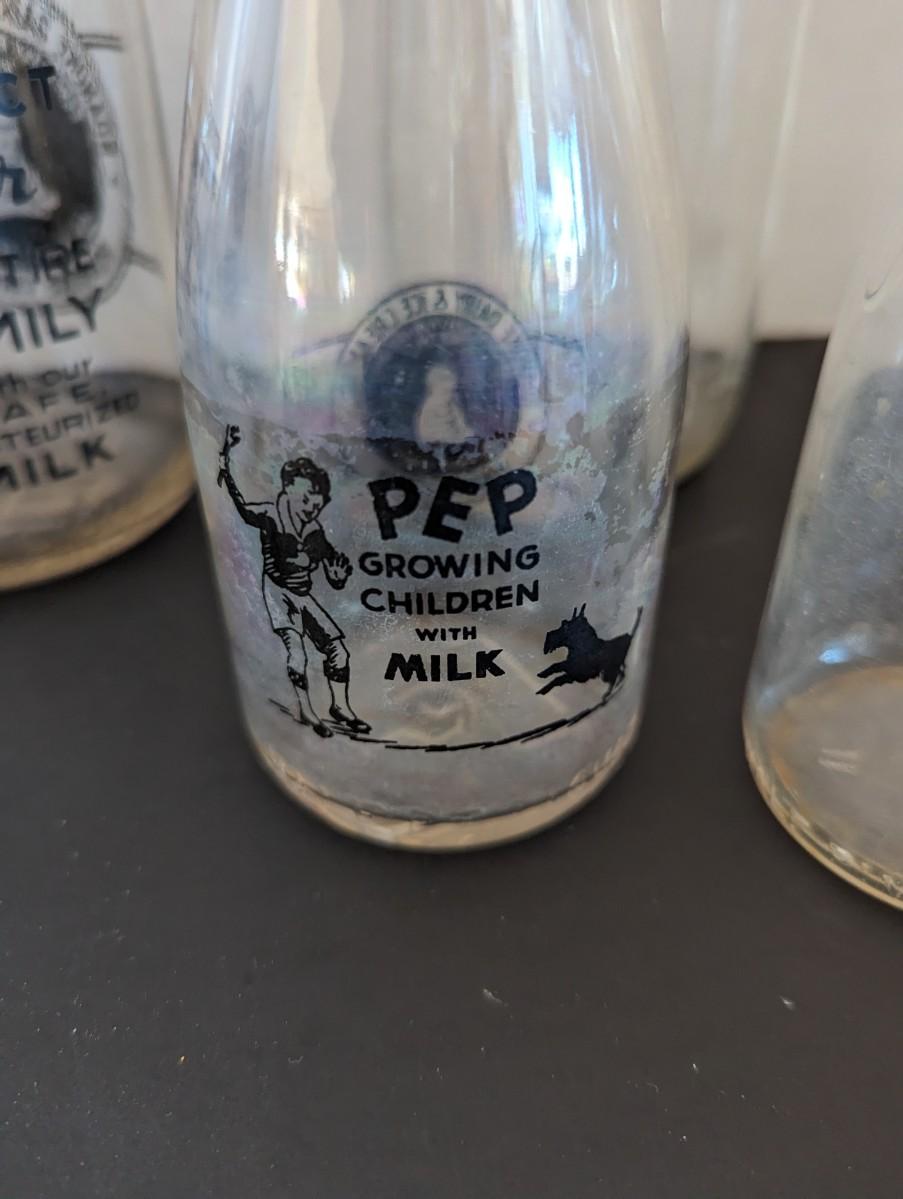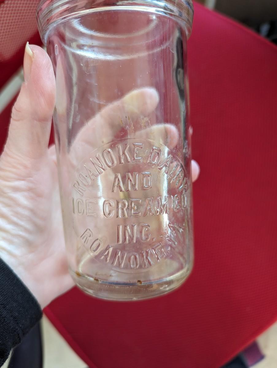 1 round sided 1 pint bottle with black Roanoke Dairy and Ice Cream company logo on one side and promotional image on the other,