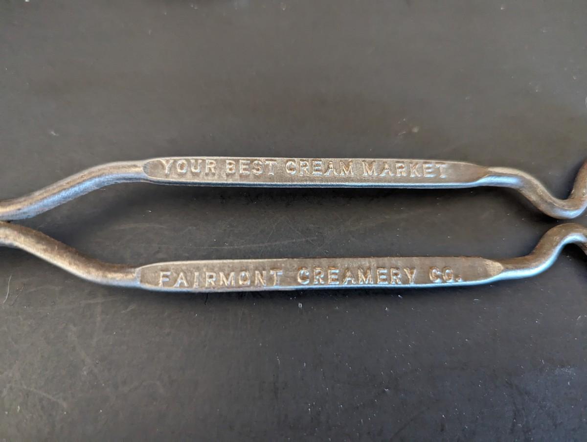 1 metal ladle with bottle opener on end of handle. "Fairmont Creamery Co" "Your bes cream market" embossed