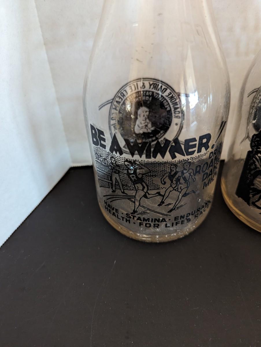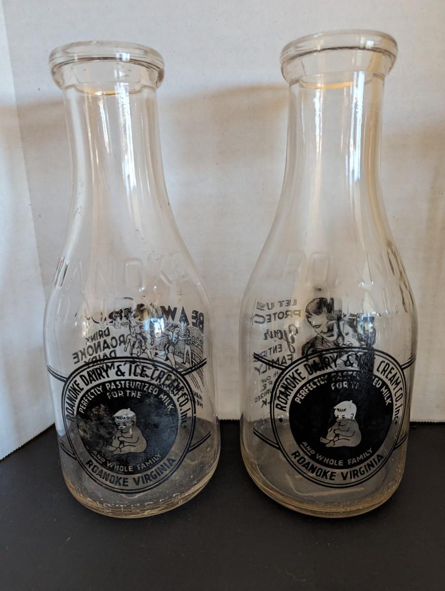 2 1 quart bottles with the black Roanoke Dairy and Ice Cream Company logo on one side and promotional images on the other.