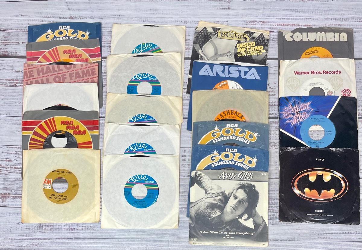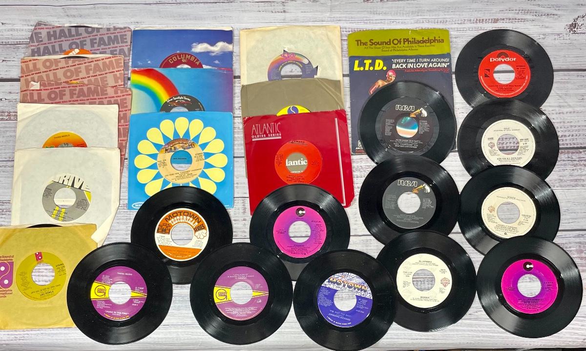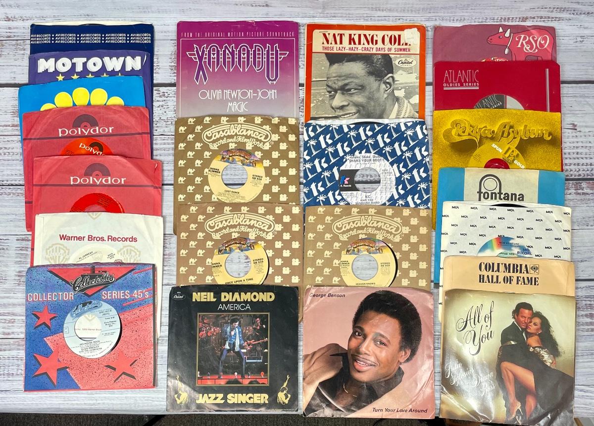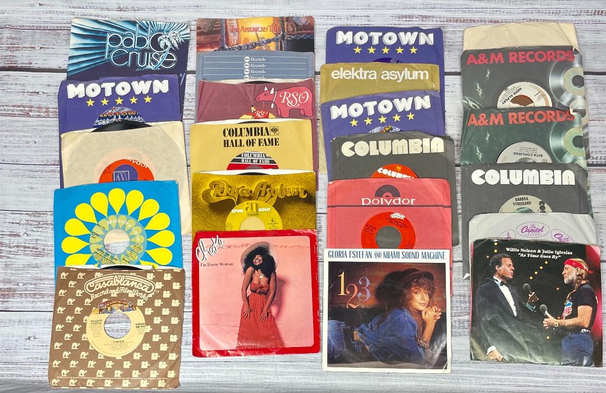 Use lot of vintage 45s, most from 1970’s and early 1980’s. Includes Motown, Disco, Pop, R&B, Country, and some special releases. Labels include RCA, Epic, Casablanca, Columbia, Dot, Motown, Polydor, Atlantic, Asylum, ABC Records, De-Lite, RSO, and Warner Bros.