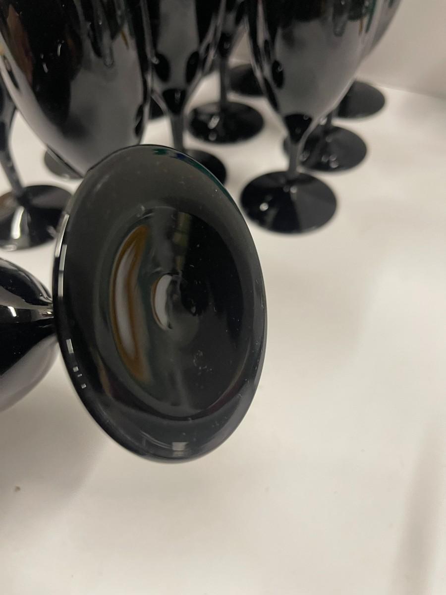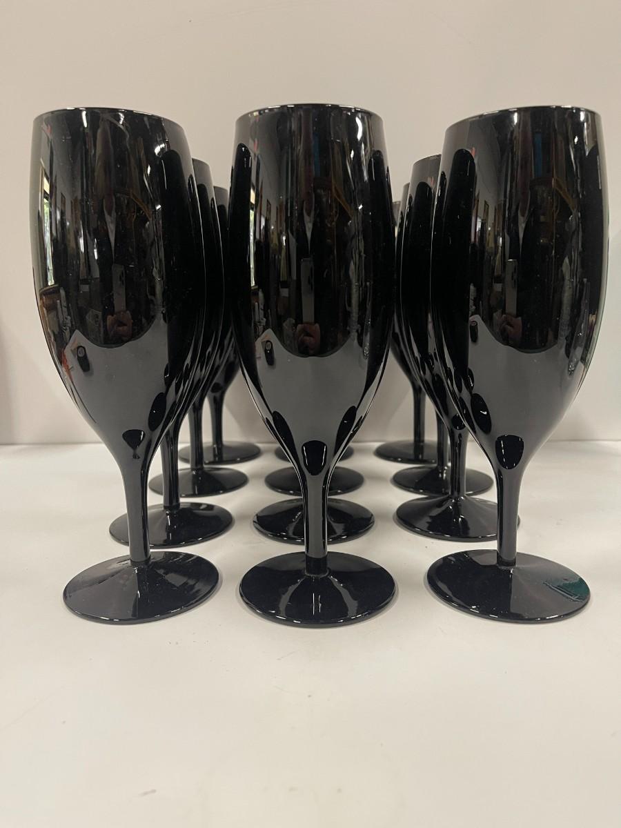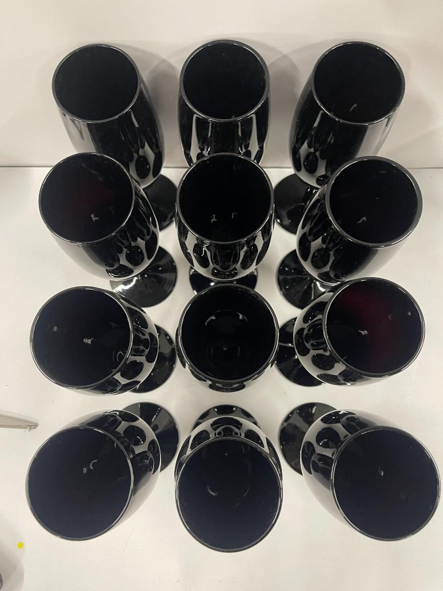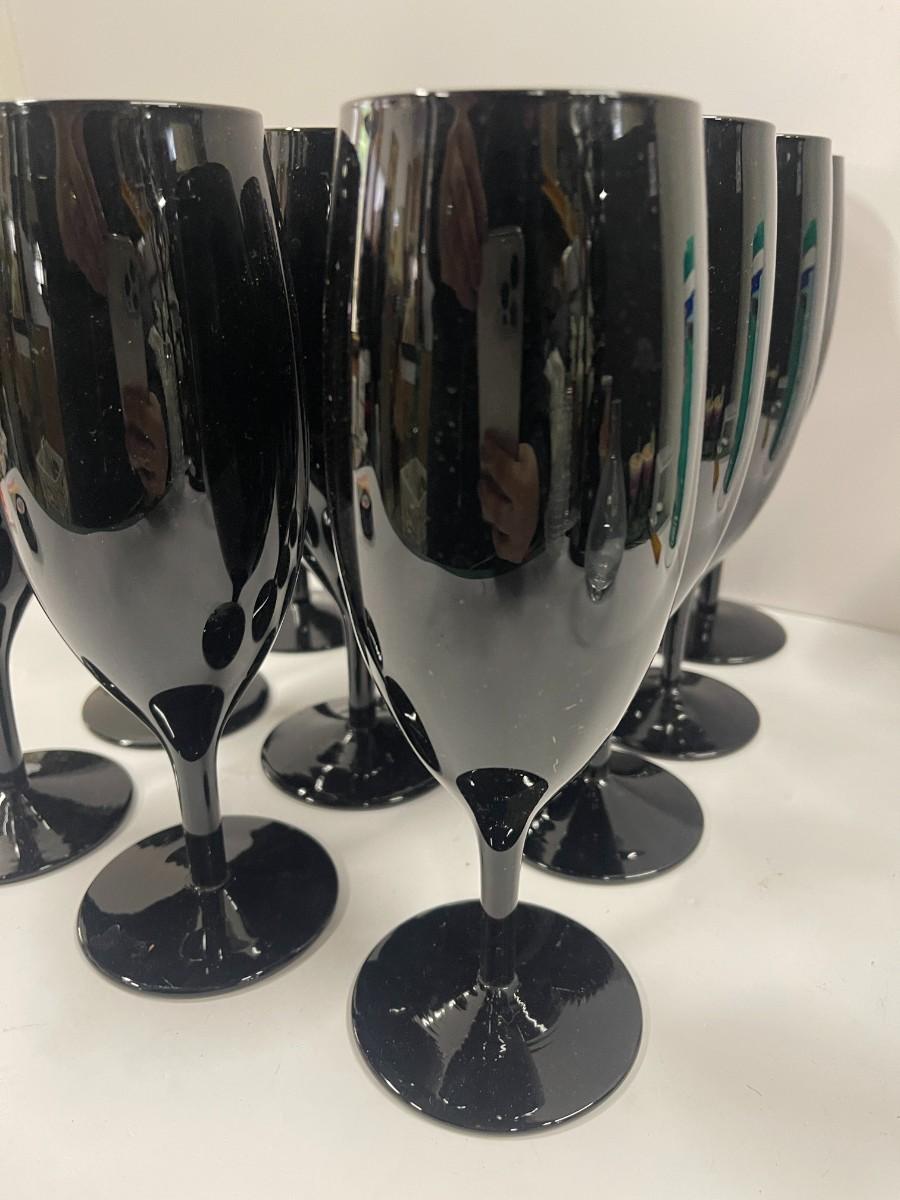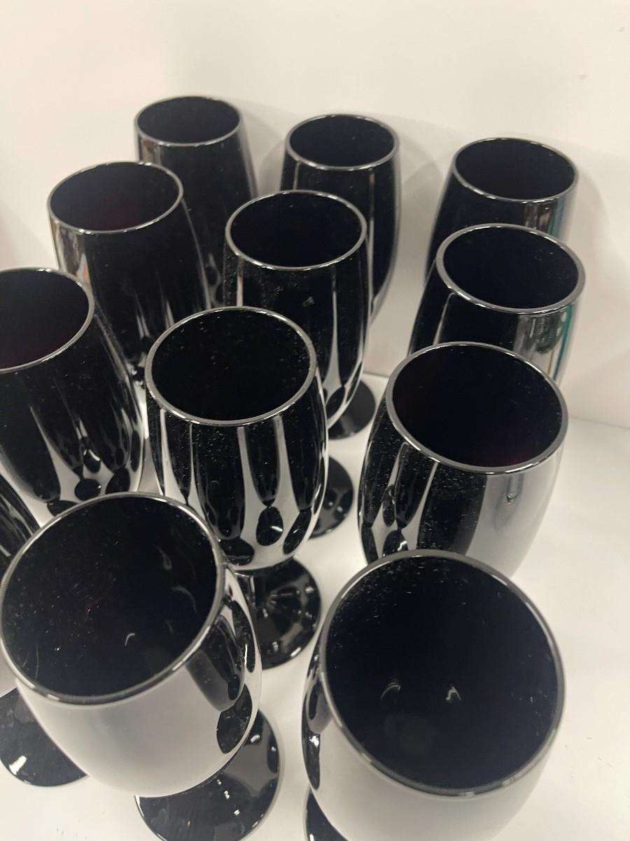 Lot of 12 black glass water glasses with stems. 8 1/2" x 2 1/2"