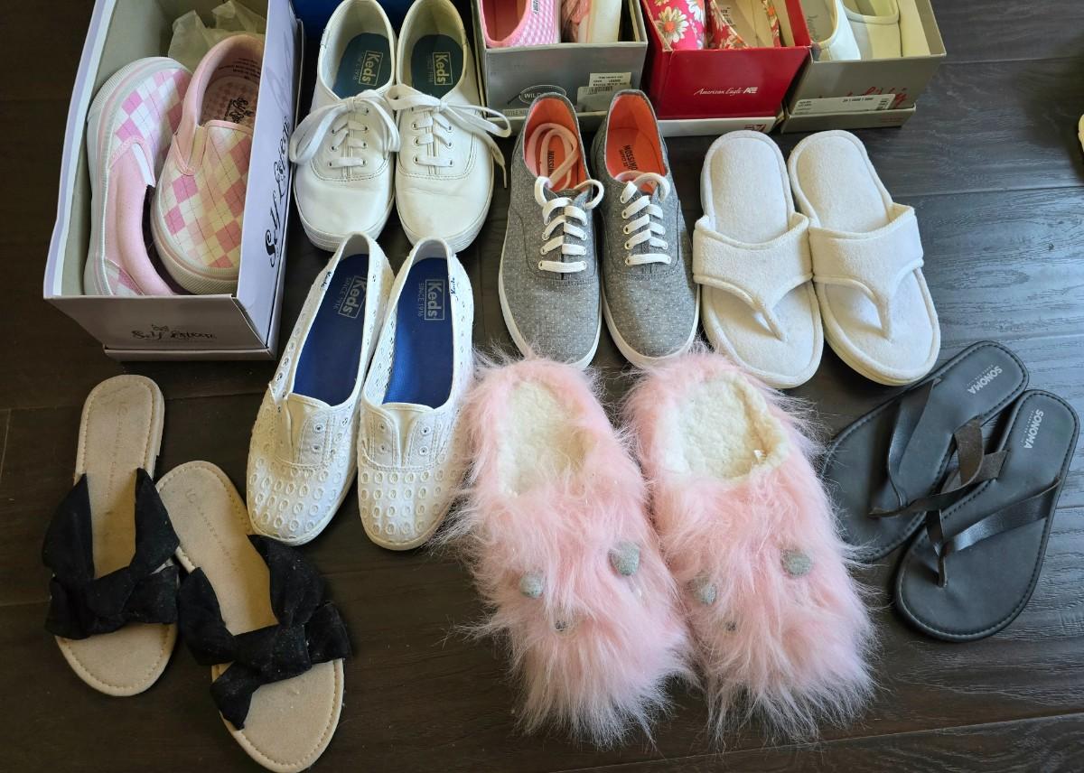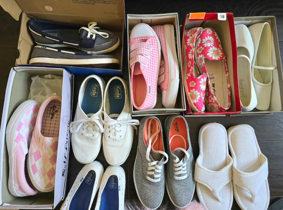 Just Libby white Ballet BNIB size 8.5, American Eagle (pink) sneakers BNIB size 8.5, Wild Diva (pink) BNIB size 8.5, Blue Keds worn once w/box size 8.5, Pink Self Esteem Worn once w/box, size 8.5, Grey mossimos worn once No Box size 8, Dear Foams white slippers No box size 8, White Keds Lightly worn No box size 8.5, Pink monster slippers No Box size LG, White Keds lightly worn-nobox size 8.5, Sonoma sandles no box Brand New Size M(7-8), Lauren Conrad Sandles Brand New-No box size M(7-8)