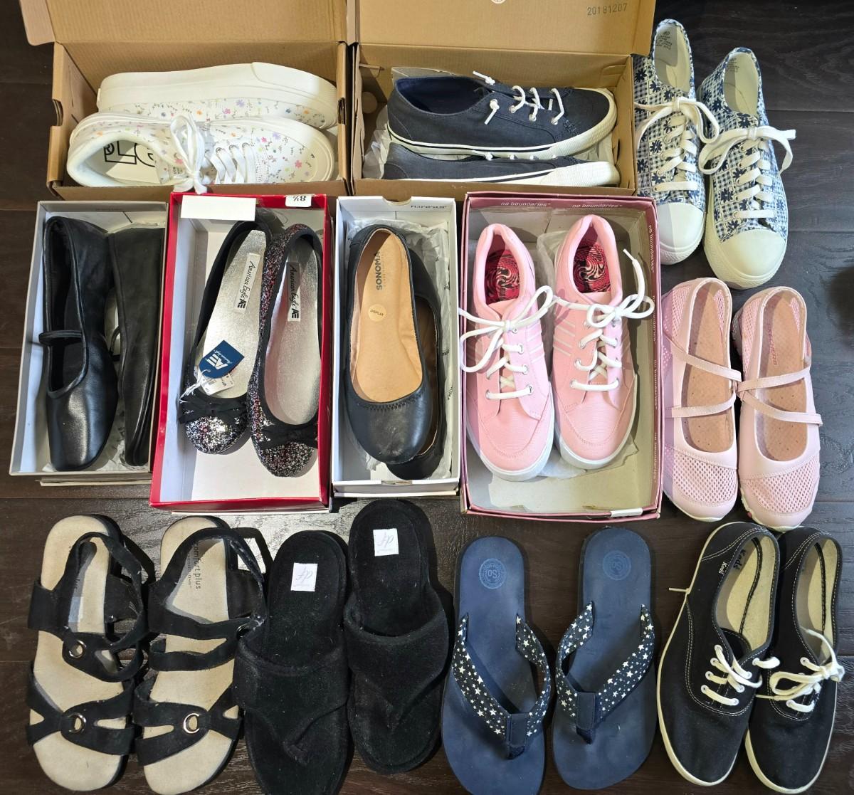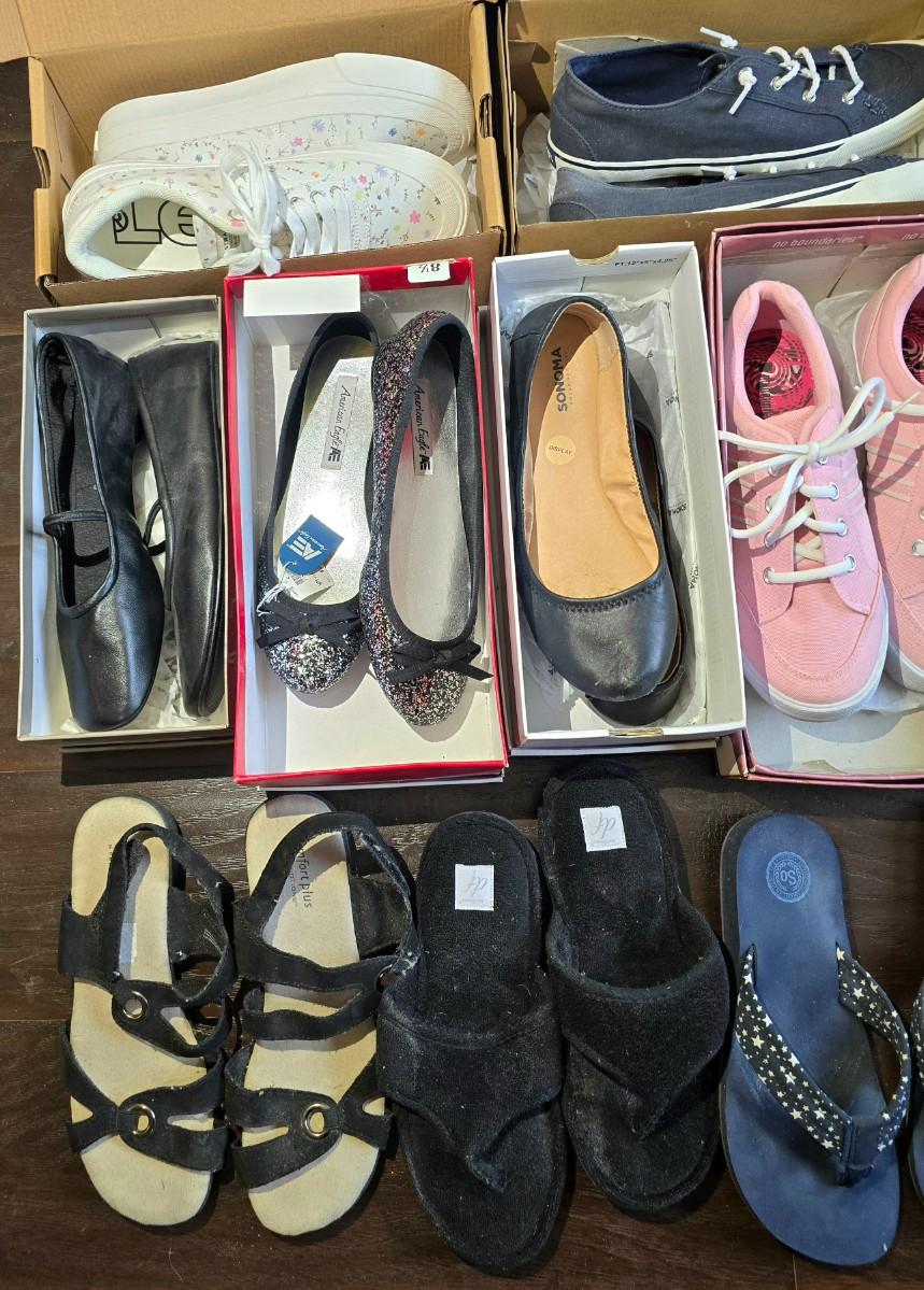 Pink No Boundries lightly worn w/box size 8.5, Blue/white Daisies Lightly worn-No box Size 8.5, American Eagle(black/silver sparkles) BNIB size 8.5, Pink Sketchers Lightly worn-No box size 8, Black Sonoma flats lightly worn w/box size 8.5, Black/white Keds lightly worn-No Box size 8.5, White flower print Levis BNIB size 8, Just Libby black ballet flats BNIB size 8.5, Navy blye Sperry Memory foam lightly worn w/ box size 8.5, Black predictions comfort plus sandles worn once-no box siz 8.5, sandles no size assuming 8 worn once, Dear foams black slippers worn once size MD(7-8)