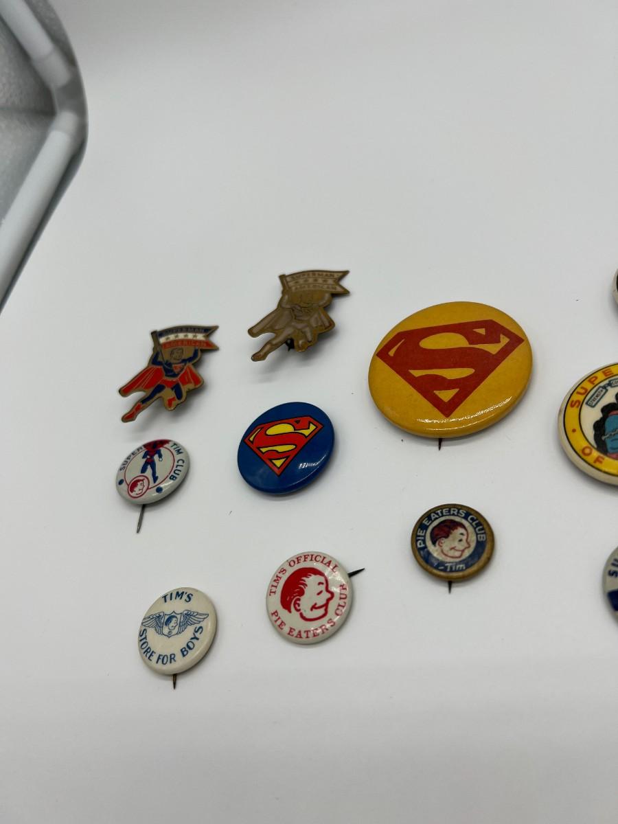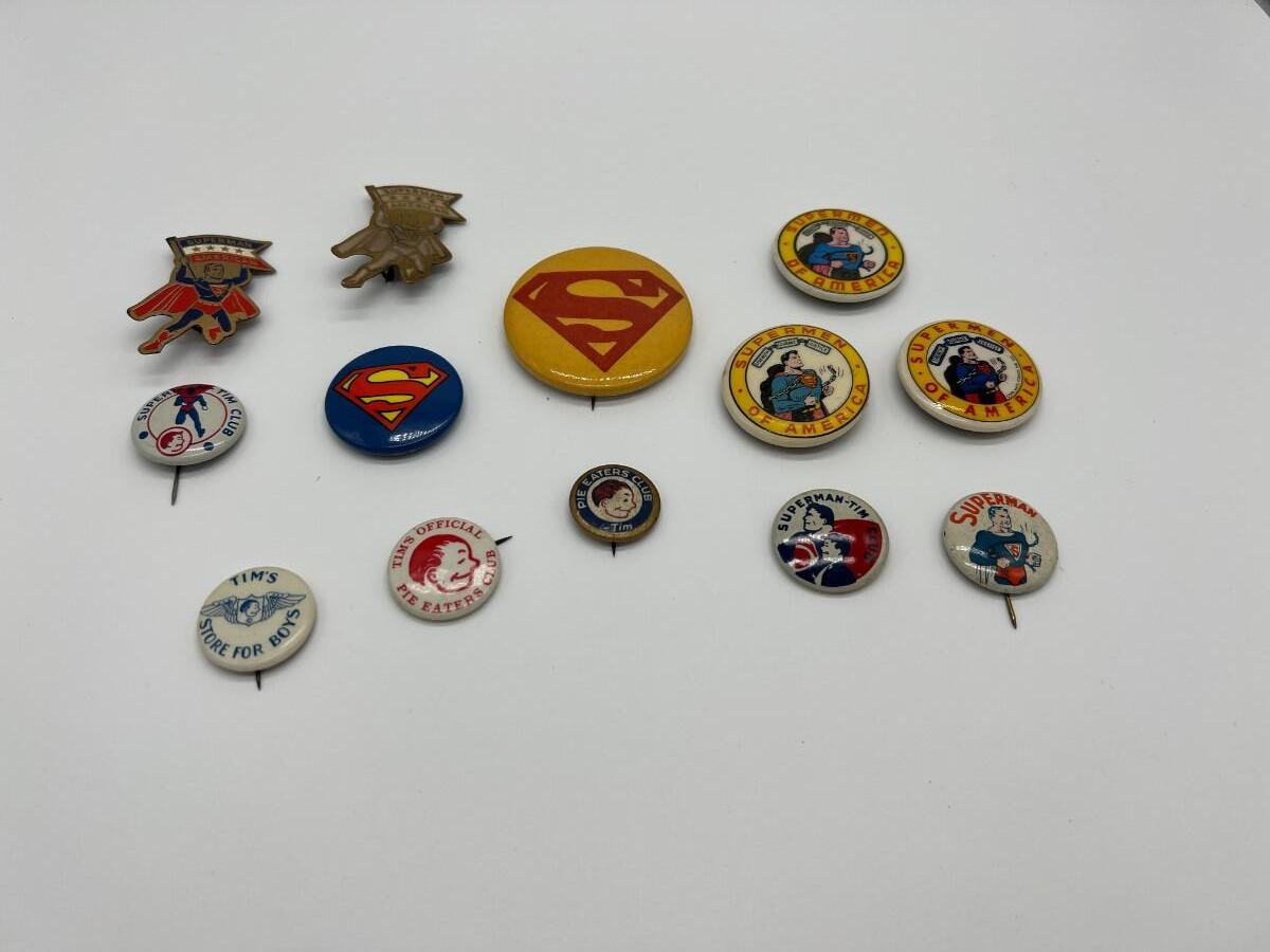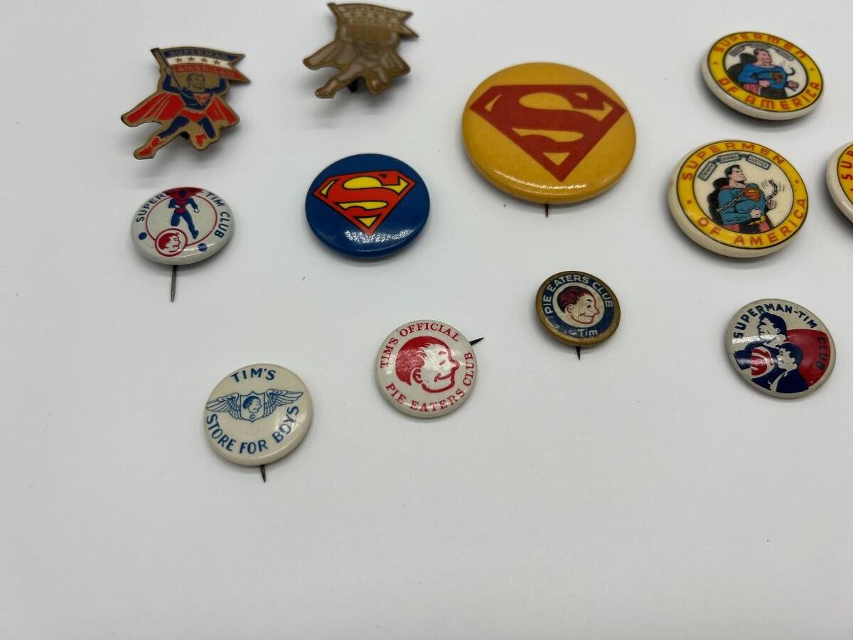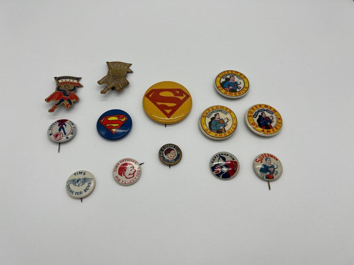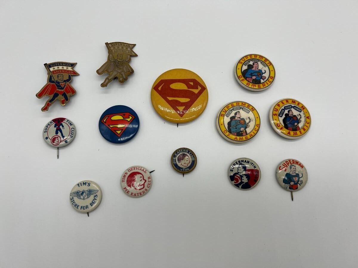 Lot of 13 Antique Superman Buttons and Pins. Lot includes 2 Superman American Pins with pin backs (one in full blue and red color, and the other with no or faded color), yellow superman logo button pin, classic blue and red superman logo button pin, 3 Supermen of America buttons, 5 various Tim's Club buttons, and a button featuring Superman breaking free from chains. Conditions as shown.