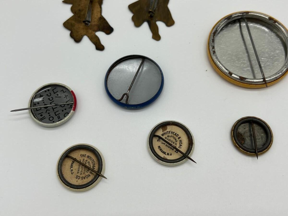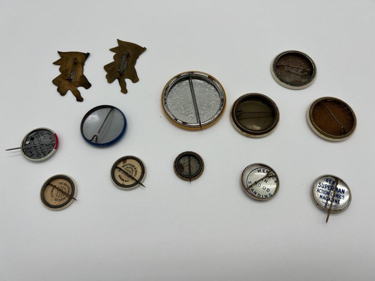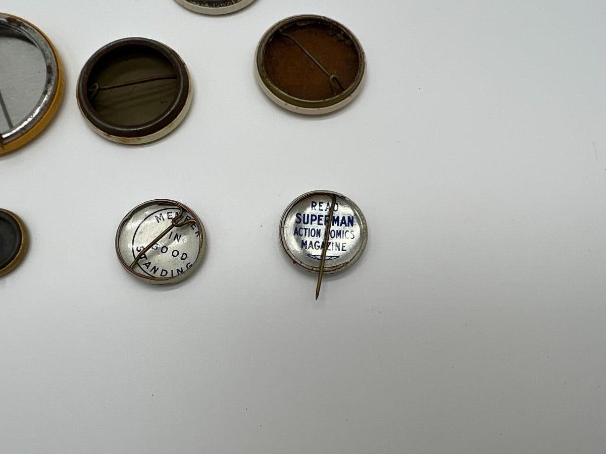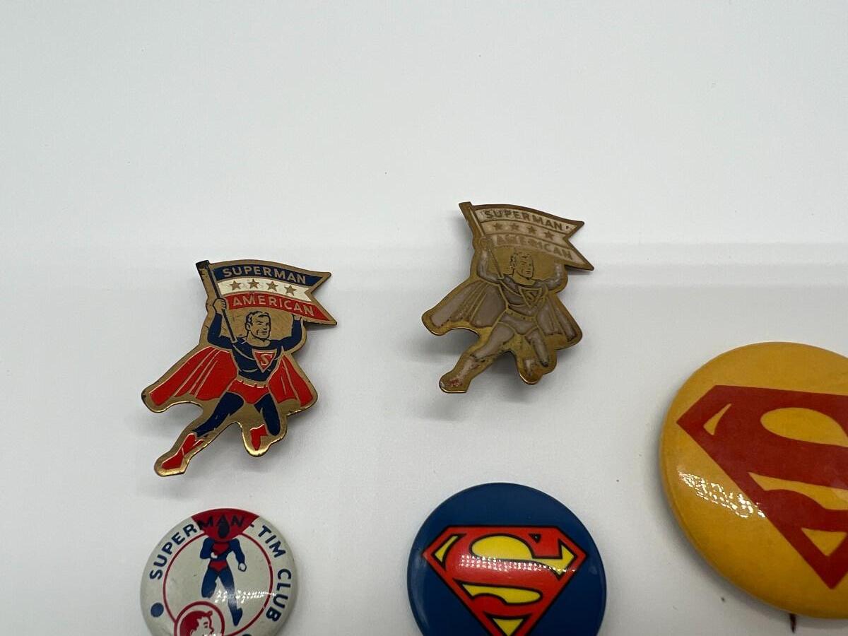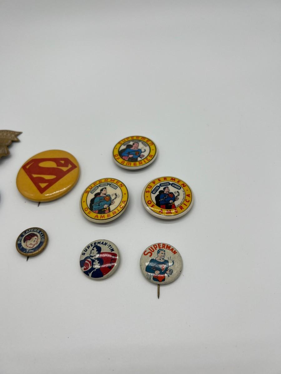 Lot of 13 Antique Superman Buttons and Pins. Lot includes 2 Superman American Pins with pin backs (one in full blue and red color, and the other with no or faded color), yellow superman logo button pin, classic blue and red superman logo button pin, 3 Supermen of America buttons, 5 various Tim's Club buttons, and a button featuring Superman breaking free from chains. Conditions as shown.