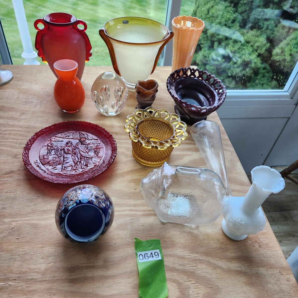Lot of 13 Art Glass, Bowls, Vases, Paperweight, Pig Bank, Fenton, Anchor Hocking, Imperial Glass owl