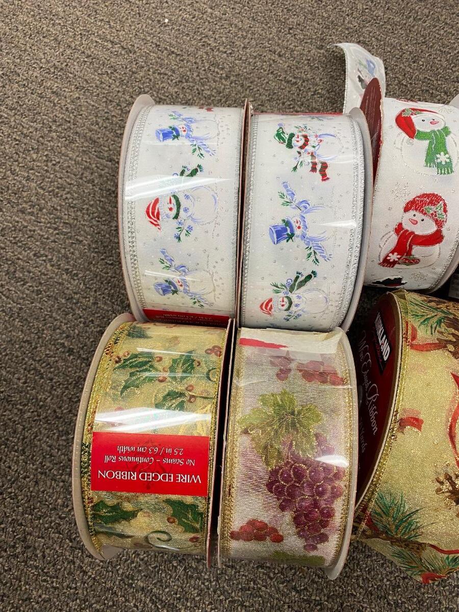 Lot of 14 large spools of wire edge Christmas holiday ribbon. 50 yard spools, either barely used or unopened with plastic still on them. Different patterns.