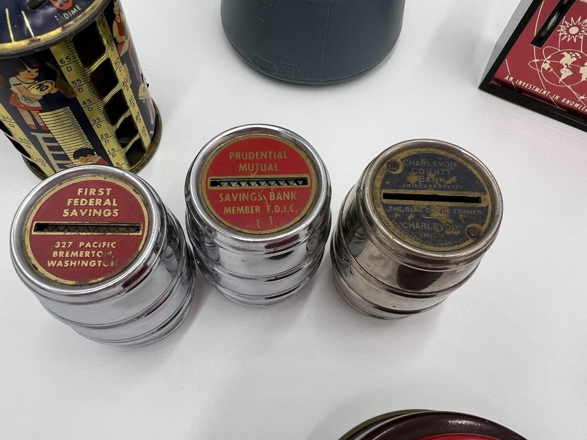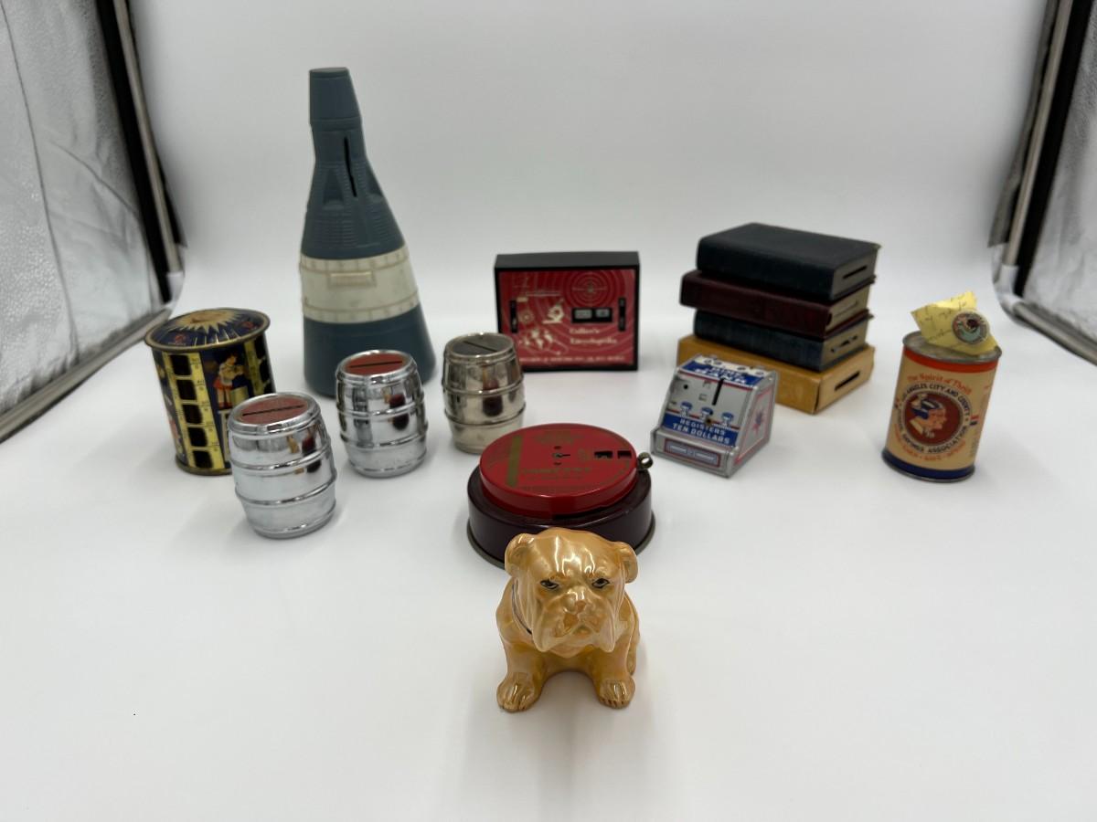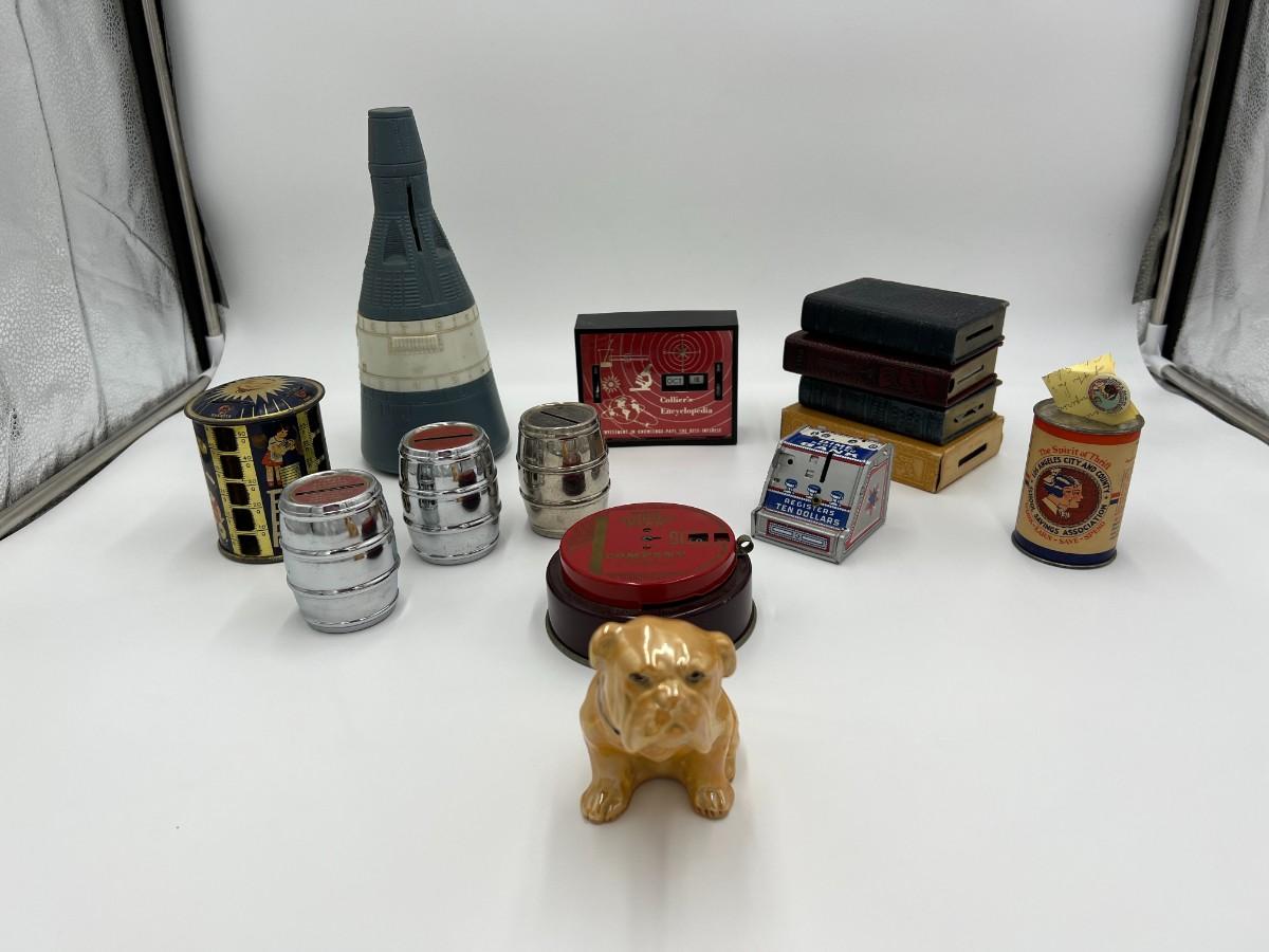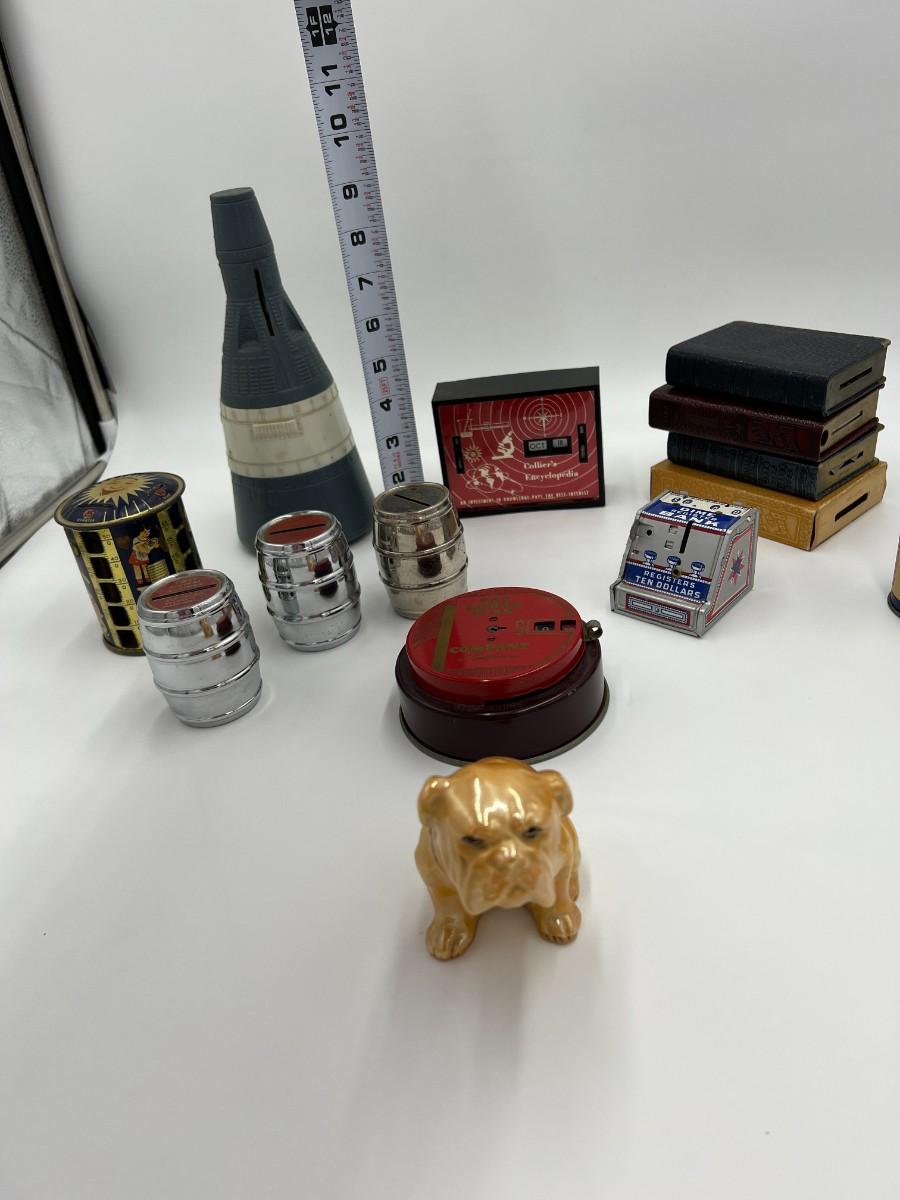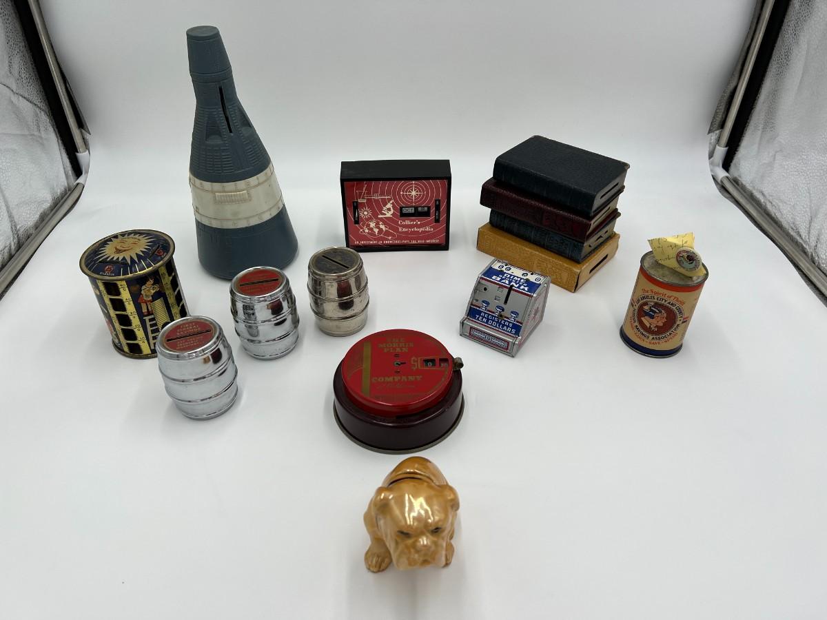Great Lot of 14 Mid Century Coin Banks! Includes Made in Japan glazed bulldog, Morris Plan Company of California, Los Angeles Spirit of Thrift (School Savings Association), First Federal Savings, Prudential Mutual, Charlevoix County Bank. space craft bank, and Collier's encyclopedia. Condition as shown.