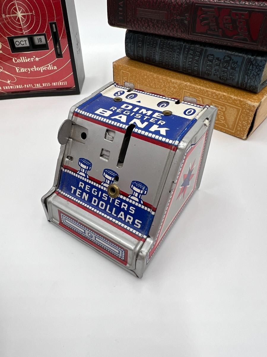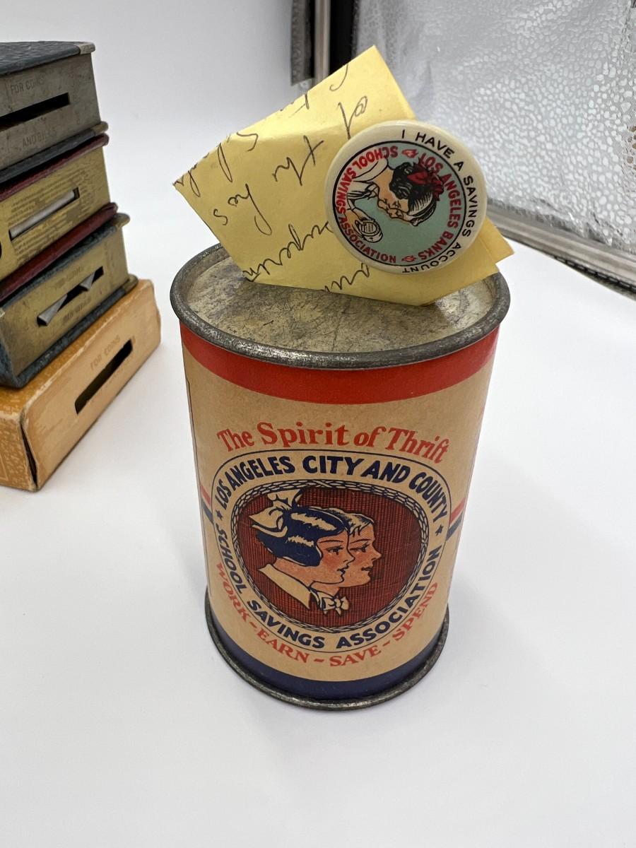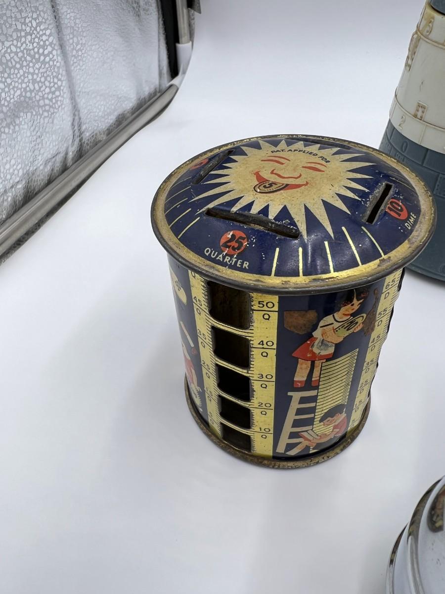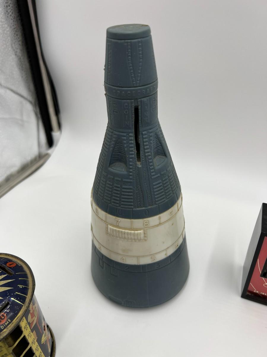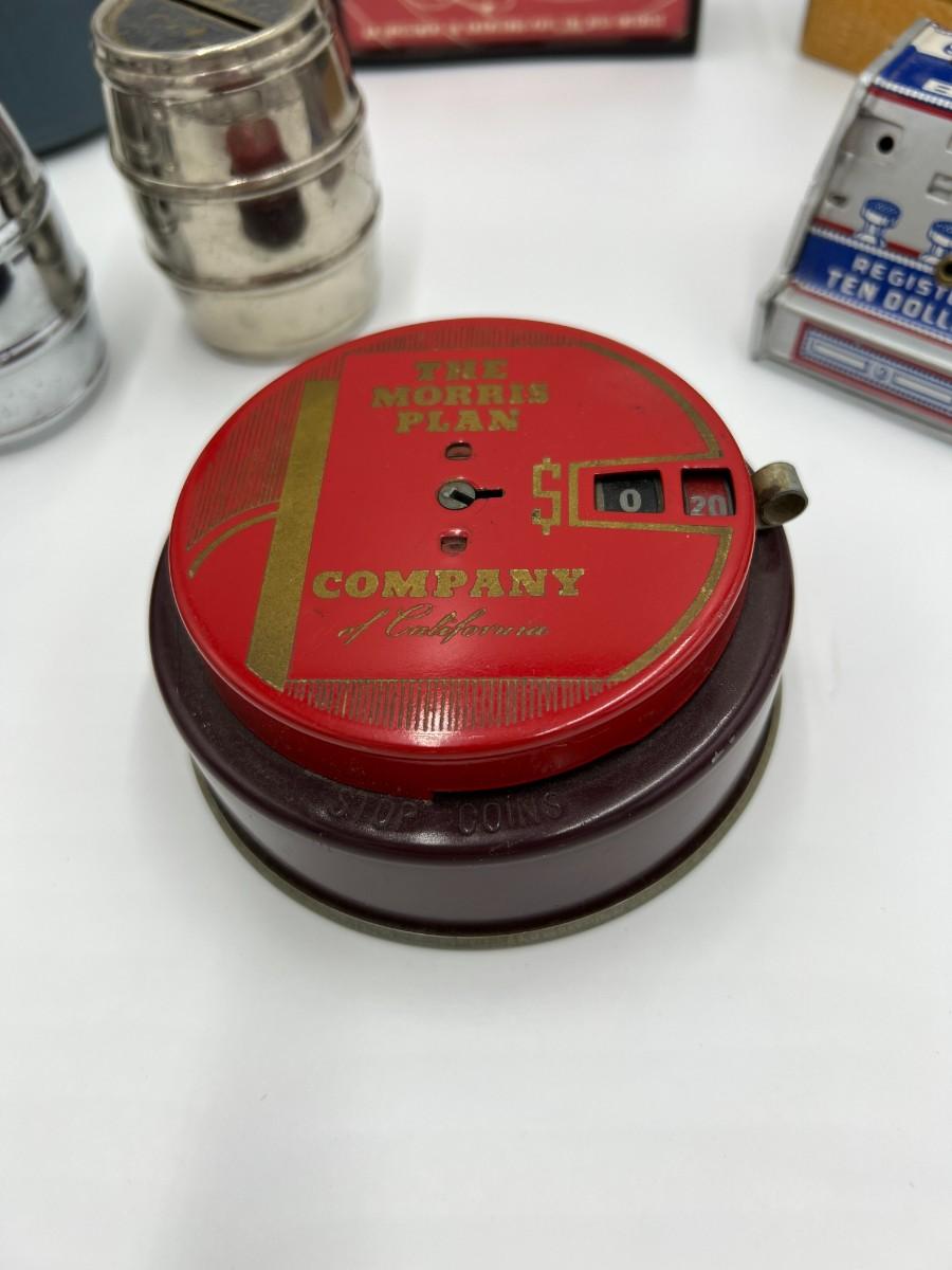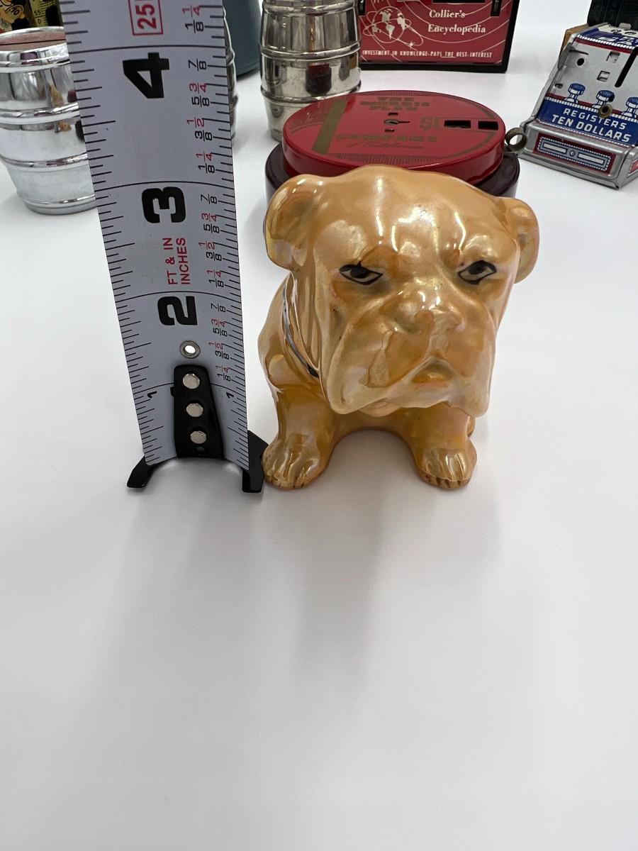 Great Lot of 14 Mid Century Coin Banks! Includes Made in Japan glazed bulldog, Morris Plan Company of California, Los Angeles Spirit of Thrift (School Savings Association), First Federal Savings, Prudential Mutual, Charlevoix County Bank. space craft bank, and Collier's encyclopedia. Condition as shown.