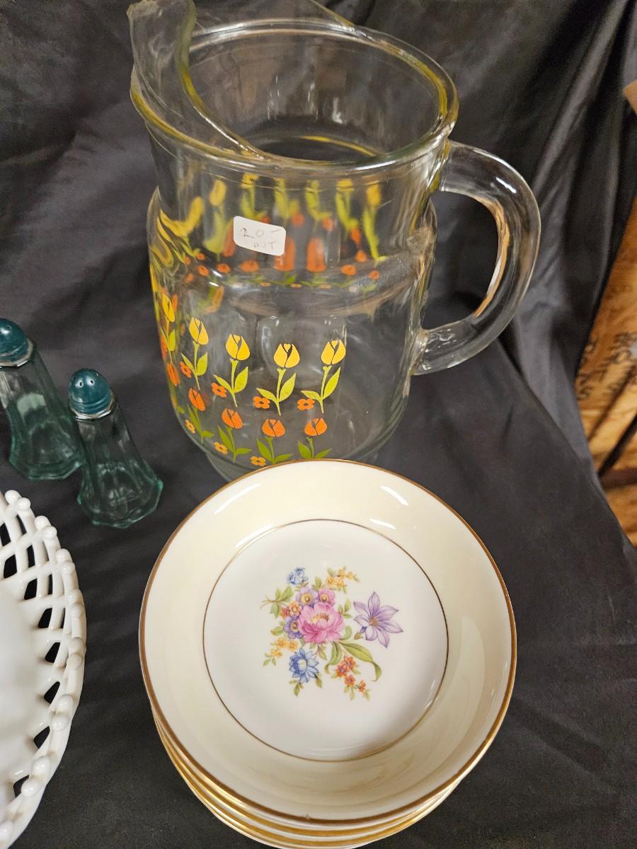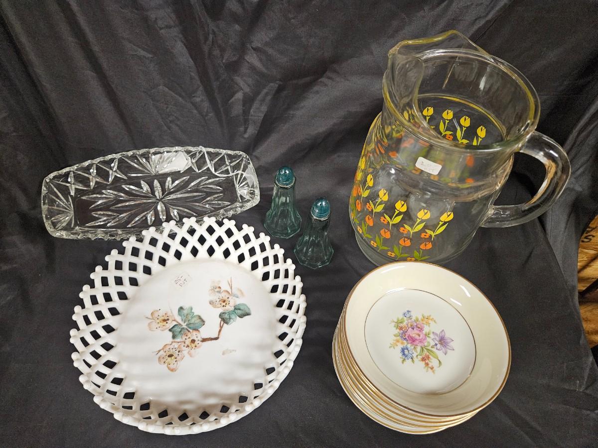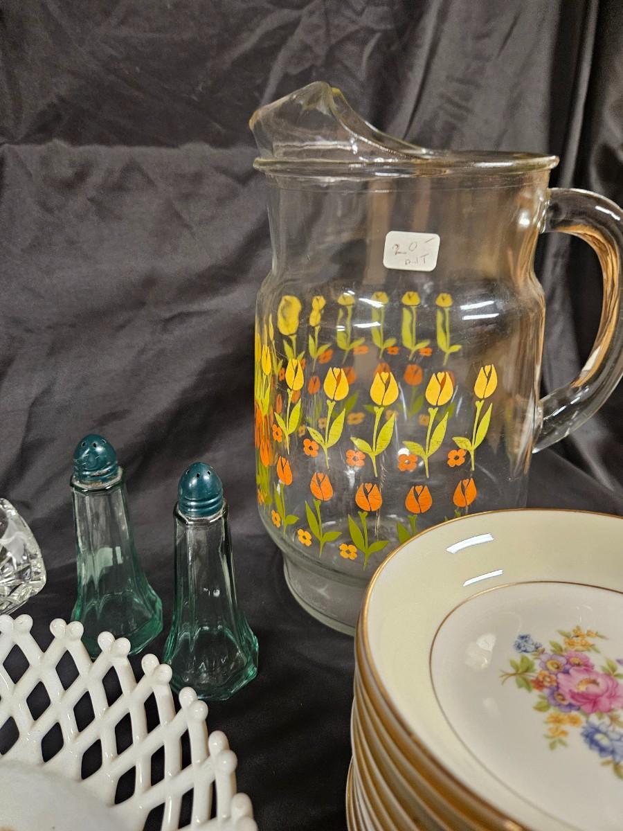 Lot of 14 Misc Kitchen and Decorative Items Including S&P Shakers, Milk Glass Lattice Bowl and MCM Pitcher